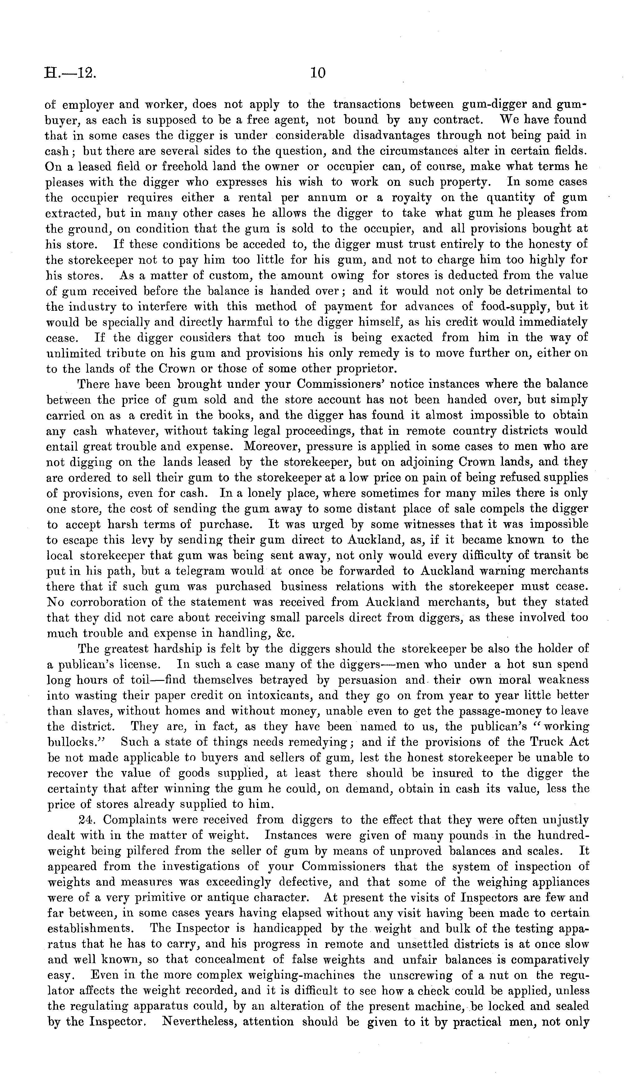 of employer and worker, does not apply to the transactions between gum-digger and gumbuyer, as each is supposed to be a free agent, not bound by any contract. We have found that in some cases the digger is under considerable disadvantages through not being paid in cash; but there are several sides to the question, and the circumstances alter in certain fields. On a leased field or freehold land the owner or occupier can, of course, make what terms he pleases with the digger who expresses his wish to work on such property. In some cases the occupier requires either a rental per annum or a royalty on the quantity of gum extracted, but in many other cases he allows the digger to take what gum he pleases from the ground, on condition that the gum is sold to the occupier, and all provisions bought at his store. If these conditions be acceded to, the digger must trust entirely to the honesty of the storekeeper not to pay him too little for his gum, and not to charge him too highly for his stores. As a matter of custom, the amount owing for stores is deducted from the value of gum received before the balance is handed over; and it would not only be detrimental to the industry to interfere with this method of payment for advances of food-supply, but it would be specially and directly harmful to the digger himself, as his credit would immediately cease. If the digger considers that too much is being exacted from him in the way of unlimited tribute on his gum and provisions his only remedy is to move further on, either on to the lands of the Crown or those of some other proprietor. There have been brought under your Commissioners' notice instances where the balance between the price of gum sold and the store account has not been handed over, but simply carried on as a credit in the books, and the digger has found it almost impossible to obtain any cash whatever, without taking legal proceedings, that in remote country districts would entail great trouble and expense. Moreover, pressure is applied in some cases to men who are not digging on the lands leased by the storekeeper, but on adjoining Crown lands, and they are ordered to sell their gum to the storekeeper at a low price on pain of being refused supplies of provisions, even for cash. In a lonely place, where sometimes for many miles there is only one store, the cost of sending the gum away to some distant place of sale compels the digger to accept harsh terms of purchase. It was urged by some witnesses that it was impossible to escape this levy by sending their gum direct to Auckland, as, if it became known to the local storekeeper that gum was being sent away, not only would every difficulty of transit be put in his path, but a telegram would at once be forwarded to Auckland warning merchants there that if such gum was purchased business relations with the storekeeper must cease. No corroboration of the statement was received from Auckland merchants, but they stated that they did not care about receiving small parcels direct from diggers, as these involved too much trouble and expense in handling, &c. The greatest hardship is felt by the diggers should the storekeeper be also the holder of a publican's license. In such a case many of the diggers-—men who under a hot sun spend long hours of toil—find themselves betrayed by persuasion and their own moral weakness into wasting their paper credit on intoxicants, and they go on from year to year little better than slaves, without homes and without money, unable even to get the passage-money to leave the district. They are, in fact, as they have been named to us, the publican's " working bullocks." Such a state of things needs remedying; and if the provisions of the Truck Act be not made applicable to buyers and sellers of gum, lest the honest storekeeper be unable to recover the value of goods supplied, at least there should be insured to the digger the certainty that after winning the gum he could, on demand, obtain in cash its value, less the price of stores already supplied to him. 24. Complaints were received from diggers to the effect that they were often unjustly dealt with in the matter of weight. Instances were given of many pounds in the hundredweight being pilfered from the seller of gum by means of unproved balances and scales. It appeared from the investigations of your Commissioners that the system of inspection of weights and measures was exceedingly defective, and that some of the weighing appliances were of a very primitive or antique character. At present the visits of Inspectors are few and far between, in some cases years having elapsed without any visit having been made to certain establishments. The Inspector is handicapped by the weight and bulk of the testing apparatus that he has to carry, and his progress in remote and unsettled districts is at once slow and well known, so that concealment of false weights and unfair balances is comparatively easy. Even in the more complex weighing-machines the unscrewing of a nut on the regulator affects the weight recorded, and it is difficult to see how a check coiild be applied, unless the regulating apparatus could, by an alteration of the present machine, be locked and sealed by the Inspector. Nevertheless, attention should be given to it by practical men, not only