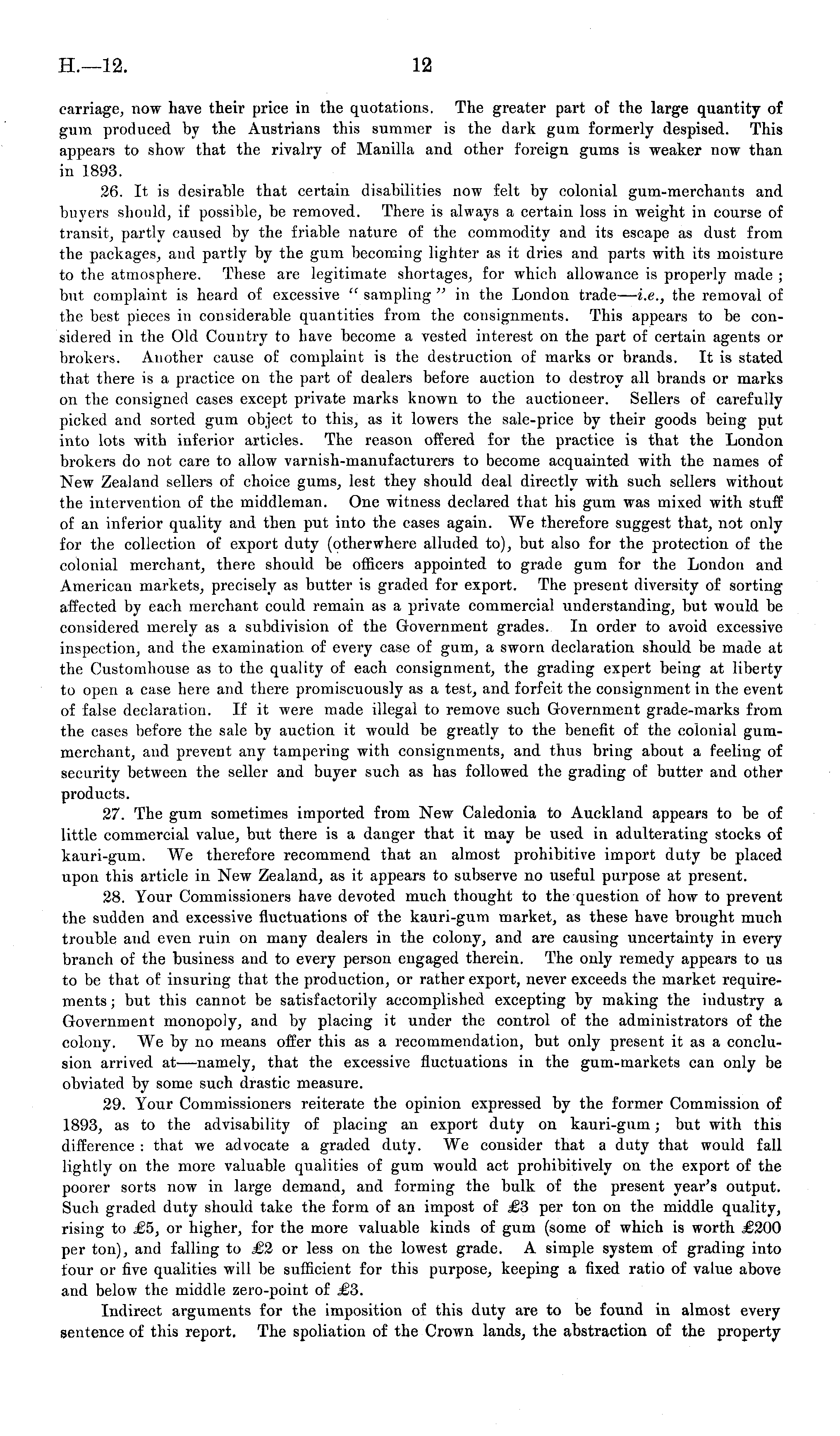 carriage, now have their price in the quotations. The greater part of the large quantity of gum produced by the Austrians this summer is the dark gum formerly despised. This appears to show that the rivalry of Manilla and other foreign gums is weaker now than in 1893. 26. It is desirable that certain disabilities now felt by colonial gum-merchants and buyers should, if possible, be removed. There is always a certain loss in weight in course of transit, partly caused by the friable nature of the commodity and its escape as dust from the packages, and partly by the gum becoming lighter as it dries and parts with its moisture to the atmosphere. These are legitimate shortages, for which allowance is properly made ; but complaint is heard of excessive " sampling " in the London trade— i.e., the removal of the best pieces in considerable quantities from the consignments. This appears to be considered in the Old Country to have become a vested interest on the part of certain agents or brokers. Another cause of complaint is the destruction of marks or brands. It is stated that there is a practice on the part of dealers before auction to destroy all brands or marks on the consigned cases except private marks known to the auctioneer. Sellers of carefully picked and sorted gum object to this, as it lowers the sale-price by their goods being put into lots with inferior articles. The reason offered for the practice is that the London brokers do not care to allow varnish-manufacturers to become acquainted with the names of New Zealand sellers of choice gums, lest they should deal directly with such sellers without the intervention of the middleman. One witness declared that his gum was mixed with stuff of an inferior quality and then put into the cases again. We therefore suggest that, not only for the collection of export duty (otherwhere alluded to), but also for the protection of the colonial merchant, there should be officers appointed to grade gum for the London and American markets, precisely as butter is graded for export. The present diversity of sorting affected by each merchant could remain as a private commercial understanding, but would be considered merely as a subdivision of the Government grades. In order to avoid excessive inspection, and the examination of every case of gum, a sworn declaration should be made at the Customhouse as to the quality of each consignment, the grading expert being at liberty to open a case here and there promiscuously as a test, and forfeit the consignment in the event of false declaration. If it were made illegal to remove such Government grade-marks from the cases before the sale by auction it would be greatly to the benefit of the colonial gummerchant, and prevent any tampering with consignments, and thus bring about a feeling of security between the seller and buyer such as has followed the grading of butter and other products. 27. The gum sometimes imported from New Caledonia to Auckland appears to be of little commercial value, but there is a danger that it may be used in adulterating stocks of kauri-gum. We therefore recommend that an almost prohibitive import duty be placed upon this article in New Zealand, as it appears to subserve no useful purpose at present. 28. Your Commissioners have devoted much thought to the question of how to prevent the sudden and excessive fluctuations of the kauri-gum market, as these have brought much trouble and even ruin on many dealers in the colony, and are causing uncertainty in every branch of the business and to every person engaged therein. The only remedy appears to us to be that of insuring that the production, or rather export, never exceeds the market requirements ; but this cannot be satisfactorily accomplished excepting by making the industry a Government monopoly, and by placing it under the control of the administrators of the colony. We by no means offer this as a recommendation, but only present it as a conclusion arrived at —namely, that the excessive fluctuations in the gum-markets can only be obviated by some such drastic measure. 29. Your Commissioners reiterate the opinion expressed by the former Commission of 1893, as to the advisability of placing an export duty on kauri-gum; but with this difference : that we advocate a graded duty. We consider that a duty that would fall lightly on the more valuable qualities of gum would act prohibitively on the export of the poorer sorts now in large demand, and forming the bulk of the present year's output. Such graded duty should take the form of an impost of £3 per ton on the middle quality, rising to £5, or higher, for the more valuable kinds of gum (some of which is worth £200 per ton), and falling to £2 or less on the lowest grade. A simple system of grading into four or five qualities will be sufficient for this purpose, keeping a fixed ratio of value above and below the middle zero-point of £3. Indirect arguments for the imposition of this duty are to be found in almost every sentence of this report. The spoliation of the Crown lands, the abstraction of the property