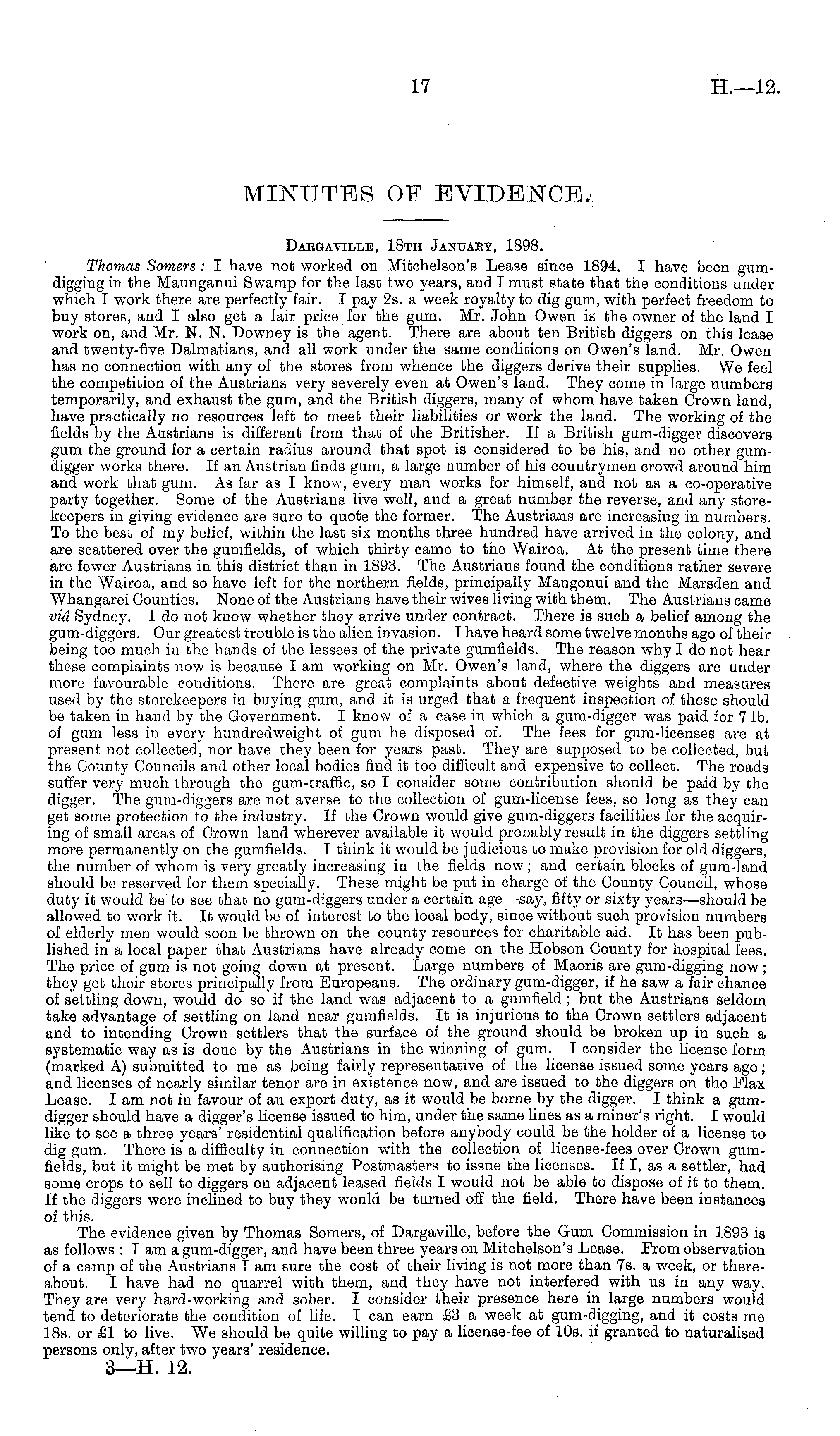 Dabgaville, 18th Januaby, 1898. Thomas Somers: I have not worked on Mitchelson's Lease since 1894. I have been gumdigging in the Maunganui Swamp for the last two years, and I must state that the conditions under which I work there are perfectly fair. I pay 2s. a week royalty to dig gum, with perfect freedom to buy stores, and I also get a fair price for the gum. Mr. John Owen is the owner of the land I work on, and Mr. N. N. Downey is the agent. There are about ten British diggers on this lease and twenty-five Dalmatians, and all work under the same conditions on Owen's land. Mr. Owen has no connection with any of the stores from whence the diggers derive their supplies. We feel the competition of the Austrians very severely even at Owen's land. They come in large numbers temporarily, and exhaust the gum, and the British diggers, many of whom have taken Crown land, have practically no resources left to meet their liabilities or work the land. The working of the fields by the Austrians is different from that of the Britisher. If a British gum-digger discovers gum the ground for a certain radius around that spot is considered to be his, and no other gumdigger works there. If an Austrian finds gum, a large number of his countrymen crowd around him and work that gum. As far as I know, every man works for himself, and not as a co-operative party together. Some of the Austrians live well, and a great number the reverse, and any storekeepers in giving evidence are sure to quote the former. The Austrians are increasing in numbers. To the best of my belief, within the last six months three hundred have arrived in the colony, and are scattered over the gumfields, of which thirty came to the Wairoa. At the present time there are fewer Austrians in this district than in 1893. The Austrians found the conditions rather severe in the Wairoa, and so have left for the northern fields, principally Mangonui and the Marsden and Whangarei Counties. None of the Austrians have their wives living with them. The Austrians came via Sydney. Ido not know whether they arrive under contract. There is such a belief among the gum-diggers. Our greatest trouble is the alien invasion. I have heard some twelve months ago of their being too much in the hands of the lessees of the private gumfields. The reason why Ido not hear these complaints now is because I am working on Mr. Owen's land, where the diggers are under more favourable conditions. There are great complaints about defective weights and measures used by the storekeepers in buying gum, and it is urged that a frequent inspection of these should be taken in hand by the Government. I know of a case in which a gum-digger was paid for 7 lb. of gum less in every hundredweight of gum he disposed of. The fees for gum-licenses are at present not collected, nor have they been for years past. They are supposed to be collected, but the County Councils and other local bodies find it too difficult and expensive to collect. The roads suffer very much through the gum-traffic, so I consider some contribution should be paid by the digger. The gum-diggers are not averse to the collection of gum-license fees, so long as they can get some protection to the industry. If the Crown would give gum-diggers facilities for the acquiring of small areas of Crown land wherever available it would probably result in the diggers settling more permanently on the gumfields. I think it would be judicious to make provision for old diggers, the number of whom is very greatly increasing in the fields now ; and certain blocks of gum-land should be reserved for them specially. These might be put in charge of the County Council, whose duty it would be to see that no gum-diggers under a certain age—say, fifty or sixty years—should be allowed to work it. It would be of interest to the local body, since without such provision numbers of elderly men would soon be thrown on the county resources for charitable aid. It has been published in a local paper that Austrians have already come on the Hobson County for hospital fees. The price of gum is not going down at present. Large numbers of Maoris are gum-digging now; they get their stores principally from Europeans. The ordinary gum-digger, if he saw a fair chance of settling down, would do so if the land was adjacent to a gumfield ; but the Austrians seldom take advantage of settling on land near gumfields. It is injurious to the Crown settlers adjacent and to intending Crown settlers that the surface of the ground should be broken up in such a systematic way as is done by the Austrians in the winning of gum. I consider the license form (marked A) submitted to me as being fairly representative of the license issued some years ago; and licenses of nearly similar tenor are in existence now, and are issued to the diggers on the Flax Lease. lam not in favour of an export duty, as it would be borne by the digger. I think a gumdigger should have a digger's license issued to him, under the same lines as a miner's right. I would like to see a three years' residential qualification before anybody could be the holder of a license to dig gum. There is a difficulty in connection with the collection of license-fees over Crown gumfields, but it might be met by authorising Postmasters to issue the licenses. If I, as a settler, had some crops to sell to diggers on adjacent leased fields I would not be able to dispose of it to them. If the diggers were inclined to buy they would be turned off the field. There have been instances of this. The evidence given by Thomas Somers, of Dargaville, before the Gum Commission in 1893 is as follows :lam a gum-digger, and have been three years on Mitchelson's Lease. From observation of a camp of the Austrians I am sure the cost of their living is not more than 7s. a week, or thereabout. I have had no quarrel with them, and they have not interfered with us in any way. They are very hard-working and sober. I consider their presence here in 