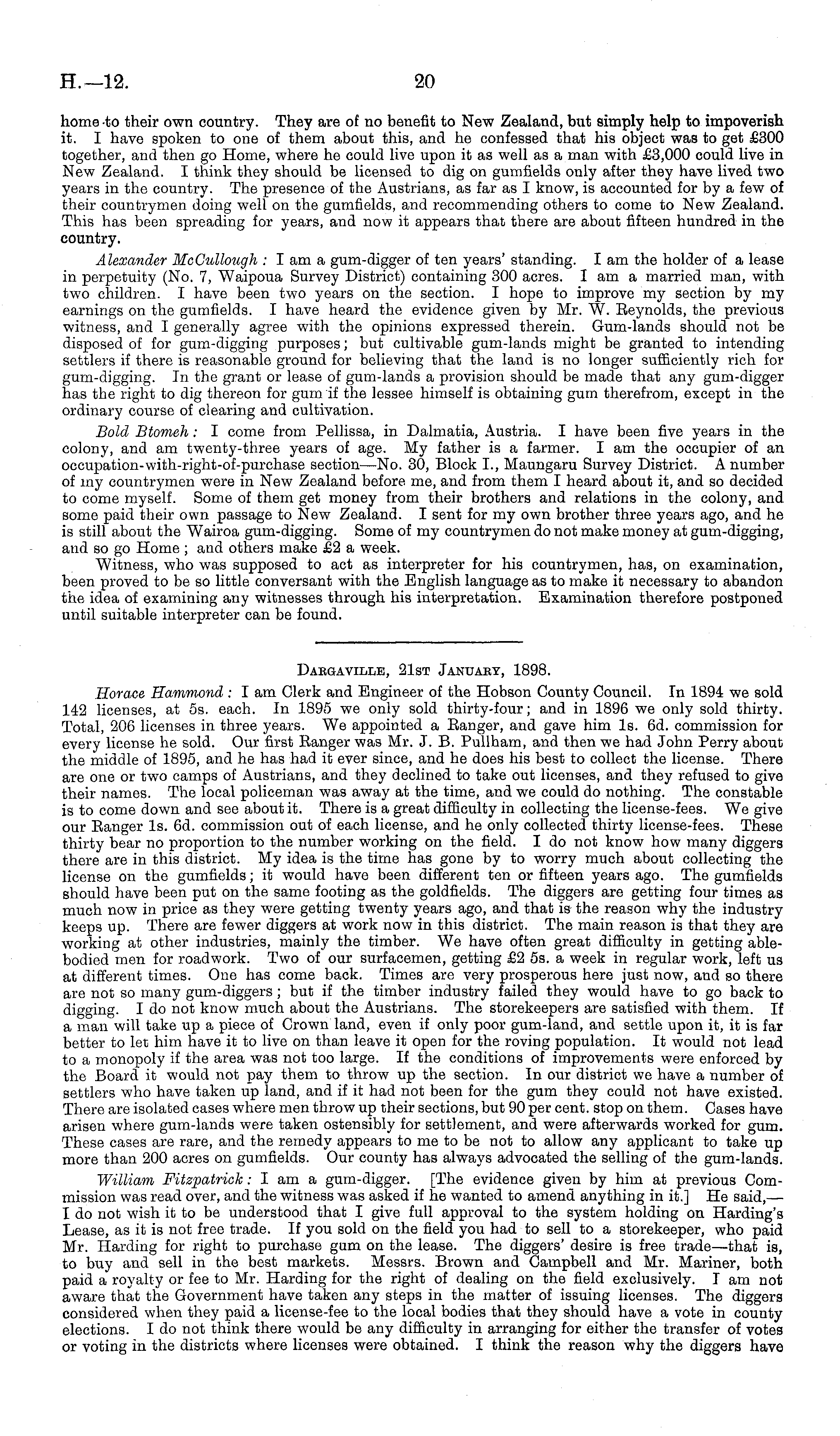 Daegaville, 21st January, 1898. Horace Hammond : lam Clerk and Engineer of the Hobson County Council. In 1894 we sold 142 licenses, at ss. each. In 1895 we only sold thirty-four; and in 1896 we only sold thirty. Total, 206 licenses in three years. We appointed a Eanger, and gave him Is. 6d. commission for every license he sold. Our first Banger was Mr. J. B. Pullham, and then we had John Perry about the middle of 1895, and he has had it ever since, and he does his best to collect the license. There are one or two camps of Austrians, and they declined to take out licenses, and they refused to give their names. The local policeman was away at the time, and we could do nothing. The constable is to come down and see about it. There is a great difficulty in collecting the license-fees. We give our Eanger Is. 6d. commission out of each license, and he only collected thirty license-fees. These thirty bear no proportion to the number working on the field. Ido not know how many diggers there are in this district. My idea is the time has gone by to worry much about collecting the license on the gumfields; it would have been different ten or fifteen years ago. The gumfields should have been put on the same footing as the goldfields. The diggers are getting four times as much now in price as they were getting twenty years ago, and that is the reason why the industry keeps up. There are fewer diggers at work now in this district. The main reason is that they are working at other industries, mainly the timber. We have often great difficulty in getting ablebodied men for roadwork. Two of our surfacemen, getting £2 ss. a week in regular work, left us at different times. One has come back. Times are very prosperous here just now, and so there are not so many gum-diggers; but if the timber industry failed they would have to go back to digging. Ido not know much about the Austrians. The storekeepers are satisfied with them. If a man will take up a piece of Crown land, even if only poor gum-land, and settle upon it, it is far better to let him have it to live on than leave it open for the roving population. It would not lead to a monopoly if the area was not too large. If the conditions of improvements were enforced by the Board it would not pay them to throw up the section. In our district we have a number of settlers who have taken up land, and if it had not been for the gum they could not have existed. There are isolated cases where men throw up their sections, but 90 per cent, stop on them. Cases have arisen where gum-lands were taken ostensibly for settlement, and were afterwards worked for gum. These cases are rare, and the remedy appears to me to be not to allow any applicant to take up more than 200 acres on gumfields. Our county has always advocated the selling of the gum-lands. William Fitzpatrick: lam a gum-digger. [The evidence given by him at previous Commission was read over, and the witness was asked if he wanted to amend anything in it.] He said, — I do not wish it to be understood that I give full approval to the system holding on Harding's Lease, as it is not free trade. If you sold on the field you had to sell to a storekeeper, who paid Mr. Harding for right to purchase gum on the lease. The diggers' desire is free trade—that is, to buy and sell in the best markets. Messrs. Brown and Campbell and Mr. Mariner, both paid a royalty or fee to Mr. Harding for the right of dealing on the field exclusively. I am not aware that the Government have taken any steps in the matter of issuing licenses. The diggers considered when they paid a license-fee to the local bodies that they should have a vote in county elections. Ido not think there would be any difficulty in arranging for either the transfer of votes or voting in the districts where licenses were obtained. I think the reason why the diggers have