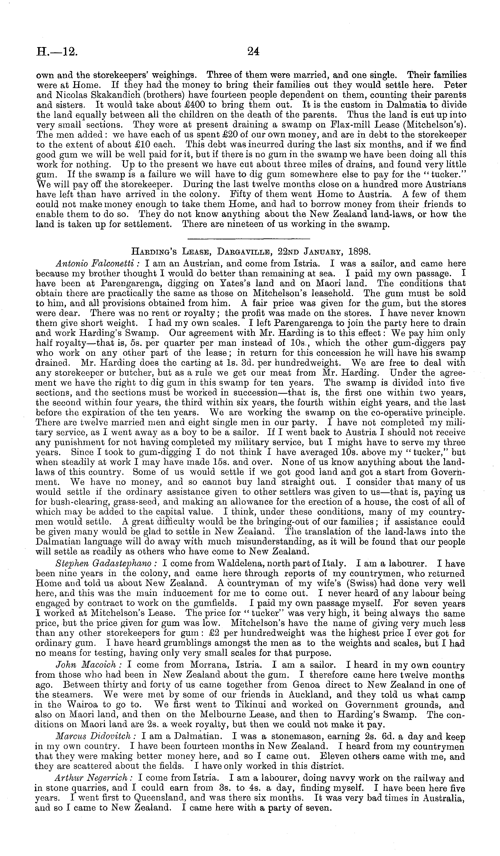 Haeding's Lease, Dabgaville, 22nd Januaby, 1898. Antonio Falconetti : lam an Austrian, and come from Istria. I was a sailor, and came here because my brother thought I would do better than remaining at sea. I paid my own passage. I have been at Parengarenga, digging on Yates's land and on Maori land. The conditions that obtain there are practically the same as those on Mitchelson's leasehold. The gum must be sold to him, and all provisions obtained from him. A fair price was given for the gum, but the stores were dear. There was no rent or royalty ; the profit was made on the stores. I have never known them give short weight. I had my own scales. I left Parengarenga to join the party here to drain and work Harding's Swamp. Our agreement with Mr. Harding is to this effect: We pay him only half royalty—that is, ss. per quarter per man instead of 10s., which the other gum-diggers pay who work on any other part of the lease; in return for this concession he will have his swamp drained. Mr. Harding does the carting at Is. 3d. per hundredweight. We are free to deal with any storekeeper or butcher, but as a rule we get our meat from Mr. Harding. Under the agreement we have the right to dig gum in this swamp for ten years. The swamp is divided into five sections, and the sections must be worked in succession—that is, the first one within two years, the second within four years, the third within six years, the fourth within eight years, and the last before the expiration of the ten years. We are working the swamp on the co-operative principle. There are twelve married men and eight single men in our party. I have not completed my military service, as I went away as a boy to be a sailor. If I went back to Austria I should not receive any punishment for not having completed my military service, but I might have to serve my three years. Since I took to gum-digging Ido not think I have averaged 10s. above my " tucker," but when steadily at work I may have made 15s. and over. None of us know anything about the landlaws of this country. Some of us would settle if we got good land and got a start from Government. We have no money, and so cannot buy land straight out. I consider that many of us would settle if the ordinary assistance given to other settlers was given to vs —that is, paying us for bush-clearing, grass-seed, and making an allowance for the erection of a house, the cost of all of which may be added to the capital value. I think, under these conditions, many of my countrymen would settle. A great difficulty would be the bringing-out of our families; if assistance could be given many would be glad to settle in New Zealand. The translation of the land-laws into the Dalmatian language will do away with much misunderstanding, as it will be found that our people will settle as readily as others who have come to New Zealand. Stephen Gadastephano : I come from Waldelena, north part of Italy. lam a labourer. I have been nine years in the colony, and came here through reports of my countrymen, who returned Home and told us about New Zealand. A countryman of my wife's (Swiss) had done very well here, and this was the main inducement for me to come out. I never heard of any labour being engaged by contract to work on the gumfields. I paid my own passage myself. For seven years I worked at Mitchelson's Lease. The price for " tucker" was very high, it being always the same price, but the price given for gum was low. Mitchelson's have the name of giving very much less than any other storekeepers for gum : £2 per hundredweight was the highest price I ever got for ordinary gum. I have heard grumblings amongst the men as to the weights and scales, but I had no means for testing, having only very small scales for that purpose. John Macoich : I come from Morrana, Istria. I am a sailor. I heard in my own country from those who had been in New Zealand about the gum. I therefore came here twelve months ago. Between thirty and forty of us came together from Genoa direct to New Zealand in one of the steamers. We were met by some of our friends in Auckland, and they told us what camp in the Wairoa to go to. We first went to Tikinui and worked on Government grounds, and also on Maori land, and then on the Melbourne Lease, and then to Harding's Swamp. The conditions on Maori land are 2s. a week royalty, but then we could not make it pay. Marcus Didovitch : lam a Dalmatian. I was a stonemason, earning 2s. 6d. a day and keep in my own country. I have been fourteen months in New Zealand. I heard from my countrymen that they were making better money here, and so I came out. Eleven others came with me, and they are scattered about the fields. I have only worked in this district. Arthur Negerrich : I come from Istria. lam a labourer, doing navvy work on the railway and in stone quarries, and I could earn from 3s. to 4s. a day, finding myself. I have been here five years. I went first to Queensland, and was there six months. It was very bad times in Australia, and so I came to New Zealand. I came here with a party of seven.