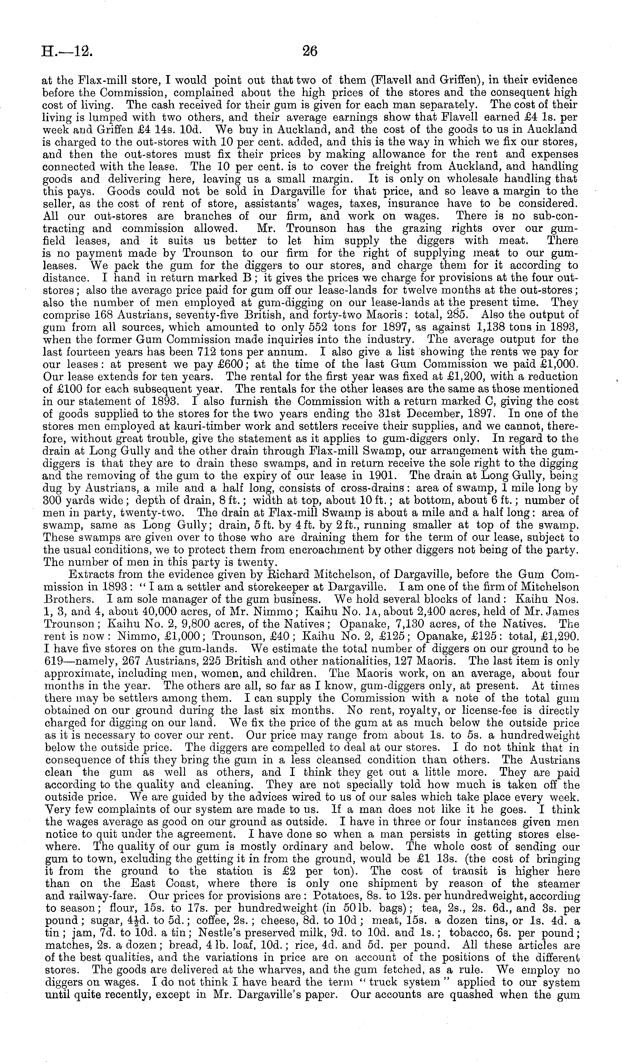 at the Flax-mill store, I would point out that two of them (Flavell and Griffen), in their evidence before the Commission, complained about the high prices of the stores and the consequent high cost of living. The cash received for their gum is given for each man separately. The cost of their living is lumped with two others, and their average earnings show that Flavell earned £4 Is. per week and Griffen £4 14s. lOd. We buy in Auckland, and the cost of the goods to us in Auckland is charged to the out-stores with 10 per cent, added, and this is the way in which we fix our stores, and then the out-stores must fix their prices by making allowance for the rent and expenses connected with the lease. The 10 per cent, is to cover the freight from Auckland, and handling goods and delivering here, leaving us a small margin. It is only on wholesale handling that this pays. Goods could not be sold in Dargaville for that price, and so leave a margin to the seller, as the cost of rent of store, assistants' wages, taxes, insurance have to be considered. All our out-stores are branches of our firm, and work on wages. There is no sub-con-tracting and commission allowed. Mr. Trounson has the grazing rights over our gumfield leases, and it suits us better to let him supply the diggers with meat. There is no payment made by Trounson to our firm for the right of supplying meat to our gumleases. We pack the gum for the diggers to our stores, and charge them for it according to distance. I hand in return marked B ; it gives the prices we charge for provisions at the four outstores ; also the average price paid for gum off our lease-lands for twelve months at the out-stores; also the number of men employed at gum-digging on our lease-lands at the present time. They comprise 168 Austrians, seventy-five British, and forty-two Maoris: total, 285. Also the output of gum from all sources, which amounted to only 552 tons for 1897, as against 1,138 tons in 1893, when the former Gum Commission made inquiries into the industry. The average output for the last fourteen years has been 712 tons per annum. I also give a list showing the rents we pay for our leases: at present we pay £600; at the time of the last Gum Commission we paid £1,000. Our lease extends for ten years. The rental for the first year was fixed at £1,200, with a reduction of £100 for each subsequent year. The rentals for the other leases are the same as those mentioned in our statement of 1893. I also furnish the Commission with a return marked C, giving the cost of goods supplied to the stores for the two years ending the 31st December, 1897. In one of the stores men employed at kauri-timber work and settlers receive their supplies, and we cannot, therefore, without great trouble, give the statement as it applies to gum-diggers only. In regard to the drain at Long Gully and the other drain through Flax-mill Swamp, our arrangement with the gumdiggers is that they are to drain these swamps, and in return receive the sole right to the digging and the removing of the gum to the expiry of our lease in 1901. The drain at Long Gully, being dug by Austrians, a mile and a half long, consists of cross-drains: area of swamp, 1 mile long by 300 yards wide ; depth of drain, 8 ft.; width at top, about 10 ft.; at bottom, about 6 ft.; number of men in party, twenty-two. The drain at Flax-mill Swamp is about a mile and a half long : area of swamp, same as Long Gully; drain, sft. by 4ft. by 2ft., running smaller at top of the swamp. These swamps are given over to those who are draining them for the term of our lease, subject to the usual conditions, we to protect them from encroachment by other diggers not being of the party. The number of men in this party is twenty. Extracts from the evidence given by Eichard Mitchelson, of Dargaville, before the Gum Commission in 1893 :"lam a settler and storekeeper at Dargaville. lam one of the firm of Mitchelson Brothers. lam sole manager of the gum business. We hold several blocks of land : Kaihu Nos. 1, 3, and 4, about 40,000 acres, of Mr. Nimmo; Kaihu No. la, about 2,400 acres, held of Mr. James Trounson; Kaihu No. 2, 9,800 acres, of the Natives; Opanake, 7,130 acres, of the Natives. The rent is now : Nimmo, £1,000; Trounson, £40 ; Kaihu No. 2, £125; Opanake, £125 : total, £1,290. I have five stores on the gum-lands. We estimate the total number of diggers on our ground to be 619—namely, 267 Austrians, 225 British and other nationalities, 127 Maoris. The last item is only approximate, including men, women, and children. The Maoris work, on an average, about four months in the year. The others are all, so far as I know, gum-diggers only, at present. At times there may be settlers among them. I can supply the Commission with a note of the. total gum obtained on our ground during the last six months. No rent, royalty, or license-fee is directly charged for digging on our land. We fix the price of the gum at as much below the outside price as it is necessary to cover our rent. Our price may range from about Is. to ss. a hundredweight below the outside price. The diggers are compelled to deal at our stores. I do not think that in consequence of this they bring the gum in a less cleansed condition than others. The Austrians clean the gum as well as others, and I think they get out a little more. They are paid according to the quality and cleaning. They are not specially told how much is taken off the outside price. We are guided by the advices wired to us of our sales which take place every week. Very few complaints of our system are made to us. If a man does not like it he goes. I think the wages average as good on our ground as outside. I have in three or four instances given men notice to quit under the agreement. I have done so when a man persists in getting stores elsewhere. The quality of our gum is mostly ordinary and below. The whole cost of sending our gum to town, excluding the getting it in from the ground, wo