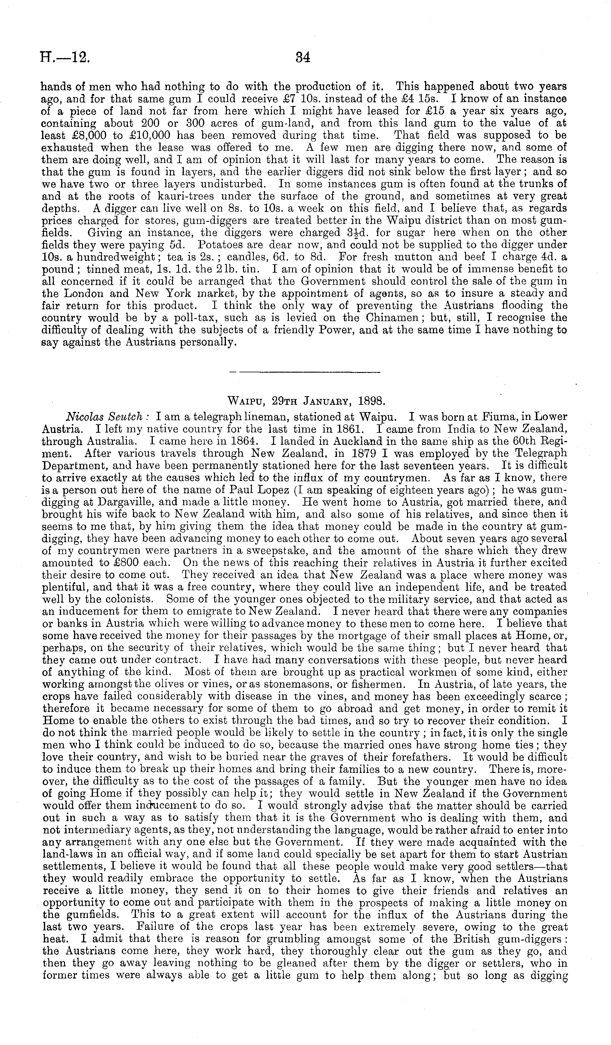 Waipu, 29th January, 1898. Nicolas Scutch : lam a telegraph lineman, stationed at Waipu. I was born at Fiuma, in Lower Austria. I left my native country for the last time in 1861. I came from India to New Zealand, through Australia. I came here in 1864. I landed in Auckland in the same ship as the 60th Regiment. After various travels through New Zealand, in 1879 I was employed by the Telegraph Department, and have been permanently stationed here for the last seventeen years. It is difficult to arrive exactly at the causes which led to the influx of my countrymen. As far as I know, there is a person out here of the name of Paul Lopez (I am speaking of eighteen years ago); he was gumdigging at Dargaville, and made a little money. He went home to Austria, got married there, and brought his wife back to New Zealand with him, and also some of his relatives, and since then it seems to me that, by him giving them the idea that money could be made in the country at gumdigging, they have been advancing money to each other to come out. About seven years ago several of my countrymen were partners in a sweepstake, and the amount of the share which they drew amounted to £800 each. On the news of this reaching their relatives in Austria it further excited their desire to come out. They received an idea that New Zealand was a place where money was plentiful, and that it was a free country, where they could live an independent life, and be treated well by the colonists. Some of the younger ones objected to the military service, and that acted as an inducement for them to emigrate to New Zealand. I never heard that there were any companies or banks in Austria which were willing to advance money to these men to come here. I believe that some have received the money for their passages by the mortgage of their small places at Home, or, perhaps, on the security of their relatives, which would be the same thing; but I never heard that they came out under contract. I have had many conversations with these people, but never heard of anything of the kind. Most of them are brought up as practical workmen of some kind, either working amongst the olives or vines, or as stonemasons, or fishermen. In Austria, of late years, the crops have failed considerably with disease in the vines, and money has been exceedingly scarce ; therefore it became necessary for some of them to go abroad and get money, in order to remit it Home to enable the others to exist through the bad times, and so try to recover their condition. I do not think the married people would be likely to settle in the country ; in fact, it is only the single men who I think could be induced to do so, because the married ones have strong home ties; they love their country, and wish to be buried near the graves of their forefathers. It would be difficult to induce them to break up their homes and bring their families to a new country. There is, moreover, the difficulty as to the cost of the passages of a family. But the younger men have no idea of going Home if they possibly can help it; they would settle in New Zealand if the Government would offer them inducement to do so. I would strongly advise that the matter should be carried out in such a way as to satisfy them that it is the Government who is dealing with them, and not intermediary agents, as they, not understanding the language, would be rather afraid to enter into any arrangement with any one else but the Government. If they were made acquainted with the land-laws in an official way, and if some land could specially be set apart for them to start Austrian settlements, I believe it would be found that all these people would make very good settlers —that they would readily embrace the opportunity to settle. As far as I know, when the Austrians receive a little money, they send it on to their homes to give their friends and relatives an opportunity to come out and participate with them in the prospects of making a little money on the gumfields. This to a great extent will account for the influx of the Austrians during the last two years. Failure of the crops last year has been extremely severe, owing to the great heat. I admit that there is reason for grumbling amongst some of the British gum-diggers : the Austrians come here, they work hard, they thoroughly clear out the gum as they go, and then they go away leaving nothing to be gleaned after them by the digger or settlers, who in former times were always able to get a little gum to help them along; but so long as digging
