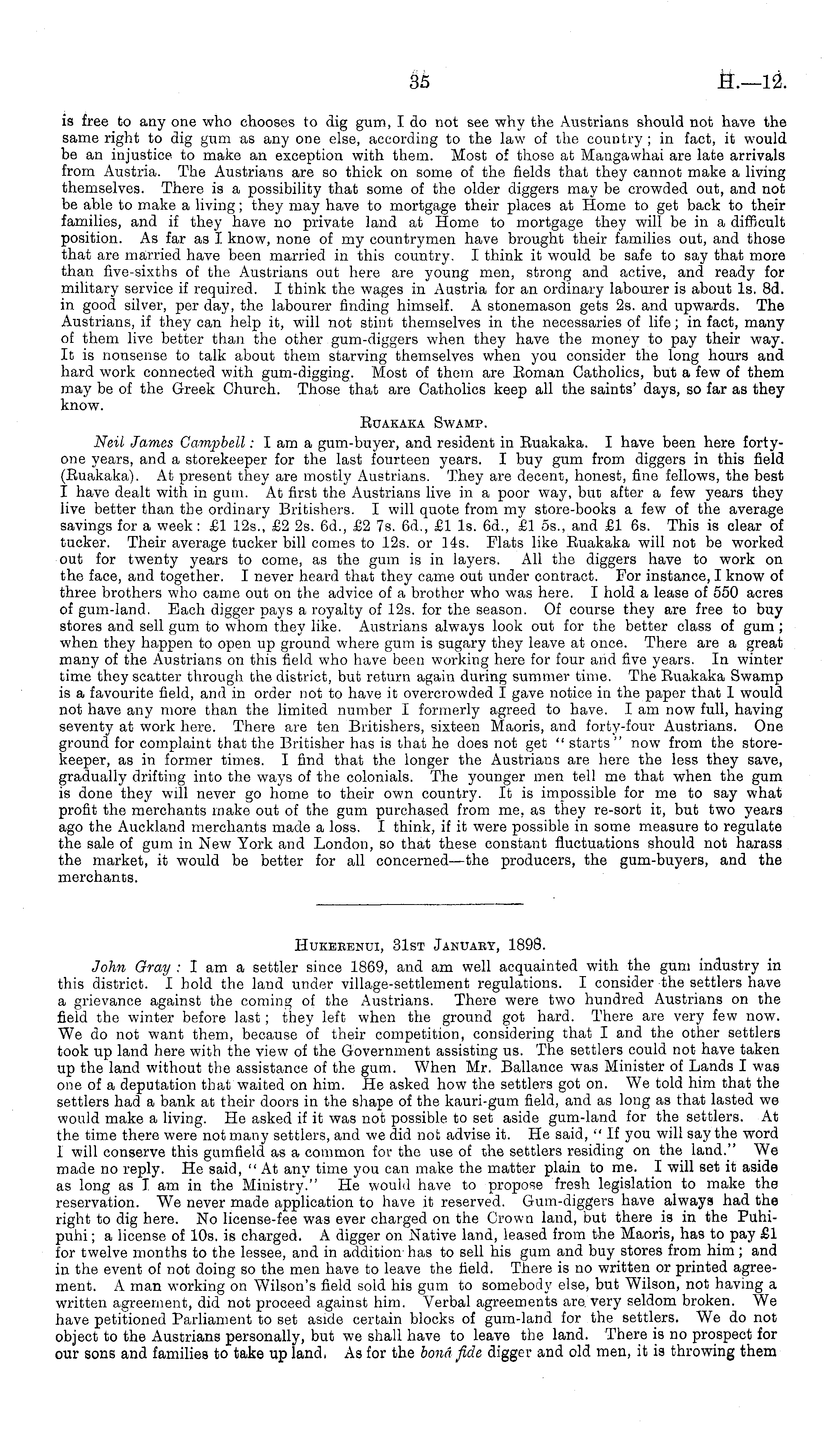 Hukebenui, 31st January, 1898. John Gray : I am a settler since 1869, and am well acquainted with the gum industry in this district. I hold the land under village-settlement regulations. I consider the settlers have a grievance against the coming of the Austrians. There were two hundred Austrians on the field the winter before last ; they left when the ground got hard. There are very few now. We do not want them, because of their competition, considering that I and the other settlers took up land here with the view of the Government assisting us. The settlers could not have taken up the land without the assistance of the gum. When Mr. Ballance was Minister of Lands I was one of a deputation that waited on him. He asked how the settlers got on. We told him that the settlers had a bank at their doors in the shape of the kauri-gum field, and as long as that lasted we would make a living. He asked if it was not possible to set aside gum-land for the settlers. At the time there were not many settlers, and we did not advise it. He said, "If you will say the word 1 will conserve this gumfield as a common for the use of the settlers residing on the land." We made no reply. He said, "At any time you can make the matter plain to me. I will set it aside as long as lam in the Ministry." He would have to propose fresh legislation to make the reservation. We never made application to have it reserved. Gum-diggers have always had the right to dig here. No license-fee was ever charged on the Crown land, but there is in the Puhipuhi; a license of 10s. is charged. A digger on Native land, leased from the Maoris, has to pay £1 for twelve months to the lessee, and in addition has to sell his gum and buy stores from him; and in the event of not doing so the men have to leave the field. There is no written or printed agreement. A man working on Wilson's field sold his gum to somebody else, but Wilson, not having a written agreement, did not proceed against him. Verbal agreements are very seldom broken. We have petitioned Parliament to set aside certain blocks of gum-land for the settlers. We do not object to the Austrians personally, but we shall have to leave the land. There is no prospect for our sons and families to take up land, As for the bond fide digger and old men, it is throwing them