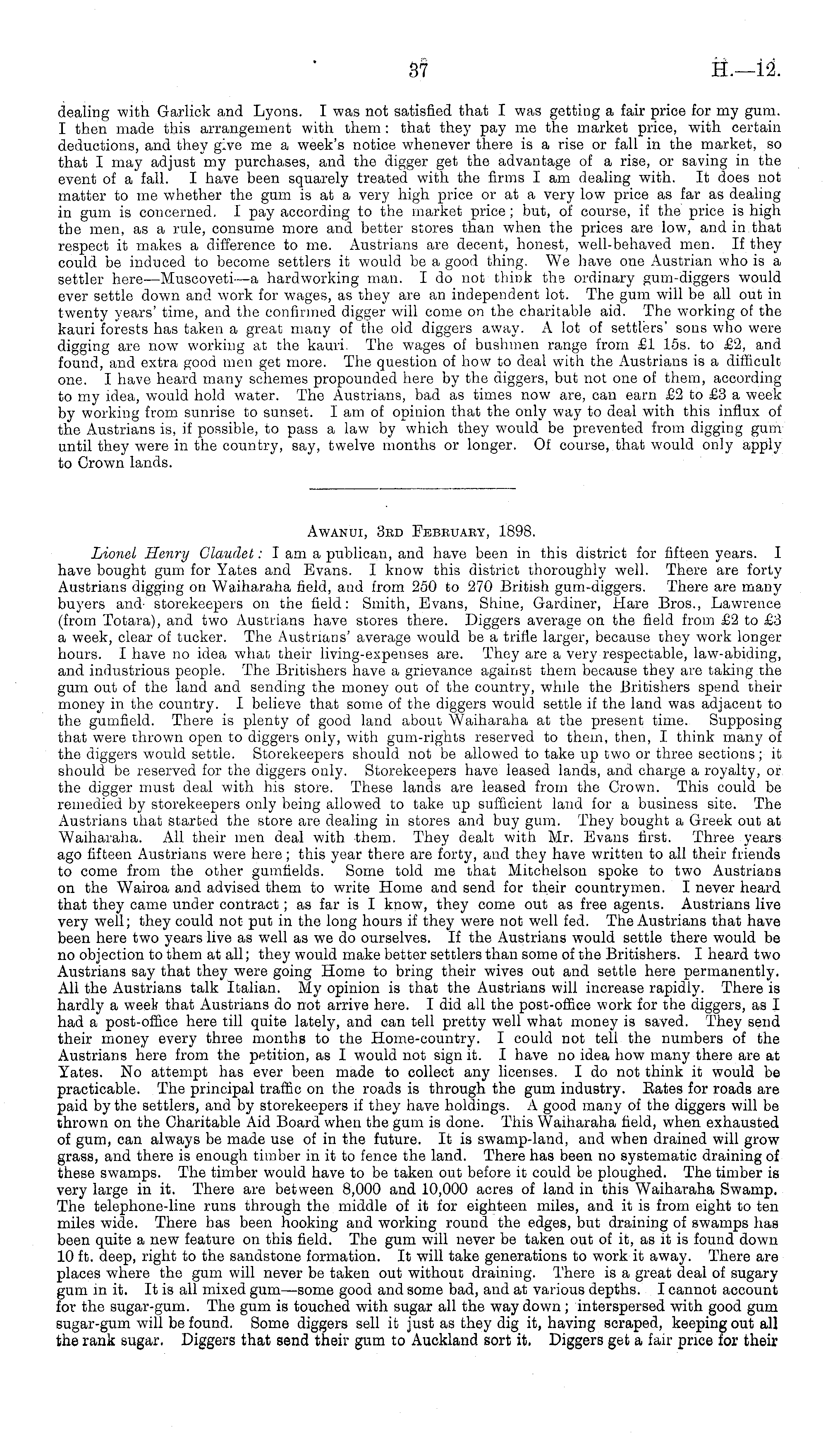 Awanui, 3ed Fbbeuaey, 1898. Lionel Henry Glaudet: lam a publican, and have been in this district for fifteen years. I have bought gum for Yates and Evans. I know this district thoroughly well. There are forty Austrians digging on Waiharaha field, and from 250 to 270 British gum-diggers. There are many buyers and- storekeepers on the field: Smith, Evans, Shine, Gardiner, Hare Bros., Lawrence (from Totara), and two Austrians have stores there. Diggers average on the field from £2 to £3 a week, clear of tucker. The Austrians' average would be a trifle larger, because they work longer hoars. I have no idea what their living-expenses are. They tire a very respectable, law-abiding, and industrious people. The Britishers have a grievance against them because they are taking the gum out of the land and sending the money out of the country, while the Britishers spend their money in the country. I believe that some of the diggers would settle if the land was adjacent to the gumfield. There is plenty of good land about Waiharaha at the present time. Supposing that were thrown open to diggers only, with gum-rights reserved to them, then, I think many of the diggers would settle. Storekeepers should not be allowed to take up two or three sections; it should be reserved for the diggers only. Storekeepers have leased lands, and charge a royalty, or the digger must deal with his store. These lands are leased from the Crown. This could be remedied by storekeepers only being allowed to take up sufficient laud for a business site. The Austrians that started the store are dealing in stores and buy gum. They bought a Greek out at Waiharaha. All their men deal with them. They dealt with Mr. Evans first. Three years ago fifteen Austrians were here; this year there are forty, and they have written to all their friends to come from the other gumfields. Some told me that Mitchelson spoke to two Austrians on the Wairoa and advised them to write Home and send for their countrymen. I never heard that they came under contract; as far is I know, they come out as free agents. Austrians live very well; they could not put in the long hours if they were not well fed. The Austrians that have been here two years live as well as we do ourselves. If the Austrians would settle there would be no objection to them at all; they would make better settlers than some of the Britishers. I heard two Austrians say that they were going Home to bring their wives out and settle here permanently. All the Austrians talk Italian. My opinion is that the Austrians will increase rapidly. There is hardly a week that Austrians do not arrive here. I did all the post-office work for the diggers, as I had a post-office here till quite lately, and can tell pretty well what money is saved. They send their money every three months to the Home-country. I could not tell the numbers of the Austrians here from the petition, as I would not sign it. I have no idea how many there are at Yates. No attempt has ever been made to collect any licenses. I do not think it would be practicable. The principal traffic on the roads is through the gum industry. Bates for roads are paid by the settlers, and by storekeepers if they have holdings. A good many of the diggers will be thrown on the Charitable Aid Board when the gum is done. This Waiharaha field, when exhausted of gum, can always be made use of in the future. It is swamp-land, and when drained will grow grass, and there is enough timber in it to fence the land. There has been no systematic draining of these swamps. The timber would have to be taken out before it could be ploughed. The timber is very large in it. There are between 8,000 and 10,000 acres of land in this Waiharaha Swamp. The telephone-line runs through the middle of it for eighteen miles, and it is from eight to ten miles wide. There has been hooking and working round the edges, but draining of swamps has been quite a new feature on this field. The gum will never be taken out of it, as it is found down 10 ft. deep, right to the sandstone formation. It will take generations to work it away. There are places where the gum will never be taken out without draining. There is a great deal of sugary gum in it. It is all mixed gum—some good and some bad, and at various depths. I cannot account for the sugar-gum. The gum is touched with sugar all the way down; interspersed with good gum sugar-gum will be found. Some diggers sell it just as they dig it, having scraped, keeping out all the rank sugar. Diggers that send their gum to Auckland sort it. Diggers get a fair price for their