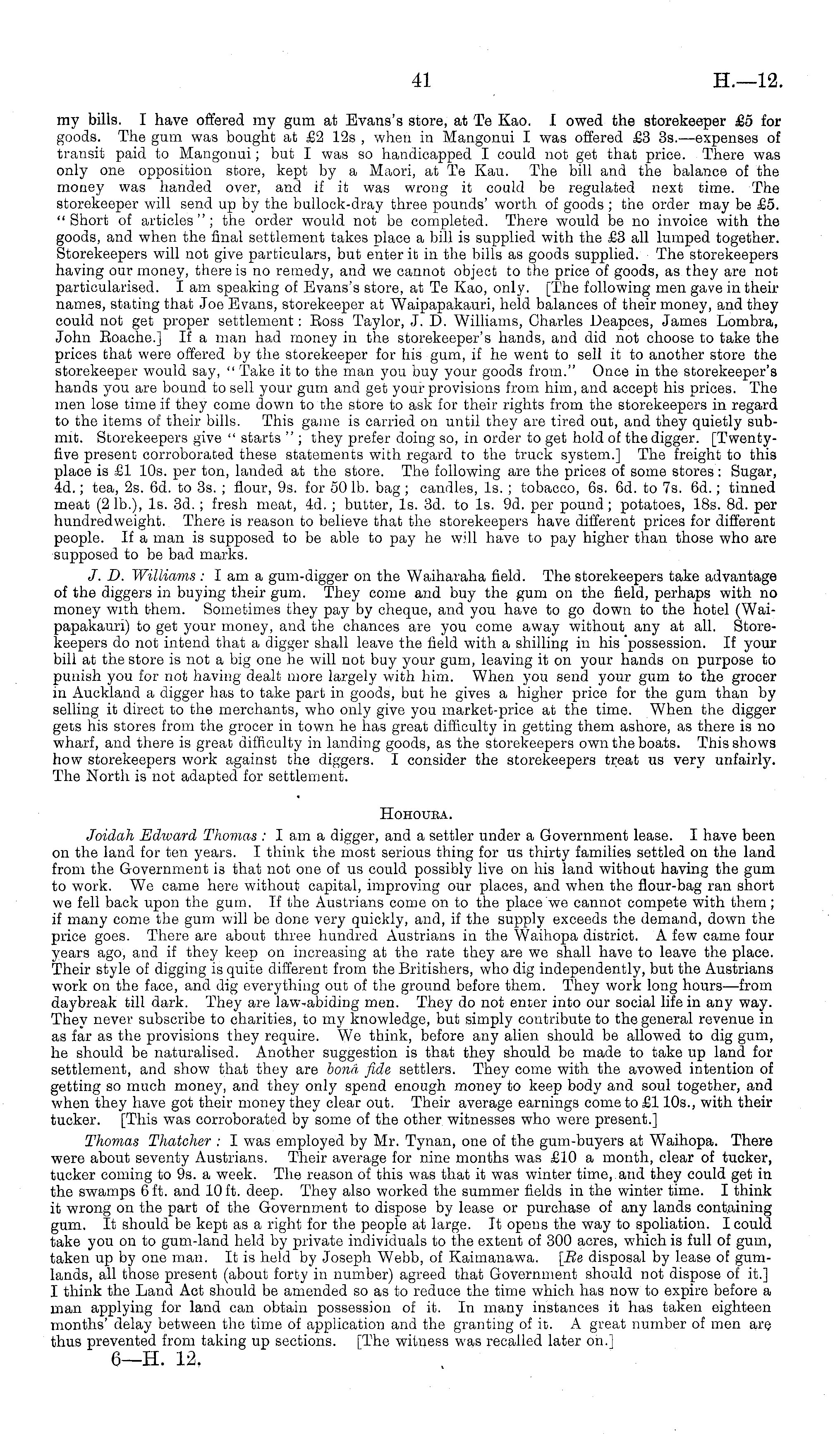 my bills. I have offered my gum at Evans's store, at Te Kao. I owed the storekeeper £5 for goods. The gum was bought at £2 12s , when in Mangonui I was offered £3 3s.—expenses of transit paid to Mangonui; but I was so handicapped I could not get that price. There was only one opposition store, kept by a Maori, at Te Kau. The bill and the balance of the money was handed over, and if it was wrong it could be regulated next time. The storekeeper will send up by the bullock-dray three pounds' worth of goods ; the order may be £5. " Short of articles " ; the order would not be completed. There would be no invoice with the goods, and when the final settlement takes place a bill is supplied with the £3 all lumped together. Storekeepers will not give particulars, but enter it in the bills as goods supplied. The storekeepers having our money, there is no remedy, and we cannot object to the price of goods, as they are not particularised. lam speaking of Evans's store, at Te Kao, only. [The following men gave in their names, stating that Joe Evans, storekeeper at Waipapakauri, held balances of their money, and they could not get proper settlement: Boss Taylor, J. D. Williams, Charles Deapces, James Lombra, John Eoache.] If a man had money in the storekeeper's hands, and did not choose to take the prices that were offered by the storekeeper for his gum, if he went to sell it to another store the storekeeper would say, " Take it to the man you buy your goods from." Once in the storekeeper's hands you are bound to sell your gum and get your provisions from him, and accept his prices. The men lose time if they come down to the store to ask for their rights from the storekeepers in regard to the items of their bills. This game is carried on until they are tired out, and they quietly submit. Storekeepers give " starts " ; they prefer doing so, in order to get hold of the digger. [Twentyfive present corroborated these statements with regard to the truck system.] The freight to this place is £1 10s. per ton, landed at the store. The following are the prices of some stores: Sugar, id. ; tea, 2s. 6d. to 3s. ; flour, 9s. for 50 lb. bag; candles, Is. ; tobacco, 6s. 6d. to 7s. 6d.; tinned meat (21b.), Is. 3d. ; fresh meat, 4d. ; butter, Is. 3d. to Is. 9d. per pound; potatoes, 18s. Bd. per hundredweight. There is reason to believe that the storekeepers have different prices for different people. If a man is supposed to be able to pay he will have to pay higher than those who are supposed to be bad marks. J. D, Williams : lam a gum-digger on the Waiharaha field. The storekeepers take advantage of the diggers in buying their gum. They come and buy the gum on the field, perhaps with no money with them. Sometimes they pay by cheque, and you have to go down to the hotel (Waipapakauri) to get your money, and the chances are you come away without any at all. Storekeepers do not intend that a digger shall leave the field with a shilling in his possession. If your bill at the store is not a big one he will not buy your gum, leaving it on your hands on purpose to punish you for not having dealt more largely with him. When you send your gum to the grocer in Auckland a digger has to take part in goods, but he gives a higher price for the gum than by selling it direct to the merchants, who only give you market-price at the time. When the digger gets his stores from the grocer in town he has great difficulty in getting them ashore, as there is no wharf, and there is great difficulty in landing goods, as the storekeepers own the boats. This shows how storekeepers work against the diggers. I consider the storekeepers treat us very unfairly. The North is not adapted for settlement. Hohouea. Joidah Edward Thomas : lam a digger, and a settler under a Government lease. I have been on the land for ten years. I think the most serious thing for us thirty families settled on the land from the Government is that not one of us could possibly live on his land without having the gum to work. We came here without capital, improving our places, and when the flour-bag ran short we fell back upon the gum. If the Austrians come on to the place we cannot compete with them; if many come the gum will be done very quickly, and, if the supply exceeds the demand, down the price goes. There are about three hundred Austrians in the Waihopa district. A few came four years ago, and if they keep on increasing at the rate they are we shall have to leave the place. Their style of digging is quite different from the Britishers, who dig independently, but the Austrians work on the face, and dig everything out of the ground before them. They work long hours—from daybreak till dark. They are law-abiding men. They do not enter into our social life in any way. They never subscribe to charities, to my knowledge, but simply contribute to the general revenue in as far as the provisions they require. We think, before any alien should be allowed to dig gum, he should be naturalised. Another suggestion is that they should be made to take up land for settlement, and show that they are bond fide settlers. They come with the avowed intention of getting so much money, and they only spend enough money to keep body and soul together, and when they have got their money they clear out. Their average earnings come to £110s., with their tucker. [This was corroborated by some of the other witnesses who were present.] Thomas Thatcher : I was employed by Mr. Tynan, one of the gum-buyers at Waihopa. There were about seventy Austrians. Their average for nine months was £10 a month, clear of tucker, tucker coming to 9s. a week. The reason of this was that it was winter time, and they could get in the swamps 6 ft. and 10 ft. deep. They also worked the summer fields in the winter time. I think it wrong on the part of the Government to dispose by lease or purchase of any lands containing gum. It should be kept as a right for the people at large. It opens the way to spoliation