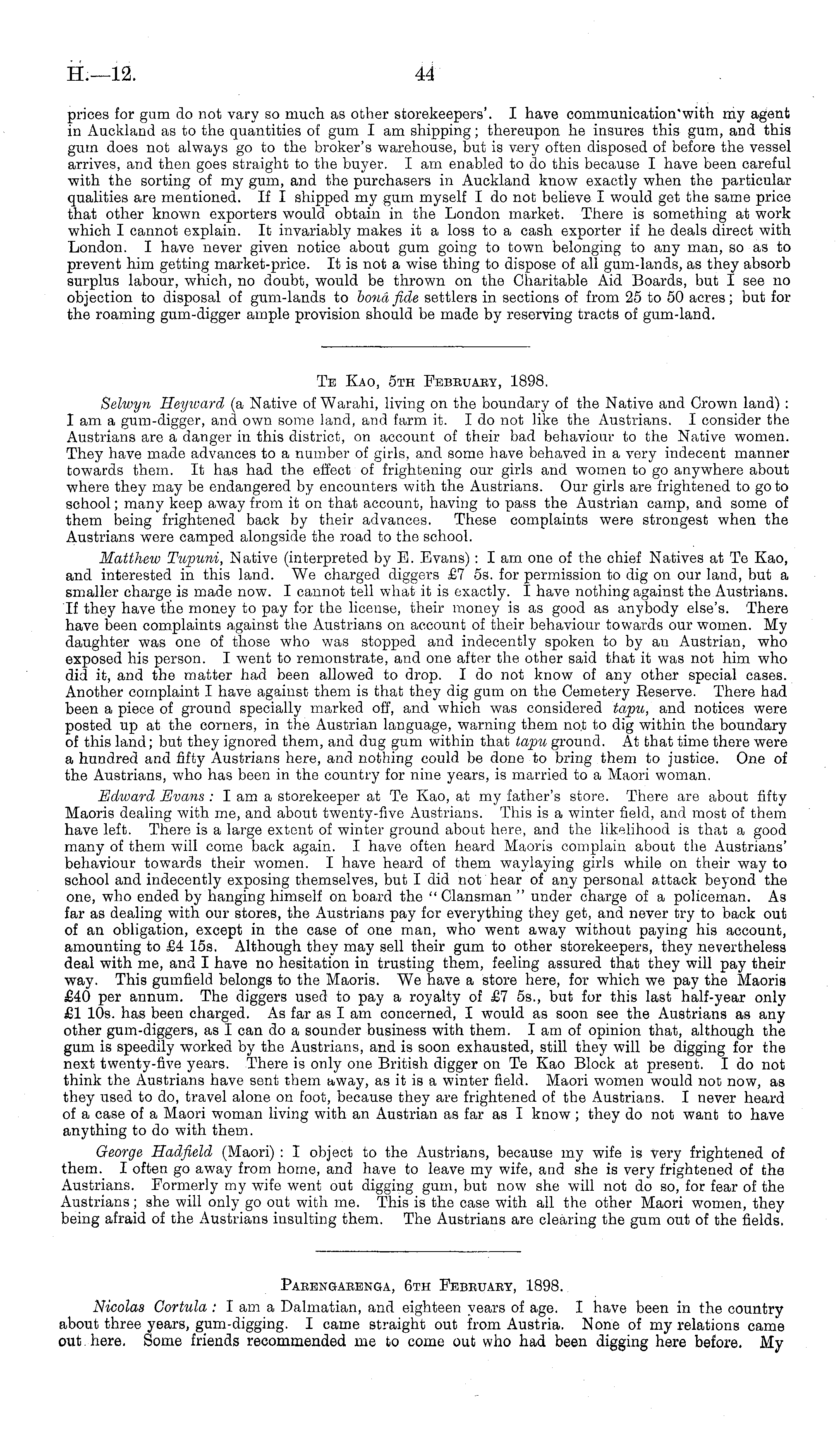 Tβ Kao, sth Febbuaby, 1898. Selwyn Heyward (a Native of Warabi, living on the boundary of the Native and Crown land) : lam a gum-digger, and own some land, and farm it. Ido not like the Austrians. I consider the Austrians are a danger in this district, on account of their bad behaviour to the Native women. They have made advances to a number of girls, and some have behaved in a very indecent manner towards them. It has had the effect of frightening our girls and women to go anywhere about where they may be endangered by encounters with the Austrians. Our girls are frightened to go to school; many keep away from it on that account, having to pass the Austrian camp, and some of them being frightened back by their advances. These complaints were strongest when the Austrians were camped alongside the road to the school. Matthew Tupuni, Native (interpreted by B. Evans) : I am one of the chief Natives at Te Kao, and interested in this land. We charged diggers £7 ss. for permission to dig on our land, but a smaller charge is made now. I cannot tell what it is exactly. I have nothing against the Austrians. If they have the money to pay for the license, their money is as good as anybody else's. There have been complaints against the Austrians on account of their behaviour towards our women. My daughter was one of those who was stopped and indecently spoken to by an Austrian, who exposed his person. I went to remonstrate, and one after the other said that it was not him who did it, and the matter had been allowed to drop. I do not know of any other special cases. Another complaint I have against them is that they dig gum on the Cemetery Eeserve. There had been a piece of ground specially marked off, and which was considered tapu, and notices were posted up at the corners, in the Austrian language, warning them not to dig within the boundary of this land; but they ignored them, and dug gum within that tapu ground. At that time there were a hundred and fifty Austrians here, and nothing could be done to bring them to justice. One of the Austrians, who has been in the country for nine years, is married to a Maori woman. Edward Evans : lam a storekeeper at Te Kao, at my father's store. There are about fifty Maoris dealing with me, and about twenty-five Austrians. This is a winter field, and most of them have left. There is a large extent of winter ground about here, and the likelihood is that a good many of them will come back again. I have often heard Maoris complain about the Austrians' behaviour towards their women. I have heard of them waylaying girls while on their way to school and indecently exposing themselves, but I did not hear of any personal attack beyond the one, who ended by hanging himself on board the " Clansman " under charge of a policeman. As far as dealing with our stores, the Austrians pay for everything they get, and never try to back out of an obligation, except in the case of one man, who went away without paying his account, amounting to £4 15s. Although they may sell their gum to other storekeepers, they nevertheless deal with me, and I have no hesitation in trusting them, feeling assured that they will pay their way. This gumfield belongs to the Maoris. We have a store here, for which we pay the Maoris £40 per annum. The diggers used to pay a royalty of £7 55., but for this last half-year only £1 10s. has been charged. As far as lam concerned, I would as soon see the Austrians as any other gum-diggers, as I can do a sounder business with them. lam of opinion that, although the gum is speedily worked by the Austrians, and is soon exhausted, still they will be digging for the next twenty-five years. There is only one British digger on Te Kao Block at present. Ido not think the Austrians have sent them away, as it is a winter field. Maori women would not now, as they used to do, travel alone on foot, because they are frightened of the Austrians. I never heard of a case of a Maori woman living with an Austrian as far as I know; they do not want to have anything to do with them. George Hadfield (Maori) : I object to the Austrians, because my wife is very frightened of them. I often go away from home, and have to leave my wife, and she is very frightened of the Austrians. Formerly my wife went out digging gum, but now she will not do so, for fear of the Austrians; she will only go out with me. This is the case with all the other Maori women, they being afraid of the Austrians insulting them. The Austrians are clearing the gum out of the fields.