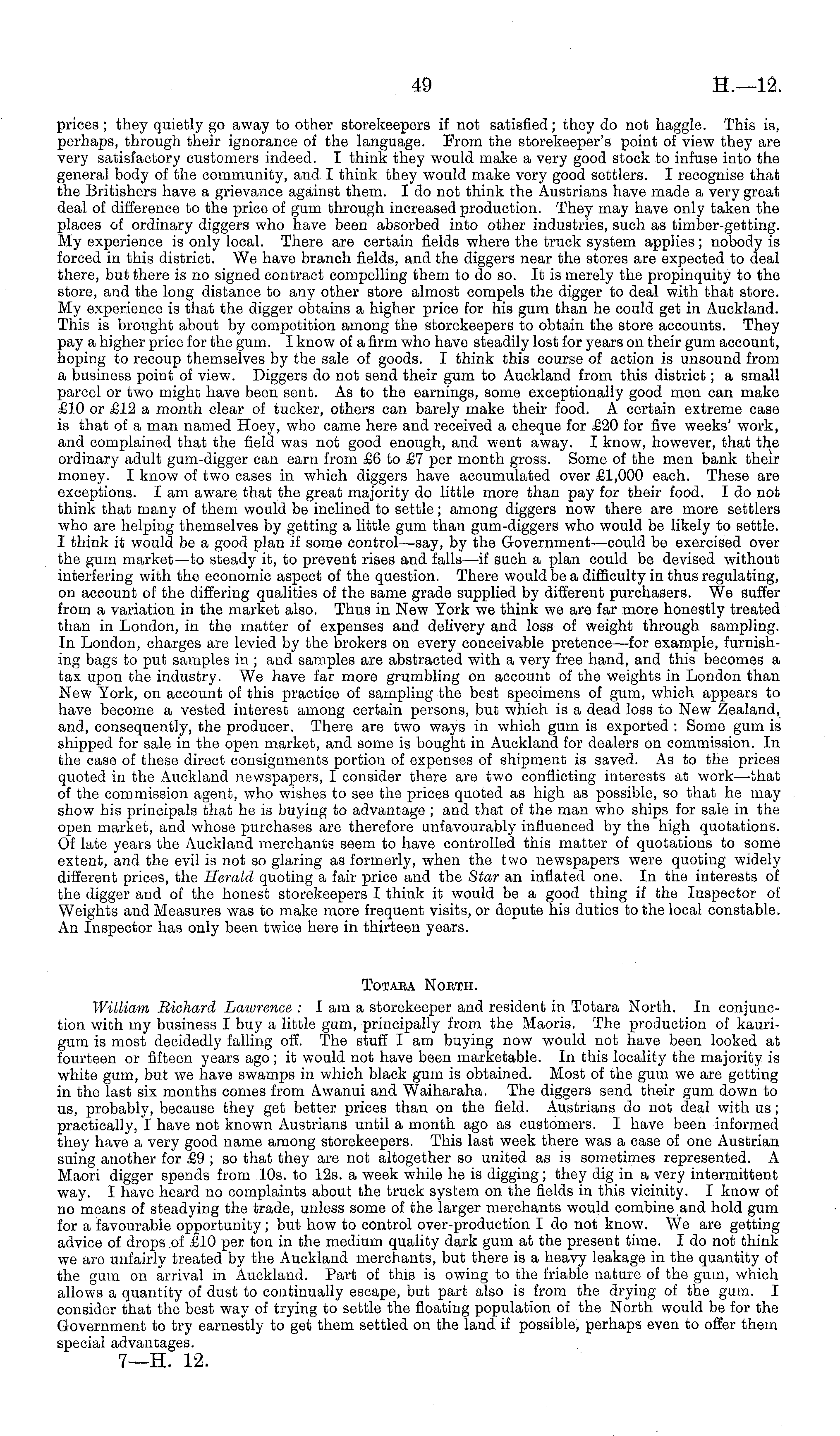 prices ; they quietly go away to other storekeepers if not satisfied; they do not haggle. This is, perhaps, through their ignorance of the language. From the storekeeper's point of view they are very satisfactory customers indeed. I think they would make a very good stock to infuse into the general body of the community, and I think they would make very good settlers. I recognise that the Britishers have a grievance against them. Ido not think the Austrians have made a very great deal of difference to the price of gum through increased production. They may have only taken the places of ordinary diggers who have been absorbed into other industries, such as timber-getting. My experience is only local. There are certain fields where the truck system applies; nobody is forced in this district. We have branch fields, and the diggers near the stores are expected to deal there, but there is no signed contract compelling them to do so. It is merely the propinquity to the store, and the long distance to any other store almost compels the digger to deal with that store. My experience is that the digger obtains a higher price for his gum than he could get in Auckland. This is brought about by competition among the storekeepers to obtain the store accounts. They pay a higher price for the gum. I know of a firm who have steadily lost for years on their gum account, hoping to recoup themselves by the sale of goods. I think this course of action is unsound from a business point of view. Diggers do not send their gum to Auckland from this district; a small parcel or two might have been sent. As to the earnings, some exceptionally good men can make £10 or £12 a month clear of tucker, others can barely make their food. A certain extreme case is that of a man named Hoey, who came here and received a cheque for £20 for five weeks' work, and complained that the field was not good enough, and went away. I know, however, that the ordinary adult gum-digger can earn from £6 to £7 per month gross. Some of the men bank their money. I know of two cases in which diggers have accumulated over £1,000 each. These are exceptions. lam aware that the great majority do little more than pay for their food. Ido not think that many of them would be inclined to settle; among diggers now there are more settlers who are helping themselves by getting a little gum than gum-diggers who would be likely to settle. I think it would be a good plan if some control—say, by the Government —could be exercised over the gum market—to steady it, to prevent rises and falls—if such a plan could be devised without interfering with the economic aspect of the question. There would be a difficulty in thus regulating, on account of the differing qualities of the same grade supplied by different purchasers. We suffer from a variation in the market also. Thus in New York we think we are far more honestly treated than in London, in the matter of expenses and delivery and loss of weight through sampling. In London, charges are levied by the brokers on every conceivable pretence —for example, furnishing bags to put samples in ; and samples are abstracted with a very free hand, and this becomes a tax upon the industry. We have far more grumbling on account of the weights in London than New York, on account of this practice of sampling the best specimens of gum, which appears to have become a vested interest among certain persons, but which is a dead loss to New Zealand, and, consequently, the producer. There are two ways in which gum is exported : Some gum is shipped for sale in the open market, and some is bought in Auckland for dealers on commission. In the case of these direct consignments portion of expenses of shipment is saved. As to the prices quoted in the Auckland newspapers, I consider there are two conflicting interests at work—-that of the commission agent, who wishes to see the prices quoted as high as possible, so that he may show his principals that he is buying to advantage ; and that of the man who ships for sale in the open market, and whose purchases are therefore unfavourably influenced by the high quotations. Of late years the Auckland merchants seem to have controlled this matter of quotations to some extent, and the evil is not so glaring as formerly, when the two newspapers were quoting widely different prices, the Herald quoting a fair price and the Star an inflated one. In the interests of the digger and of the honest storekeepers I think it would be a good thing if the Inspector of Weights and Measures was to make more frequent visits, or depute his duties to the local constable. An Inspector has only been twice here in thirteen years. TOTAEA NOETH. William Richard Lawrence : lam a storekeeper and resident in Totara North. In conjunction with my business I buy a little gum, principally from the Maoris. The production of kaurigum is most decidedly falling off. The stuff I am buying now would not have been looked at fourteen or fifteen years ago; it would not have been marketable. In this locality the majority is white gum, but we have swamps in which black gum is obtained. Most of the gum we are getting in the last six months comes from Awanui and Waiharaha, The diggers send their gum down to us, probably, because they get better prices than on the field. Austrians do not deal with us; practically, I have not known Austrians until a month ago as customers. I have been informed they have a very good name among storekeepers. This last week there was a case of one Austrian suing another for £9 ; so that they are not altogether so united as is sometimes represented. A Maori digger spends from 10s. to 12s. a week while he is digging; they dig in a very intermittent way. I have heard no complaints about the truck system on the fields in this vicinity. I know of no means of steadying the trade, unless some of the larger merchants would combine and hold gum for a favourable opportunity ; but how to control over-product