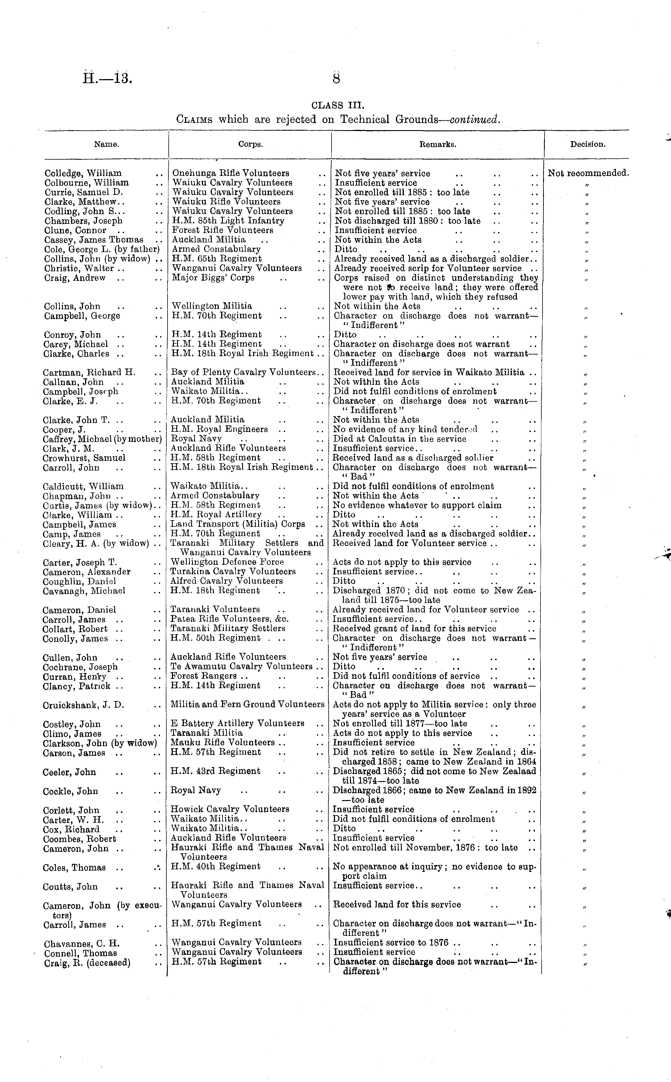 fame. Jorps. loinarl ;s. •ecieion. Colledge, William Colbourne, William Currie, Samuel D. Clarke, Matthew.. Codling, John S... Chambers, Joseph Clune, Connor Cassey, James Thomas Cole, George L. (by father) Collins, John (by widow) .. Christie, Walter Craig, Andrew Onehunga Rifle Volunteers Waiuku Cavalry Volunteers Waiuku Cavalry Volunteers Waiuku Rifle Volunteers Waiuku Cavalry Volunteers H.M. 85th Light Infantry Forest Rifle Volunteers Auckland Militia Armed Constabulary H.M. 65th Regiment Wanganui Cavalry Volunteers Major Biggs' Corps Not five years' service Insufficient service Not enrolled till 1885 : too late Not five years' service Not enrolled till 188S : too late Not discharged till 1880 : too late Insufficient service Not within the Acts Ditto Already received land as a discharged soldier.. Already received scrip for Volunteer service .. Corps raised on distinct understanding they were not 8b receive land; they were offered lower pay with land, which they refused Not within the Acts Character on discharge does not warrant — " Indifferent" Ditto Character on discharge does not warrant Character on discharge does not warrant— " Indifferent " Received land for service in Waikato Militia .. Not within the Acts Did not fulfil conditions of enrolment Character on discharge does not warrant — " Indifferent" Not within the Acts No evidence of any kind tendered Died at Calcutta in the service Insufficient service.. Received land as a discharged soldier Character on discharge does not warrant— "Bad" Did not fulfil conditions of enrolment Not within the Acts No evidence whatever to support claim Ditto Not within the Acts Already received land as a discharged soldier.. Received land for Volunteer service Not recommended. Collins, John Campbell, George Wellington Militia H.M. 70th Regiment Conroy, John Carey, Michael Clarke, Charles H.M. 14th Regiment H.M. 14th Regiment H.M. 18th Royal Irish Regiment .. Cartman, Richard H, Callnan, John Campbell, Josf ph Clarke, E. J. Bay of Plenty Cavalry Volunteers.. Auckland Militia Waikato Militia.. H.M. 70th Regiment Clarke, John T. .. Cooper, J. Cafirey, Michael (by mother) Clark, J. M. Crowhurst, Samuel Carroll, John Auckland Militia H.M. Royal Engineers Royal Navy Auckland Rifle Volunteers H.M. 58th Regiment H.M. 18th Royal Irish Regiment .. Caldicutt, William Chapman, John .. Curtis, James (by widow).. Clarke, William .. Campbell, James Camp, James Cleary, H. A. (by widow) .. Waikato Militia.. Armed Constabulary H.M. 58th Regimeilt H.M. Royal Artillery Land Transport (Militia) Corps .. H.M. 70th Regiment Taranaki Military Settlers and Wanganui Cavalry Volunteers Wellington Defence Force Turakina Cavalry Volunteers Alfred Cavalry Volunteers H.M. 18th Regiment Carter, Joseph T. Cameron, Alexander Coughlin, Daniel Cavanagh, Michael Cameron, Daniel Carroll, James Collart, Robert Conolly, James Cullen, John Cochrane, Joseph Curran, Henry Clancy, Patrick Cruickshank, J. D. Taratiaki Volunteers Patea Rifle Volunteers, &o. Taranaki Military Settlers H.M. 50th Regiment ... Auckland Rifle Volunteers Te Awamutu Cavalry Volunteers .. Forest Rangers H.M. 14th Regiment Militia and Fern Ground Volunteers Acts do not apply to this service Insufficient service.. Ditto Discharged 1870 ; did not come to New Zealand till 1875—too late Already received land for Volunteer service .. Insufficient service.. Received grant of land for this service Character on discharge does not warrant — " Indifferent " Not five years' service Ditto Did not fulfil conditions of service Character on discharge does not warrant — "Bad" Acts do not apply to Militia service : only three years' service as a Volunteer Not enrolled till 1877—too late Acts do not apply to this service Insufficient service Did not retire to settle in New Zealand; discharged 1858; came to New Zealand in 1864 Discharged 1865; did not come to New Zealaad till 1874—too late Discharged 1866; came to New Zealand in 1892 —too late Insufficient service Did not fulfil conditions of enrolment Ditto Insufficient service Not enrolled till November, 1876 : too late Costley, John Climo, James Clarkson, John (by widow) Carson, James E Battery Artillery Volunteers Taranaki Militia Mauku Rifle Volunteers H.M. 57th Regiment Ceeler, John H.M. 43rd Regiment Cockle, John .. Royal Navy .. .. Corlett, John Carter, W. H. .. Cox, Richard Coombes, Robert Cameron, John Howick Cavalry Volunteers Waikato Militia.. .. Waikato Militia.. Auckland Rifle Volunteers Hauraki Rifle and Thames Naval Volunteers H.M. 40th Regiment Coles, Thomas .. No appearance at inquiry; no evidence to support claim Insufficient service.. Coutts, John Hauraki Rifle and Thames Naval Volunteers Wanganui Cavalry Volunteers Cameron, John (by executors) Carroll, James Received land for this service Chavannes, C. H. Connell, Thomas Craig, R. (deceased) H.M. 57th Regiment Wanganui Cavalry Volunteers Wanganui Cavalry Volunteers H.M. 57th Regiment Character on discharge does not warrant—"Indifferent " Insufficient service to 1876 Insufficient service Oharaoter on discharge does not warrant—" In-