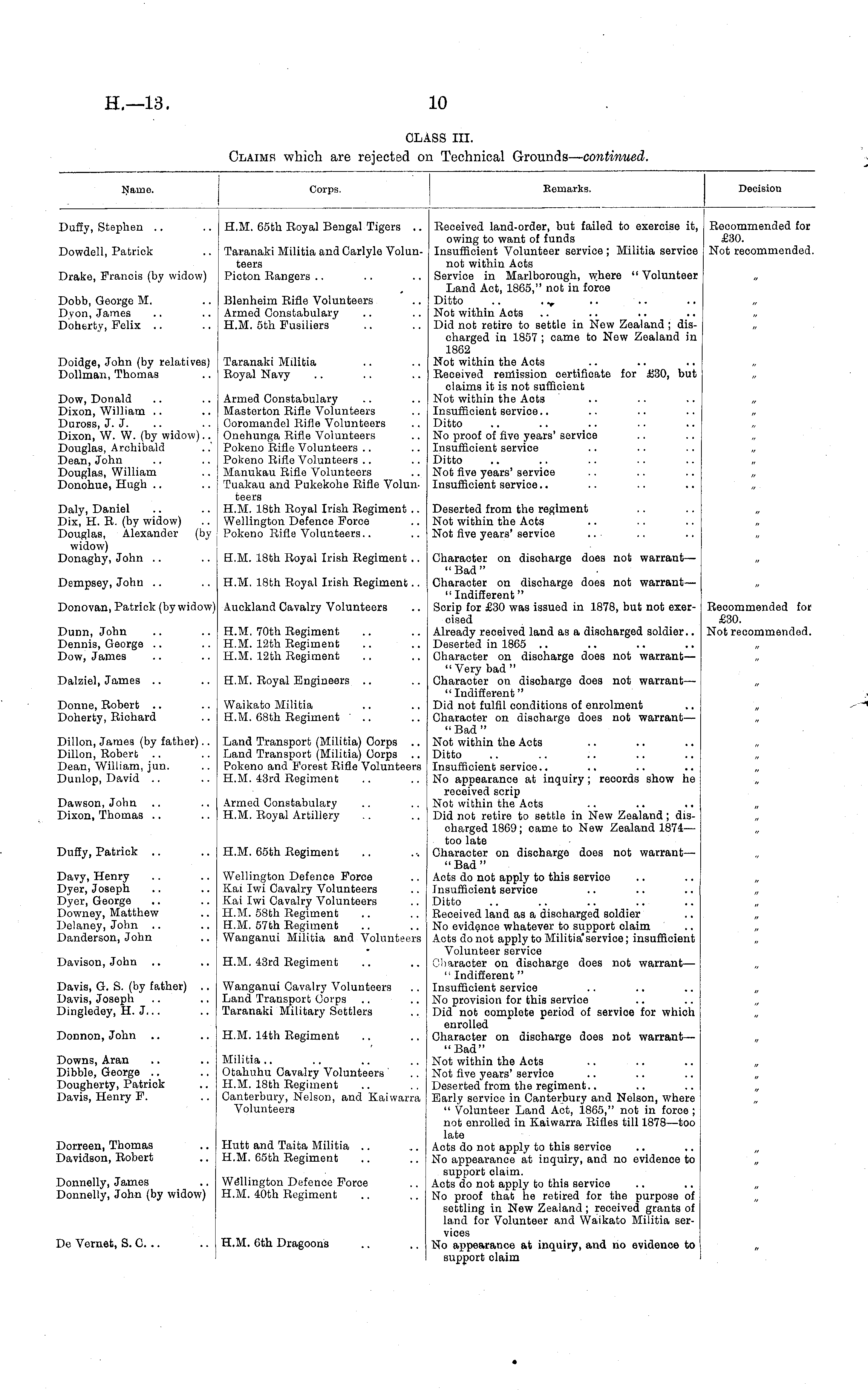 :aioe. iorps. ;oiuav] :s. •ecision Daffy, Stephen .. H.M. 65th Royal Bengal Tigers .. Received land-order, but failed to exercise it, owing to want of funds Insufficient Volunteer service ; Militia service not within Acts Service in Marlborough, where "Volunteer Land Act, 1865," not in force Ditto Not within Aots Did not retire to settle in New Zealand ; discharged in 1857 ; came to New Zealand in 1862 Not within the Acts Received rerdission certificate for £30, but claims it is not sufficient Not within the Aots Insufficient service Ditto No proof of five years' service Insufficient servioe Ditto Not five years' service Insufficient service Recommended for £30. Not recommended. Dowdell, Patrick Taranaki Militia and Carlyle Volunteers Picton Rangers Drake, Francis (by widow) Dobb, George M. Dyon, James Doherty, Felix Blenheim Rifle Volunteers Armed Constabulary H.M. 5th Fusiliers Doidge, John (by relatives) Dollman, Thomas Taranaki Militia Royal Navy Dow, Donald Dixon, William Duross, J. J. Dixon, W. W. (by widow).. Douglas, Archibald Dean, John Douglas, William Donohue, Hugh Armed Constabulary Masterton Rifle Volunteers Coromandel Rifle Volunteers Onehunga Rifle Volunteers Pokeno Rifle Volunteers Pokeno Rifle Volunteers Manukau Riflo Volunteers Tuakau and Pukekohe Rifle Volunteers H.M. 18th Royal Irish Regiment .. Wellington Defence Force Pokeno Rifle Volunteers.. Daly, Daniel Dix, H. R. (by widow) Douglas, Alexander (by widow) Donaghy, John Deserted from the regiment Not within the Aots Not five years' service Dempsey, John Donovan, Patrick (by widow] Dunn, John Dennis, George Dow, James Dalziel, James Donne, Robert Doherty, Richard Dillon, Jamea (by father).. Dillon, Robert Dean, William, jun. Dunlop, David Dawson, John Dixon, Thomas Duffy, Patrick Davy, Henry Dyer, Joseph Dyer, George Downey, Matthew Delaney, John Danderson, John H.M. 18th Royal Irish Regiment .. H.M. 18th Royal Irish Regiment.. Auckland Cavalry Volunteers H.M. 70th Regiment H.M. 12th Regiment H.M. 12th Regiment H.M. Royal Engineers Waikato Militia H.M. 68th Regiment ' .. Land Transport (Militia) Corps .. Land Transport (Militia) Corps Pokeno and Forest Rifle Volunteers H.M. 43rd Regiment Armed Constabulary H.M. Royal Artillery H.M. 65th Regiment Wellington Defence Force Kai Iwi Cavalry Volunteers Kai Iwi Cavalry Volunteers H.M. 58th Regiment H.M. 57th Regiment Wanganui Militia and Volunteers Character on discharge does not warrant — "Bad" Character on discharge does not warrant— " Indifferent" Scrip for £30 was issued in 1878, but not exercised Already received land as a discharged soldier.. Deserted in 1865 Character on discharge does not warrant— " Very bad " Character on discharge does not warrant — "Indifferent" Did not fulfil conditions of enrolment Character on discharge does not warrant— "Bad" Not within the Acts Ditto Insufficient service.. No appearance at inquiry; reoords show he received scrip Not within the Acts Did not retire to settle in New Zealand; discharged 1869; came to New Zealand 1874 — too late Character on discharge does not warrant — "Bad" Acts do not apply to this servioe Insufficient service Ditto Received land as a discharged soldier No evidence whatever to support claim Aots do not apply to Militia" service; insufficient Volunteer service Character on disoharge does not warrant— " Indifferent" Insufficient service No provision for this service Did not complete period of service for which enrolled Character on discharge does not warrant— "Bad" Not within the Acts Not five years' service Deserted from the regiment.. Early service in Canterbury and Nelson, where " Volunteer Land Act, 1865," not in force ; not enrolled in Kaiwarra Rifles till 1878—too late Acts do not apply to this service No appearance at inquiry, and no evidence to support claim. Acts do not apply to this service No proof that he retired for the purpose of settling in New Zealand ; received grants of land for Volunteer and Waikato Militia services No appearance at inquiry, and no evidence to support claim Recommended for £30. Not recommended. Davison, John H.M. 43rd Regiment Davis, G. S. (by father) .. Davis, Joseph Dingledey, H. J. .. Wanganui Cavalry Volunteers Land Transport Corps Taranaki Military Settlers Donnon, John H.M. 14th Regiment Downs, Aran Dibble, George Dougherty, Patrick Davis, Henry F. Militia Otahuhu Cavalry Volunteers H.M. 18th Regiment Canterbury, Nelson, and Kaiwarra Volunteers Dorreen, Thomas Davidson, Robert Hutt and Taita Militia H.M. 65th Regiment Donnelly, James Donnelly, John (by widow) Wellington Defence Force H.M. 40th Regiment De Vernet, S. C. .. H.M. 6th Dragoons