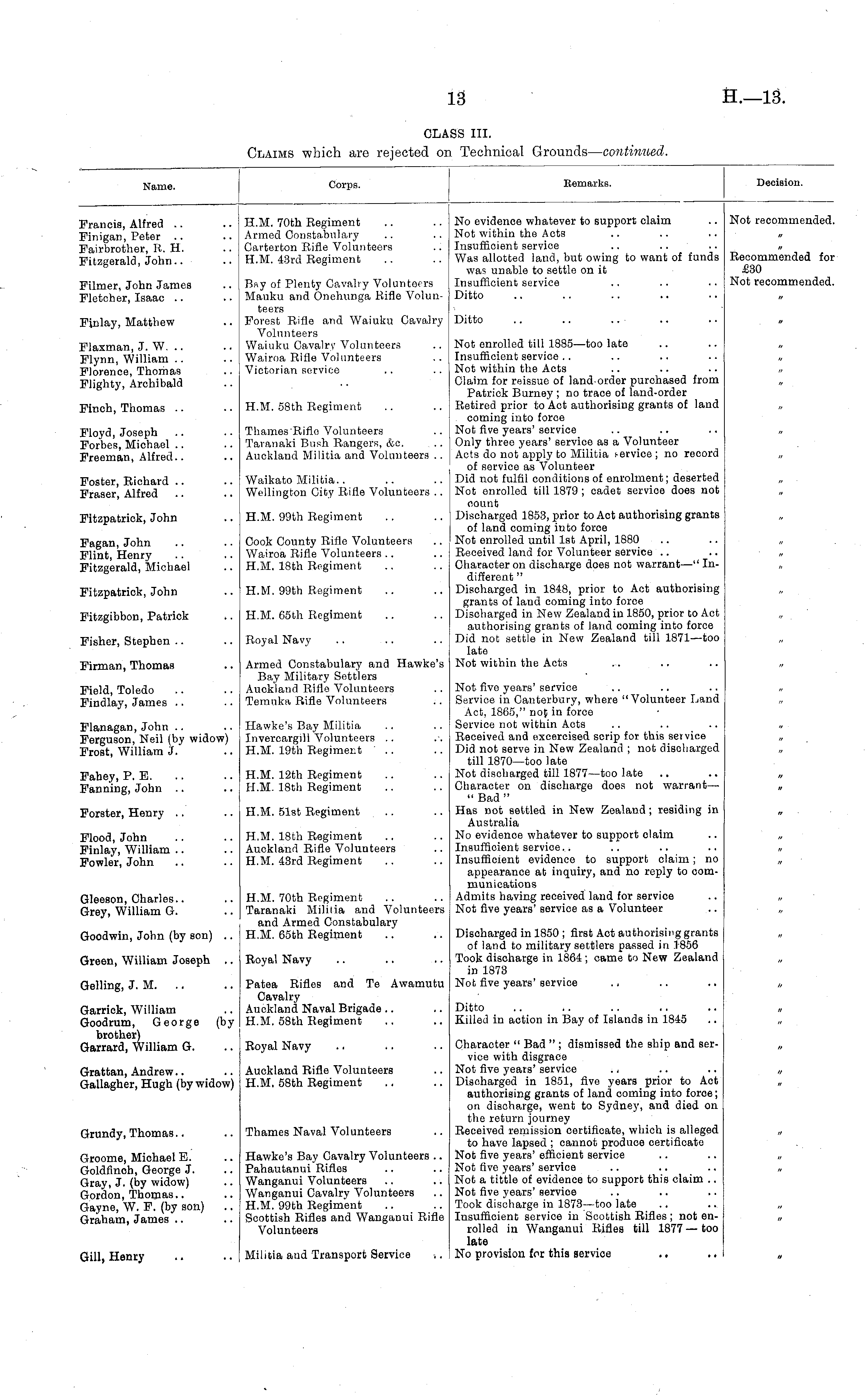 Name. Corps. iemar] :s. •ecision. Francis, Alfred Finigan, Peter Fairbrother, R. H. Fitzgerald, John.. H.M. 70th Regiment Armed Constabulary Garterton Bifle Volunteers H.M. 43rd Regiment No evidence whatever to support claim Not within the Acts Insufficient service Was allotted land, but owing to want of funds was unable to settle on it Insufficient service Ditto Not recommended. Recommended for £30 Not recommended. Filmer, John James Fletcher, Isaac .. Finlay, Matthew Bay of Plenty Cavalry Volunteers Mauku and Onehunga Rifle Volunteers Forest Rifle and Waiuku Cavalry Volunteers Waiuku Cavalry Volunteers Wairoa Rifle Volunteers Victorian service Ditto a Flaxman, J. W. .. Flynn, William Florence, Thomas Flighty, Archibald Finch, Thomas Floyd, Joseph Forbes, Michael Freeman, Alfred.. Foster, Richard Fraser, Alfred H.M. 58th Regiment ThamesRiflo Volunteers Taranaki Bnsh Rangers, &c. Auckland Militia and Volunteers .. Waikato Militia.. Wellington City Rifle Volunteers .. Not enrolled till 1885—too late Insufficient service Not within the Acts Claim for reissue of land-order purchased from Patrick Burney ; no trace of land-order Retired prior to Act authorising grants of land coming into force Not five years' service Only three years' service as a Volunteer Acts do not'apply to Militia >-ervice ; no record of service as Volunteer Did not fulfil conditions of enrolment; deserted Not enrolled till 1879; cadet service does not oount Discharged 1853, prior to Act authorising grants of land coming iuto force Not enrolled until 1st April, 1880 Received land for Volunteer service Character on discharge dees not warrant —" Indifferent " Discharged in 1848, prior to Act authorising grants of land coming into force Discharged in New Zealand in 1850, prior to Act authorising grants of land coming into force Did not settle in New Zealand till 1871 —too late Not within the Acts Fitzpatrick, John H.M. 99th Regiment Fagan, John Flint, Henry Fitzgerald, Michael Cook County Rifle Volunteers Wairoa Rifle Volunteers H.M. 18th Regiment Fitzpatrick, John H.M. 99th Regiment Fitzgibbon, Patrick H.M. 65th Regiment Fisher, Stephen Royal Navy Firman, Thomas Field, Toledo Findlay, James Armed Constabulary and Hawke's Bay Military Settlers Auckland Rifle Volunteers Temuka Rifle Volunteers Not five years' service Service in Canterbury, where "Volunteer Land Act, 1865," not in force Service not within Acts Received and excercised scrip for this service Did not serve in New Zealand ; not discharged till 1870—too late Not discharged till 1877—too late Character on discharge does not warrant — "Bad" Has not settled in New Zealand; residing in Australia No evidence whatever to support claim Insufficient service.. Insufficient evidence to support claim; no appearance at inquiry, and no reply to communications Admits having received land for service Not five years' service as a Volunteer Flanagan, John Ferguson, Neil (by widow) Frost, William J. Hawke's Bay Militia Invercargill Volunteers .. H.M. 19th Regiment Fahey, P. E. Fanning, John H.M. 12th Regiment H.M. 18th Regiment Forster, Henry H.M. Slst Regiment Flood, John Finlay, William Fowler, John H.M. 18th Regiment Auckland Rifle Volunteers H.M. 43rd Regiment Gleeson, Charles.. Grey, William G. H.M. 70th Regiment Taranaki Militia and Volunteers and Armed Constabulary H.M. 65th Regiment Goodwin, John (by son) .. Green, William Joseph .. Royal Navy Discharged in 1850 ; first Act authorising grants of land to military settlers passed in 1856 Took discharge in 1864; came to New Zealand in 1873 Not five years' service ., Gelling, J. M. Garrick, William Goodrum, George (by brother) Garrard, William G. Patea Rifles and Tβ Awamutu Cavalry Auckland Naval Brigade H.M. 58th Regiment Ditto Killed in action in Bay of Islands in 1845 Grattan, Andrew.. Gallagher, Hugh (by widow) Grundy, Thomas.. Groome, Michael E. Goldfinch, George J. Gray, J. (by widow) Gordon, Thomas Gayne, W. F. (by son) Graham, James Royal Navy Auckland Rifle Volunteers H.M. 58th Regiment Thames Naval Volunteers Hawke's Bay Cavalry Volunteers .. Pahautanui Rifles Wanganui Volunteers Wanganui Cavalry Volunteers H.M. 99th Regiment Scottish Rifles and Wanganui Rifle Volunteers Character " Bad " ; dismissed the ship and service with disgrace Not five years' service .. Discharged in 1851, five years prior to Act authorising grants of land coming into force; on discharge, went to Sydney, and died on the return journey Received remission certificate, which is alleged to have lapsed ; cannot produce certificate Not five years' efficient service Not five years' service Not a tittle of evidence to support this claim .. Not five years' service Took discharge in 1873 —too late Insufficient service in Scottish Rifles ; not enrolled in Wanganui Rifles till 1877 — too late No provision for this service .. >. I Gill, Henry Militia and Transport Service
