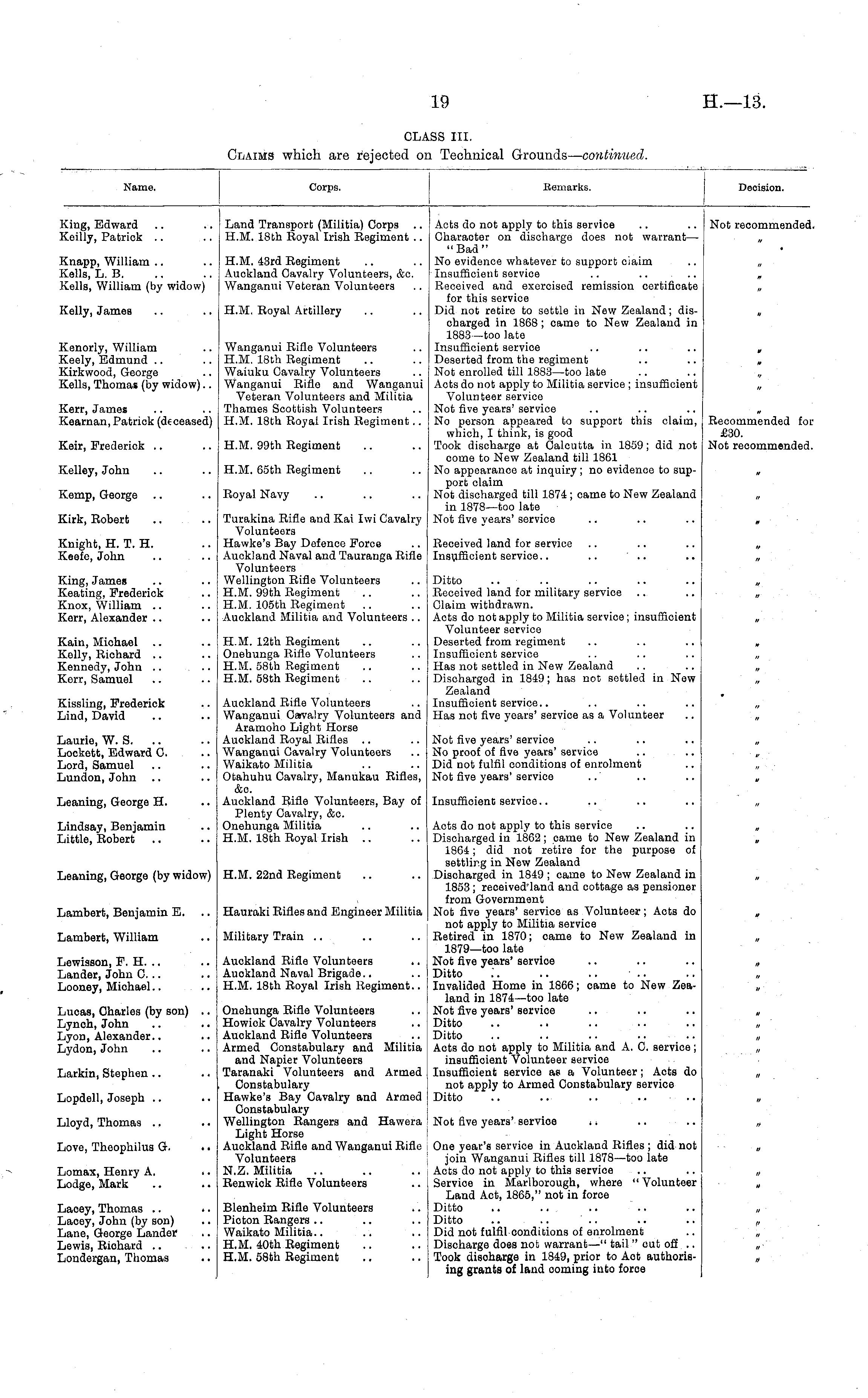lame. iorps. ;emar] :s. lecision. King, Edward Keilly, Patrick Land Transport (Militia) Corps .. H.M. 18th Royal Irish Regiment .. Acts do not apply to this service Character on discharge does not warrant— "Bad" No evidence whatever to support ciaim Insufficient service Received and exercised remission certificate for this service Did not retire to settle in New Zealand; discharged in 1868; came to New Zealand in 1883—too late Insufficient service Deserted from the regiment Not enrolled till 1883—too late Acts do not apply to Militia service ; insufficient Volunteer service Not five years' service No person appeared to support this claim, which, I think, is good Took discharge at Calcutta in 1859; did not come to New Zealand till 1861 No appearance at inquiry; no evidence to support claim Not discharged till 1874 ; came to New Zealand in 1878—too late Not five years' service Not recommended, Knapp, William Kells, L. B. Kells, William (by widow) H.M. 43rd Regiment Auckland Cavalry Volunteers, &c. Wanganui Veteran Volunteers Kelly, James H.M. Royal Artillery Kenorly, William Keely, Edmund Kirkwood, George Kells, Thomas (by widow).. Wanganui Rifle Volunteers H.M. 18th Regiment Waiuku Cavalry Volunteers Wanganui Rifle and Wanganui Veteran Volunteers and Militia Thames Scottish Volunteers H.M. 18th Royal Irish Regiment.. n Kerr, James Kearnan, Patrick (deceased) Recommended for £30. Not recommended. Keir, Frederick H.M. 99th Regiment Kelley, John H.M. 65th Regiment Kemp, George Royal Navy Kirk, Robert Knight, H. T. H. Keefe, John Turakina Rifle and Kai Ivvi Cavalry Volunteers Hawke's Bay Defence Force Auckland Naval and Tauranga Rifle Volunteers Wellington Rifle Volunteers H.M. 99th Regiment H.M. 105th Regiment .. Auckland Militia and Volunteers .. Received land for service Insufficient service.. .. King, James Keating, Frederick Knox, William Kerr, Alexander .. Kain, Michael Kelly, Richard Kennedy, John .. Kerr, Samuel H.M. 12th Regiment Onehunga Rifle Volunteers H.M. 58th Regiment H.M. 58th Regiment Ditto Received land for military service Claim withdrawn. Acts do not apply to Militia service; insufficient Volunteer service Deserted from regiment Insufficient service Has not settled in New Zealand Discharged in 1849; has not settled in New Zealand Insufficient service.. Has not five years' service as a Volunteer Kissling, Frederick Lind, David Laurie, W. S. Lockett, Edward C. Lord, Samuel Lundon, John Auckland Rifle Volunteers Wanganui Cavalry Volunteers and Aramoho Light Horse Auckland Royal Rifles Wanganui Cavalry Volunteers Waikato Militia Otahuhu Cavalry, Manukau Rifles, &o. Auckland Rifle Volunteers, Bay of Plenty Cavalry, &c. Onehunga Militia H.M. 18th Royal Irish Not five years' service No proof of five years' service .. ... Did not fulfil conditions of enrolment Not five years' service Leaning, George H. Insufficient service.. Lindsay, Benjamin Little, Robert Leaning, George (by widow) Lambert, Benjamin E. Lambert, William Lewisson, F. H. .. Lander, John C... Looney, Michael H.M. 22nd Regiment Hauraki Rifles and Engineer Militia Military Train Auokland Rifle Volunteers Auckland Naval Brigade.. H.M. 18th Royal Irish Regiment.. Acts do not apply to this service Discharged in 1862; came to New Zealand in 1864; did not retire for the purpose of settling in New Zealand Discharged in 1849 ; came to New Zealand in 1853 ; received land and cottage as pensioner from Government Not five years' service as Volunteer; Acts do not apply to Militia service Retired in 1870; came to New Zealand in 1879—too late Not five years' service Ditto Invalided Home in 1866; came to New Zealand in 1874—too late Not five years' service Ditto Ditto Acts do not apply to Militia and A. C. service ; insufficient Volunteer service Insufficient service as a Volunteer; Acts do not apply to Armed Constabulary service Ditto if Lucas, Charles (by son) .. Lynoh, John Lyon, Alexander.. Lydon, John Larkin, Stephen Lopdell, Joseph Onehunga Rifle Volunteers Howick Cavalry Volunteers Auckland Rifle Volunteers Armed Constabulary and Militia and Napier Volunteers Taranaki Volunteers and Armed Constabulary Hawke's Bay Cavalry and Armed Constabulary Wellington Rangers and Hawera Light Horse Auckland Rifle and Wanganui Rifle Volunteers N.Z. Militia Renwick Rifle Volunteers i> rt Lloyd, Thomas Not five years' servioe .. Love, Theophilus G. .. Lomax, Henry A. .. Lodge, Mark Lacey, Thomas .. •. Lacey, John (by son) Lane, George Lander Lewis, Riohard .. Londergan, Thomas Blenheim Rifle Volunteers Picton Rangers Waikato Militia.. H.M. 40th Regiment H.M. 58th Regiment One year's service in Auckland Rifles ; did not join Wanganui Rifles till 1878 —too late Acts do not apply to this service Service in Marlborough, where "Volunteer Land Act, 1865," not in force Ditto Ditto Did not fulfil conditions of enrolment Discharge does not warrant—" tail " cut off .. Took disoharge in 1849, prior to Aot authorising grants of land coming into force if