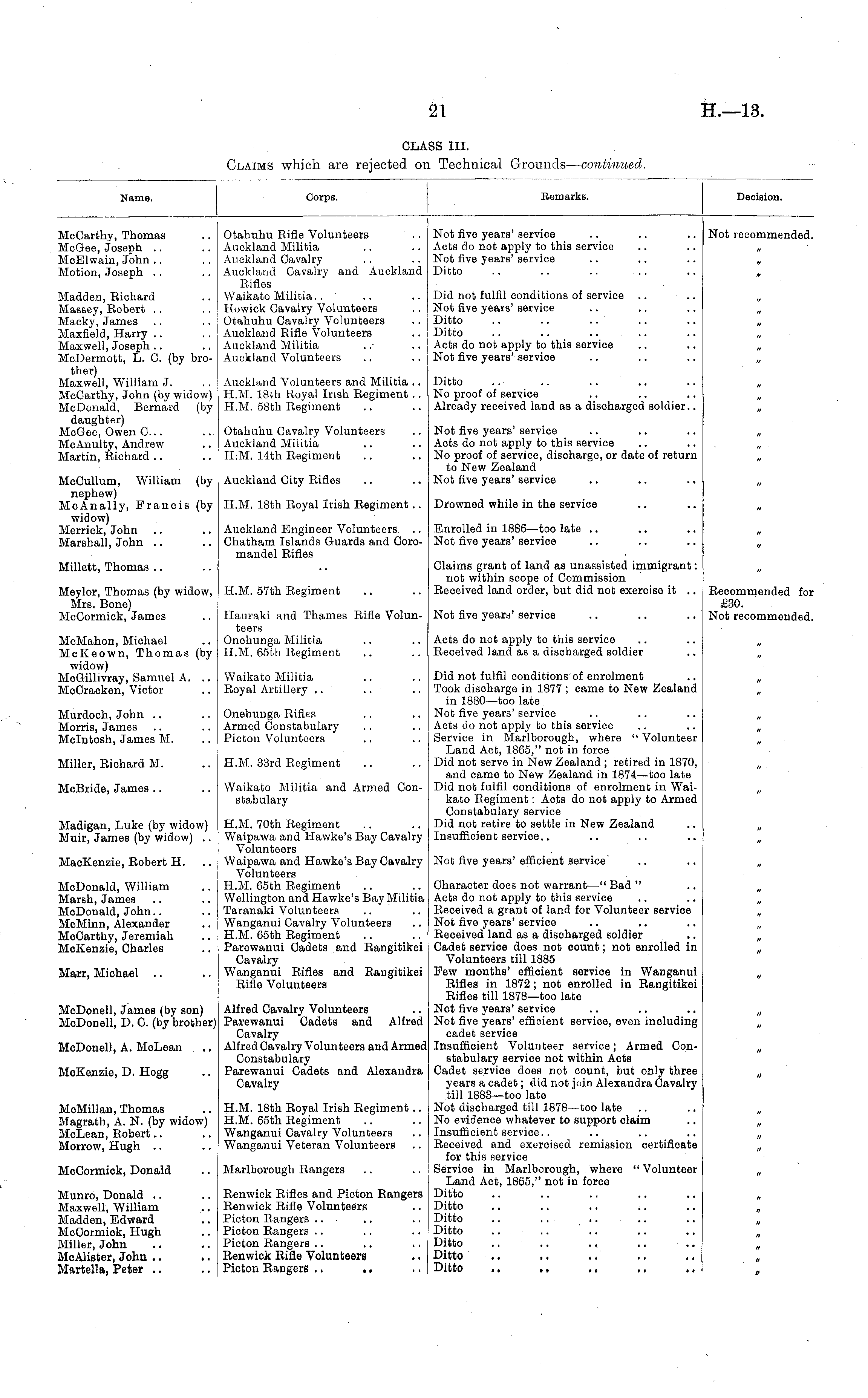 Name. lorps. iexnar] :s. 'ecision. McCarthy, Thomas McGee, Joseph .. McElwain, John .. Motion, Joseph .. Otahuhu Rifle Volunteers Auckland Militia Auckland Cavalry Auckland Cavalry and Auckland Rifles Waikato Militia.. Howick Cavalry Volunteers Otahuhu Cavalry Volunteers Auckland Rifle Volunteers Auckland Militia Auckland Volunteers Not five years' service Acts do not apply to this service Not five years' service Ditto Not recommended. Madden, Richard Massey, Robert .. Macky, James Vlaxfield, Harry Maxwell, Joseph .. McDermott, L. C. (by brother) Maxwell, William J. McCarthy, John (by widow) McDonald, Bernard (by daughter) McGee, Owen 0... McAnulty, Andrew Martin, Richard Did not fulfil conditions of service Not five years' service Ditto Ditto .. .. .. .. Acts do not apply to this service Not five years' service Auckland Volunteers and Militia .. H.M. 18th Royal Irish Regiment .. H.M. 58th Regiment Ditto No proof of service Already received land as a discharged soldier.. Otahuhu Cavalry Volunteers Auckland Militia H.M. 14th Regiment Not five years' service Acts do not apply to this service No proof of service, discharge, or date of return to New Zealand Not five years' service McCullum, William (by nephew) McAnally, Francis (by widow) Vlerrick, John Marshall, John .. Auckland City Rifles H.M. 18th Royal Irish Regiment .. Drowned while in the service Auckland Engineer Volunteers Chatham Islands Guards and Coromandel Rifles Enrolled in 1886—too late Not five years' service Millett, Thomas Claims grant of land as unassisted immigrant: not within scope of Commission Received land order, but did not exercise it .. Meylor, Thomas (by widow, Mrs. Bone) McCormick, James H.M. 57th Regiment Hauraki and Thames Rifle Volunteers Oneliunga Militia H.M. 65th Regiment Not five years' service Recommended for £30. Not recommended. McMahon, Michael MeKeown, Thomas (by widow) McGillivray, Samuel A. .. McCracken, Victor Acts do not apply to this service Eeceived land as a discharged soldier Murdoch, John Morris, James Mclntosh, James M. Miller, Richard M. Waikato Militia Royal Artillery Onehunga Rifles Armed Constabulary Picton Volunteers H.M. 33rd Regiment Did not fulfil conditions of enrolment Took discharge in 1877 ; came to New Zealand in 1880—too late Not five years' service Acts do not apply to this service Service in Marlborougta, where " Volunteer Land Act, 1865," not in force Did not serve in New Zealand ; retired in 1870, and came to New Zealand in 1874 —too late Did not fulfil conditions of enrolment in Waikato Regiment: Acts do not apply to Armed Constabulary service Did not retire to settle in New Zealand Insufficient service.. McBride, James Waikato Militia and Armed Constabulary VIadigan, Luke (by widow) Muir, James (by widow) .. H.M. 70th Regiment Waipawa and Hawke's Bay Cavalry Volunteers Waipawa and Hawke's Bay Cavalry Volunteers H.M. 65th Regiment Wellington and Hawke's Bay Militia Taranaki Volunteers Wanganui Cavalry Volunteers H.M. 65th Regiment Parewanui Cadets and Rangitikei Cavalry Wanganui Rifles and Rangitikei Rifle Volunteers MacKenzie, Robert H. Not five years' efficient service McDonald, William Marsh, James McDonald, John.. McMinn, Alexander McCarthy, Jeremiah McKenzie, Charles Marr, Michael .. McDonell, James (by son) McDonell, D. C. (by brother) McDonell, A. McLean McKenzie, D. Hogg Alfred Cavalry Volunteers Parewanui Cadets and Alfred Cavalry Alfred Cavalry Volunteers and Armed Constabulary Parewanui Cadets and Alexandra Cavalry Character does not warrant—" Bad " Acts do not apply to this service Received a grant of land for Volunteer service Not five years' service Received land as a discharged soldier Cadet servioe does not count; not enrolled in Volunteers till 1885 Few months' efficient service in Wanganui Rifles in 1872 ; not enrolled in Rangitikei Rifles till 1878—too late Not five years' service .. ., Not five years' efficient service, even including cadet service Insufficient Volunteer service; Armed Constabulary service not within Aots Cadet service does not count, but only three years a cadet; did not join Alexandra Cavalry till 1883—too late Not discharged till 1878 —too late No evidence whatever to support olaim Insufficient service.. Received and exercised remission certificate for this service Service in Marlborough, where " Volunteer Land Act, 1865," not in force Ditto Ditto Ditto Ditto Ditto Ditto Ditto .. .. ,. i> t> McMillan, Thomas Magrath, A. N. (by widow) McLean, Robert Morrow, Hugh H.M. 18th Royal Irish Regiment .. H.M. 65th Regiment Wanganui Cavalry Volunteers Wanganui Veteran Volunteers McCormick, Donald Marlborough Rangers Munro, Donald Maxwell, William Madden, Edward McCormick, Hugh Miller, John .. McAlistei, John .. .. ilartella, Peter Renwick Rifles and Picton Rangers Renwick Rifle Volunteers Picton Rangers ... Picton Rangers Picton Rangers Renwick Rifle Volunteers Picton Rangers ., ..