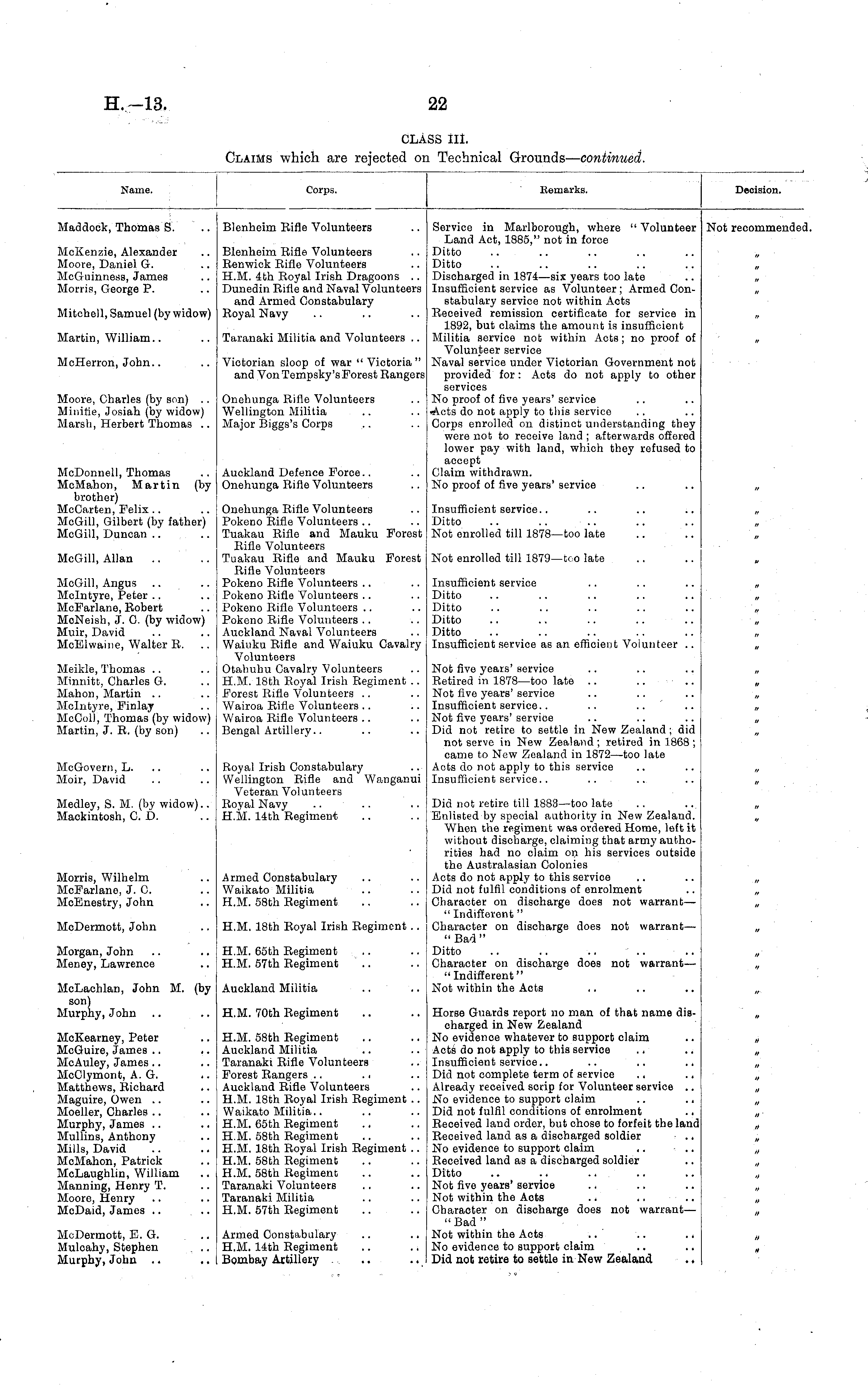 fame. Jorps. lemar] :S. lecision. Maddock, Thomas S. Blenheim Rifle Volunteers Service in Marlborough, where " Volunteer Land Act, 1885," not in force Ditto Ditto Discharged in 1874 —six years too late Insufficient service as Volunteer; Armed Constabulary service not within Acts Received remission certificate for service in 1892, but claims the amount is insufficient Militia service not within Acts; no proof of Volunteer service Naval service under Victorian Government not provided for: Acts do not apply to other services No proof of five years' service ■Acts do not apply to this service Corps enrolled on distinct understanding they were not to receive land ; afterwards offered lower pay with land, which they refused to accept Claim withdrawn. No proof of five years' service Not recommendei MoKenzie, Alexander Moore, Daniel G. McGuinness, James Morris, George P. Blenheim Rifle Volunteers Renwick Rifle Volunteers H.M. 4th Royal Irish Dragoons .. Dunedin Rifle and Naval Volunteers and Armed Constabulary Royal Navy Mitchell, Samuel (by widow) Martin, William.. Taranaki Militia and Volunteers .. MoHerron, John.. Victorian sloop of war "Victoria" and Von Tempsky'sForest Rangers Moore, Charles (by son) .. Minirie, Josiah (by widow) Marsh, Herbert Thomas .. Onehunga Rifle Volunteers Wellington Militia Major Biggs's Corps McDonnell, Thomas McMahon, Martin (by brother) McCarten, Felix .. McGill, Gilbert (by father) McGill, Duncan Auckland Defence Force.. Onehunga Rifle Volunteers McGill, Allan McGill, Angus Molntyre, Peter .. McFarlane, Robert McNeisb, J. 0. (by widow) Muir, David McElwaiue, Walter R. .. Onehunga Rifle Volunteers Pokeco Rifle Volunteers Tuakau Rifle and Mauku Forest Rifle Volunteers Tuakau Rifle and Mauku Forest Rifle Volunteers Pokeno Rifle Volunteers Pokeno Rifle Volunteers Pokeno Rifle Volunteers Pokeno Rifle Volunteers Auckland Naval Volunteers Waiuku Rifle and Waiuku Cavalry Volunteers Otahuhu Cavalry Volunteers H.M. 18th Royal Irish Regiment .. Forest Rifle Volunteers Wairoa Rifle Volunteers Wairoa Rifle Volunteers Bengal Artillery.. Insufficient service.. Ditto Not enrolled till 1878—too late Not enrolled till 1879—too late Insufficient service Ditto Ditto Ditto Ditto Insufficient service as an efficient Volunteer .. Meikle, Thomas .. Minnitt, Charles G. Mahon, Martin .. Mclntyre, Finlay McColi, Thomas (by widow) Martin, J. R. (by son) Not five years' service Retired in 1878—too late .. .. Not five years' service Insufficient service.. Not five years' service Did not retire to settle in New Zealand ; did not serve in New Zealand ; retired in 1868 ; came to New Zealand in 1872 —too late Acts do not apply to this service Insufficient service.. .. II McGoverii, L. .. Moir, David Royal Irish Constabulary Wellington Rifle and Wanganui Veteran Volunteers Royal Navy H.M. 14th Regiment II Medley, S. M. (by widow).. Mackintosh, CD. Morris, Wilhelm McParlane, J. C. McEnestry, John Armed Constabulary Waikato Militia H.M. 58th Regiment Did not retire till 1883 —too late Enlisted by special authority in New Zealand. When the regiment was ordered Home, left it without discharge, claiming that army authorities had no claim on his services outside the Australasian Colonies Acts do not apply to this service Did not fulfil conditions of enrolment Character on discharge does not warrant— "Indifferent" Character on discharge does not warrant— "Bad" Ditto Character on discharge does not warrant— " Indifferent" Not within the Acts II McDermott, John H.M. 18th Royal Irish Regiment .. Morgan, John Meney, Lawrence H.M. 65th Regiment H.M. 57th Regiment McLachlan, John M. (by son) Murphy, John Auckland Militia H.M. 70th Regiment Horse Guards report no man of that name discharged in New Zealand No evidence whatever to support claim Acts do not apply to this service .. Insufficient service.. Did not complete term of service Already received scrip for Volunteer service .. No evidence to support claim Did not fulfil conditions of enrolment Received land order, but chose to forfeit the land Received land as a discharged soldier No evidence to support claim .. Received land as a discharged soldier Ditto Not five years' service Not within the Acts .. .. Charaoter on discharge does not warrant— "Bad" Not within the Acts No evidence to support claim Did not retire to settle in New Zealand .. McKearney, Peter McGuire, James .. .. McAuley, James McClymont, A. G. Matthews, Richard .. Maguire, Owen Moeller, Charles Murphy, James .. . ■ Mullins, Anthony Mills, David McMahon, Patrick McLaughlin, William Manning, Henry T. Moore, Henry McDaid, James H.M. 58th Regiment Auckland Militia Taranaki Rifle Volunteers Forest Rangers .. ., Auckland Rifle Volunteers H.M. 18th Royal Irish Regiment .. Waikato Militia.. H.M. 65th Regiment H.M. 58th Regiment H.M. 18th Royal Irish Regiment .. H.M. 58th Regiment H.M. 58th Regiment Taranaki Volunteers Taranaki Militia H.M. 57th Regiment II II II It II II II II McDermott, E. G. Mulcahy, Stephen , .. Murphy, John Armed Constabulary H.M. 14th Regiment Bombay Artillery .. .. It It