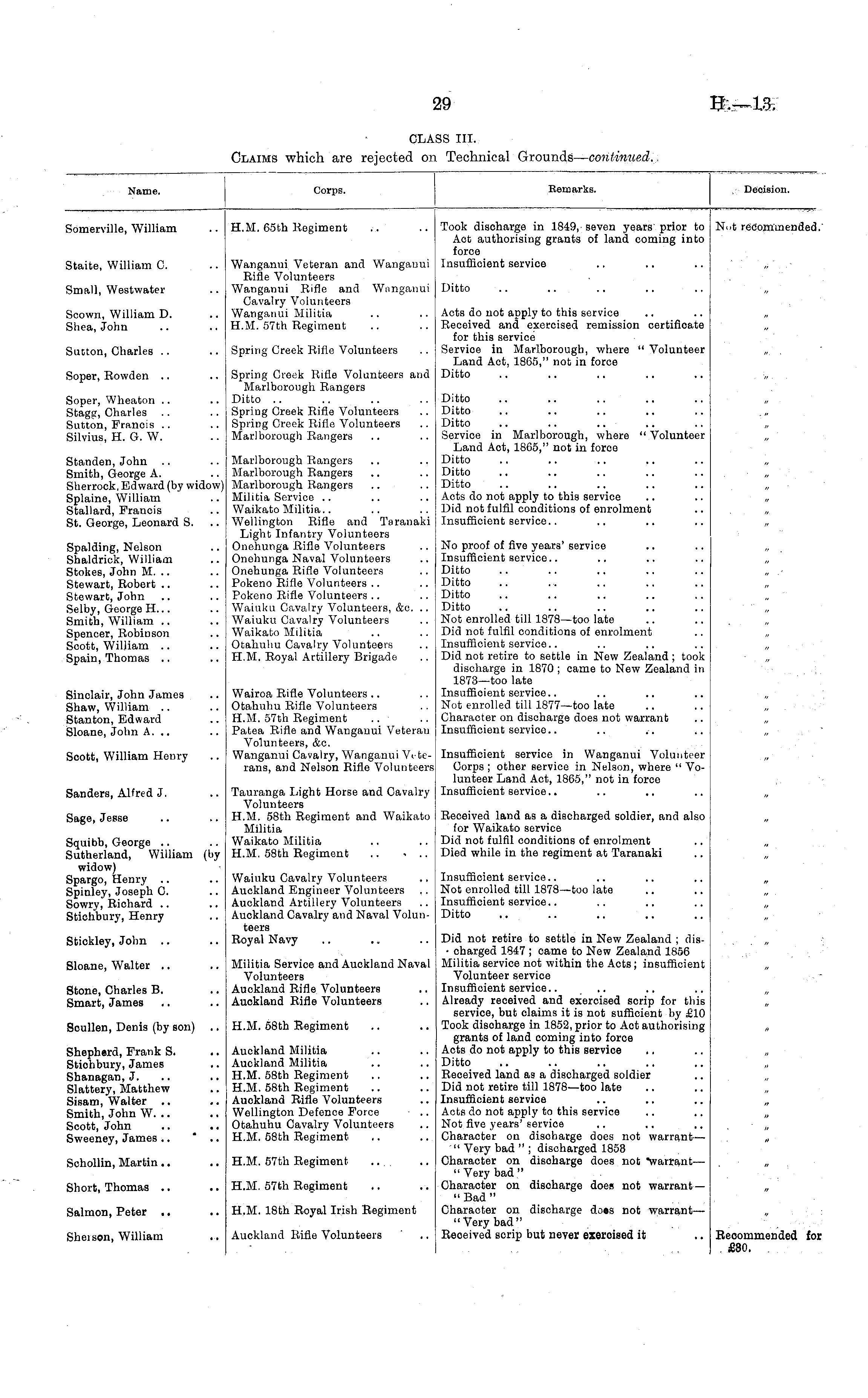 Name. Corps. Remarks. Decision. Somerville, William H.M. 65th Regiment Took discharge in 1849, seven years prior to Act authorising grants of land coming into force Insufficient service Not recommended. Staite, William C. Wanganui Veteran and Wangauui Rifle Volunteers Wanganui Rifle and Wanganui Cavalry Volunteers Wanganui Militia H.M. 57th Regiment Small, We8twater Ditto .. ... Soown, William D. Shea, John Sucton, Charles Spring Creek Rifle Volunteers Acts do not apply to this service Received and exercised remission certificate for this service Service in Marlborough, where " Volunteer Land Act, 1865," not in force Ditto Soper, Rowden .. Spring Creek Rifle Volunteers and Marlborough Rangers Ditto Spring Creek Rifle Volunteers Spring Creek Rifle Volunteers Marlborough Rangers Soper, Wheaton .. Stagp, Charles Sutton, Francis Silvius, H. G. W. ... Standen, John Smith, George A. Sherrock, Edward (by widow) Splaine, William Stallard, Francis St. George, Leonard S. Marlborough Rangers Marlborough Rangers Marlborough Rangers Militia Service Waikato Militia.. Wellington Rifle and Taranaki Light Infantry Volunteers Onehunga Rifle Volunteers Onehunga Naval Volunteers Onehunga Rifle Volunteers Pokeno Rifle Volunteers Pokeno Rifle Volunteers Waiuku Cavalry Volunteers, &c. .. Waiuku Cavalry Volunteers Waikato Militia Otahuhu Cavalry Volunteers H.M. Royal Artillery Brigade Ditto Ditto Ditto Service in Marlborough, where " Volunteer Land Act, 1865," not in force Ditto Ditto Ditto Acts do not apply to this service Did not fulfil conditions of enrolment Insufficient service.. Spalding, Nelson Shaldrick, William Stokes, John M. .. Stewart, Robert Stewart, John Selby, George H... Smith, William .. Spencer, Robinson Scott, William Spain, Thomas No proof of five years' service Insufficient service.. Ditto Ditto Ditto Ditto Not enrolled till 1878—too late Did not fulfil conditions of enrolment Insufficient service.. Did not retire to settle in New Zealand ; took discharge in 1870 ; came to New Zealand in 1873—too late Insufficient service.. Not enrolled till 1877—too late Character on discharge does not warrant Insufficient service.. Sinclair, John James Shaw, William Stanton, Edward Sloane, John A. .. Wairoa Rifle Volunteers Otahuhu Rifle Volunteers H.M. 57th Regiment Patea Rifle and Wanganui Veteran Volunteers, &c. Wanganui Cavalry, Wanganui Veterans, and Nelson Rifle Volunteers Scott, William Henry Insufficient service in Wanganui Volunteer Corps ; other service in Nelson, where " Volunteer Land Act, 1865," not in force Insufficient service.. Sanders, Alfred J. Tauranga Light Horse and Cavalry Volunteers H.M. 58th Regiment and Waikato Militia Waikato Militia H.M. 58th Regiment Sage, Jesse Received land as a discharged soldier, and also for Waikato service Did not fulfil conditions of enrolment Died while in the regiment at Taranaki Squibb, George Sutherland, William (by widow) Spargo, Henry Spinley, Joseph C. Sowry, Richard .. Stichibury, Henry Waiuku Cavalry Volunteers Auckland Engineer Volunteers Auckland Artillery Volunteers Auckland Cavalry and Naval Volunteers Royal Navy Insufficient service.. Not enrolled till 1878—too late Insufficient service.. Ditto Stickley, John Sloane, Walter Stone, Charles B. Smart, James Scullen, Denis (by son) Shepherd, Frank S. Stichbury, James Shanagan, J. Slattery, Matthew Sisam, Walter Smith, John W. .. Scott, John Sweeney, James .. Militia Service and Auckland Naval Volunteers Auckland Rifle Volunteers Auckland Rifle Volunteers H.M. 68th Regiment Auckland Militia Auckland Militia H.M. 58th Regiment H.M. 58th Regiment Auckland Rifle Volunteers Wellington Defence Force Otahuhu Cavalry Volunteers H.M. 58th Regiment Did not retire to settle in New Zealand ; dis- - charged 1847 ; came to New Zealand 1856 Militia service not within the Acts; insufficient Volunteer service Insufficient service.. Already received and exercised scrip for this service, but claims it is not sufficient by £10 Took disoharge in 1852, prior to Act authorising grants of land coming into force Acts do not apply to this service .. Ditto .. Received land as a discharged soldier Did not retire till 1878—too late Insufficient service Acts do not apply to this service Not five years' service Character on discbarge does not warrant— " Very bad " ; discharged 1853 Character on discharge does not "warrant— " Very bad " Character on discharge does not warrant— " Bad " Character on discharge does not warrant — "Very bad" Received scrip but never exercised it Schollin, Martin H.M. 57th Regiment .... Short, Thomas H.M. 57th Regiment Salmon, Peter .. H.M. 18th Royal Irish Regiment Sbei son, William Auckland Rifle Volunteers Beoommended foi