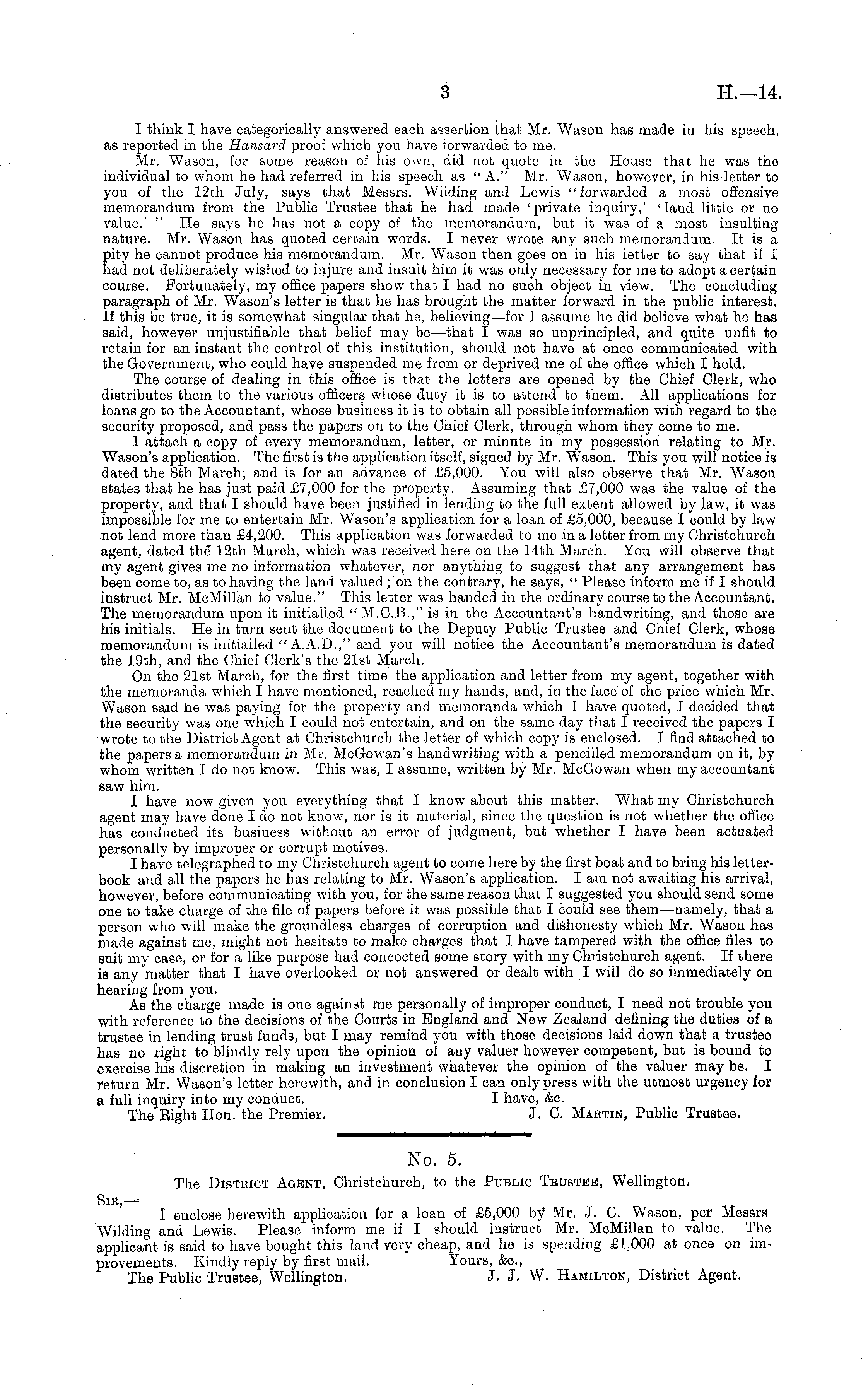 I think I have categorically answered each assertion that Mr. Wason has made in his speech, as reported in the Hansard proof which you have forwarded to me. Mr. Wason, for borne reason of his own, did not quote in the House that he was the individual to whom he had referred in his speech as " A." Mr. Wason, however, in his letter to you of the 12ch July, says that Messrs. Wilding and Lewis "forwarded a most offensive memorandum from the Public Trustee that he had made 'private inquiry,' 'land little or no value.' " He says he has not a copy of the memorandum, but it was of a most insulting nature. Mr. Wason has quoted certain words. I never wrote any such memorandum. It is a pity he cannot produce his memorandum. Mr. Wason then goes on in his letter to say that if I had not deliberately wished to injure and insult him it was only necessary for me to adopt a certain course. Fortunately, my office papers show that I had no such object in view. The concluding paragraph of Mr. Wason's letter is that he has brought the matter forward in the public interest. If this be true, it is somewhat singular that he, believing—for I assume he did believe what he has said, however unjustifiable that belief may be—that I was so unprincipled, and quite unfit to retain for an instant the control of this institution, should not have at once communicated with the Government, who could have suspended me from or deprived me of the office which I hold. The course of dealing in this office is that the letters are opened by the Chief Clerk, who distributes them to the various officers whose duty it is to attend to them. All applications for loans go to the Accountant, whose business it is to obtain all possible information with regard to the security proposed, and pass the papers on to the Chief Clerk, through whom they come to me. I attach a copy of every memorandum, letter, or minute in my possession relating to Mr. Wason's application. The first is the application itself, signed by Mr. Wason. This you will notice is dated the Bth March, and is for an advance of £5,000. You will also observe that Mr. Wason states that he has just paid £7,000 for the property. Assuming that £7,000 was the value of the property, and that I should have been justified in lending to the full extent allowed by law, it was impossible for me to entertain Mr. Wason's application for a loan of £5,000, because I could by law not lend more than £4,200. This application was forwarded to me in a letter from my Christchurch agent, dated the 12th March, which was received here on the 14th March. You will observe that my agent gives me no information whatever, nor anything to suggest that any arrangement has been come to, as to having the land valued ; on the contrary, he says, " Please inform me if I should instruct Mr. McMillan to value." This letter was handed in the ordinary course to the Accountant. The memorandum upon it initialled " M.C.8.," is in the Accountant's handwriting, and those are his initials. He in turn sent the document to the Deputy Public Trustee and Chief Clerk, whose memorandum is initialled " A.A.D.," and you will notice the Accountant's memorandum is dated the 19th, and the Chief Clerk's the 21st March. On the 2lst March, for the first time the application and letter from my agent, together with the memoranda which I have mentioned, reached my hands, and, in the face of the price which Mr. Wason said he was paying for the property and memoranda which 1 have quoted, I decided that the security was one which I could not entertain, and on the same day that I received the papers I wrote to the District Agent at Christchurch the letter of which copy is enclosed. I find attached to the papers a memorandum in Mr. McGowan's handwriting with a pencilled memorandum on it, by whom written Ido not know. This was, I assume, written by Mr. McGowan when my accountant saw him. I have now given you everything that I know about this matter. What my Christchurch agent may have done I do not know, nor is it material, since the question is not whether the office has conducted its business without an error of judgment, but whether I have been actuated personally by improper or corrupt motives. I have telegraphed to my Christchurch agent to come here by the first boat and to bring his letterbook and all the papers he has relating to Mr. Wason's application. lam not awaiting his arrival, however, before communicating with you, for the same reason that I suggested you should send some one to take charge of the file of papers before it was possible that I could see them—namely, that a person who will make the groundless charges of corruption and dishonesty which Mr. Wason has made against me, might not hesitate to make charges that I have tampered with the office files to suit my case, or for a like purpose had concocted some story with my Christchurch agent. If there is any matter that I have overlooked or not answered or dealt with I will do so immediately on hearing from you. As the charge made is one against me personally of improper conduct, I need not trouble you with reference to the decisions of the Courts in England and New Zealand defining the duties of a trustee in lending trust funds, but I may remind you with those decisions laid down that a trustee has no right to blindly rely upon the opinion of any valuer however competent, but is bound to exercise his discretion "in making an investment whatever the opinion of the valuer may be. I return Mr. Wason's letter herewith, and in conclusion I can only press with the utmost urgency for a full inquiry into my conduct. I have, &c. The Bight Hon. the Premier. J. C. Maetin, Public Trustee.