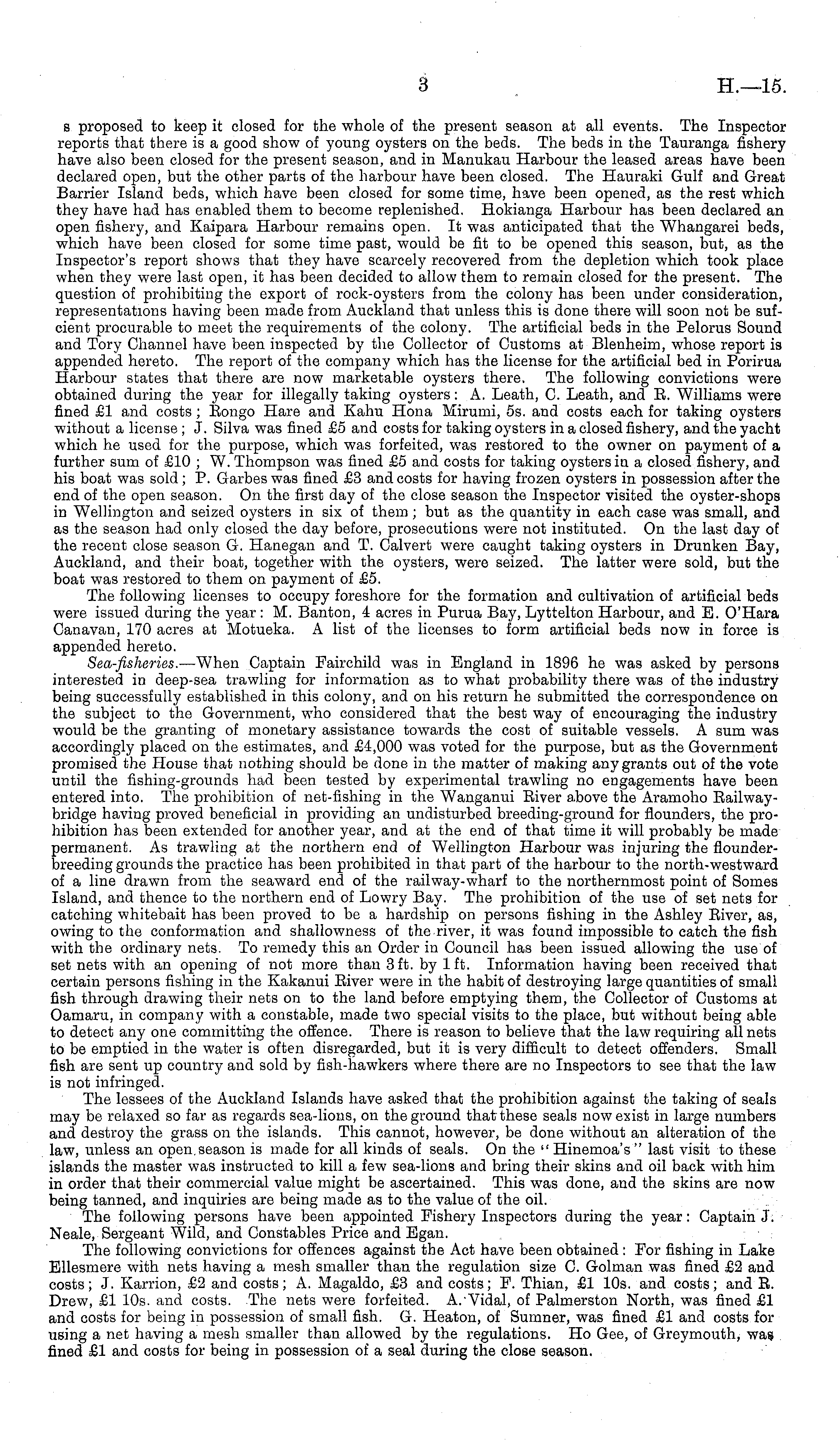 s proposed to keep it closed for the whole of the present season at all events. The Inspector reports that there is a good show of young oysters on the beds. The beds in the Tauranga fishery have also been closed for the present season, and in Manukau Harbour the leased areas have been declared open, but the other parts of the harbour have been closed. The Hauraki Gulf and Great Barrier Island, beds, which have been closed for some time, have been opened, as the rest which they have had has enabled them to become replenished. Hokianga Harbour has been declared an open fishery, and Kaipara Harbour remains open. It was anticipated that the Whangarei beds, which have been closed for some time past, would be fit to be opened this season, but, as the Inspector's report shows that they have scarcely recovered from the depletion which took place when they were last open, it has been decided to allow them to remain closed for the present. The question of prohibiting the export of rock-oysters from the colony has been under consideration, representations having been made from Auckland that unless this is done there will soon not be sufcient procurable to meet the requirements of the colony. The artificial beds in the Pelorus Sound and Tory Channel have been inspected by the Collector of Customs at Blenheim, whose report is appended hereto. The report of the company which has the license for the artificial bed in Porirua Harbour states that there are now marketable oysters there, The following convictions were obtained during the year for illegally taking oysters: A. Leath, C. Leath, and B. Williams were fined £1 and costs; Bongo Hare and Kahu Hona Mirumi, ss. and costs each for taking oysters without a license; J. Silva was fined £5 and costs for taking oysters in a closed fishery, and the yacht which he used for the purpose, which was forfeited, was restored to the owner on payment of a further sum of £10 ; W. Thompson was fined £5 and costs for taking oysters in a closed fishery, and his boat was sold; P. Garbes was fined £3 and costs for having frozen oysters in possession after the end of the open season. On the first day of the close season the Inspector visited the oyster-shops in Wellington and seized oysters in six of them ; but as the quantity in each case was small, and as the season had only closed the day before, prosecutions were not instituted. On the last day of the recent close season G. Hanegan and T. Calvert were caught taking oysters in Drunken Bay, Auckland, and their boat, together with the oysters, were seized. The latter were sold, but the boat was restored to them on payment of £5. The following licenses to occupy foreshore for the formation and cultivation of artificial beds were issued during the year: M. Banton, 4 acres in Purua Bay, Lyttelton Harbour, and E. O'Hara Canavan, 170 acres at Motueka. A list of the licenses to form artificial beds now in force is appended hereto. Sea-fisheries. —When Captain Fairchild was in England in 1896 he was asked by persons interested in deep-sea trawling for information as to what probability there was of the industry being successfully established in this colony, and on his return he submitted the correspondence on the subject to the Government, who considered that the best way of encouraging the industry would be the granting of monetary assistance towards the cost of suitable vessels. A sum was accordingly placed on the estimates, and £4,000 was voted for the purpose, but as the Government promised the House that nothing should be done in the matter of making any grants out of the vote until the fishing-grounds had been tested by experimental trawling no engagements have been entered into. The prohibition of net-fishing in the Wanganui Eiver above the Aramoho Bailwaybridge having proved beneficial in providing an undisturbed breeding-ground for flounders, the prohibition has been extended for another year, and at the end of that time it will probably be made permanent. As trawling at the northern end of Wellington Harbour was injuring the flounderbreeding grounds the practice has been prohibited in that part of the harbour to the north-westward of a line drawn from the seaward end of the railway-wharf to the northernmost point of Somes Island, and thence to the northern end of Lowry Bay. The prohibition of the use of set nets for catching whitebait has been proved to be a hardship on persons fishing in the Ashley Eiver, as, owing to the conformation and shallowness of the river, it was found impossible to catch the fish with the ordinary nets. To remedy this an Order in Council has been issued allowing the use of set nets with an opening of not more than 3 ft. by lft. Information having been received that certain persons fishing in the Kakanui Eiver were in the habit of destroying large quantities of small fish through drawing their nets on to the land before emptying them, the Collector of Customs at Oamaru, in company with a constable, made two special visits to the place, but without being able to detect any one committing the offence. There is reason to believe that the law requiring all nets to be emptied in the water is often disregarded, but it is very difficult to detect offenders. Small fish are sent up country and sold by fish-hawkers where there are no Inspectors to see that the law is not infringed. The lessees of the Auckland Islands have asked that the prohibition against the taking of seals may be relaxed so far as regards sea-lions, on the ground that these seals now exist in large numbers and destroy the grass on the islands. This cannot, however, be done without an alteration of the law, unless an open, season is made for all kinds of seals. On the " Hinemoa's " last visit to these islands the master was instructed to kill a few sea-lions and bring their skins and oil back with him in order that their commercial value might be ascertained. This was done, and the skins are now being tanned, and inquiries 