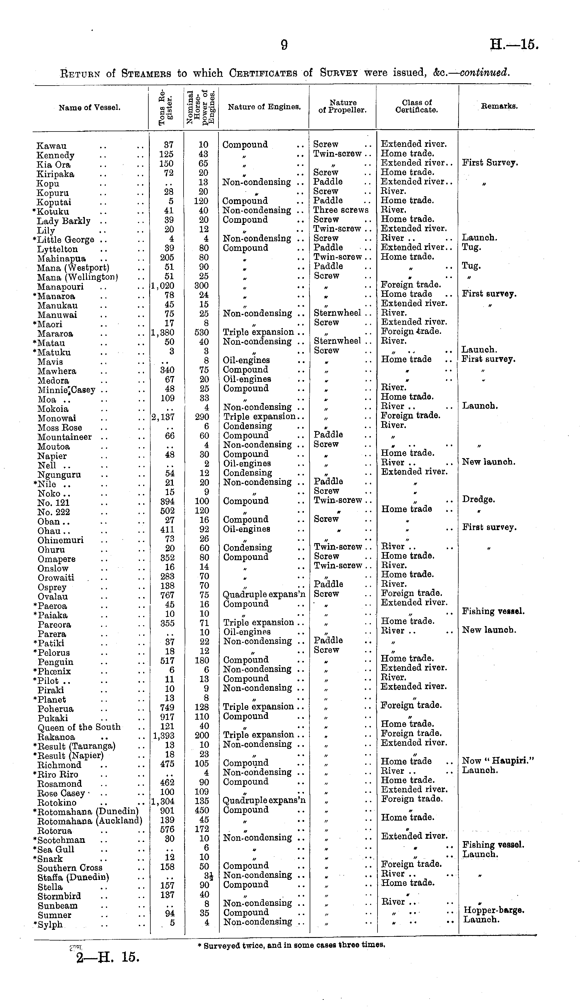 Name of Vessel. i Si O M EH |i°8 M W fl Nature ol Engines. Nature of Propeller. Class of Certificate. Kemarke. Kawau Kennedy Kia Ora Kiripaka Kopu Kopuru Koputai •Kotuku Lady Barkly Lily ♦Little George Lyttelton Mahinapua Mana (Weetport) Mana (Wellington) Manapouri *Manaroa Manukau Manuwai *Maori Mararoa •Matau •Matuku Mavis Mawhera Medora MinniejOasey Moa Mokoia Monowai Moss Eose Mountaineer Moutoa Napier Nell .. Ngunguru •Nile .. Noko No. 121 No. 222 Oban Ohau Ohinemuri Ohuru Omapere Onslow Orowaiti ... Osprey Ovalau •Paeroa •Paiaka Pareora Parera •Patiki *Peloru3 Penguin •Phcenix ♦Pilot .. Piraki *Planet Poherua Pukaki Queen of the South Eakanoa •Result (Tauranga) ♦Eesult (Napier) Bichmond *Riro Riro Eosamond Eose Casey • .. Eotokino •Eotomahana (Dunedin) Eotomahana (Auckland) Eotorua •Scotchman •Sea Gull •Snark Southern Cross Stafia (Dunedin) Stella Stormbird Sunbeam Sumner •Sylph 3Y 125 150 72 10 43 65 20 13 20 120 40 20 12 4 80 80 90 25 300 24 15 25 8 530 40 3 8 75 20 25 33 4 290 6 60 4 30 2 12 20 9 100 120 16 92 26 60 80 14 70 70 75 16 10 71 10 22 12 180 6 13 9 8 128 110 40 200 10 23 105 4 90 109 135 450 45 172 10 6 10 50 H 90 40 8 35 4 Compound u • • Screw Twin-screw .. Screw Paddle Screw Paddle Three screws Screw Twin-screw .. Screw Paddle Twin-screw .. Paddle Screw Extended river. Home trade. Extended river.. Home trade. Extended river.. Eiver. Home trade. Eiver. Home trade. Extended river. Eiver Extended river.. Home trade. First Survey. Non-condensing .. 28 5 41 39 20 4 39 205 51 51 1,020 78 45 75 17 1,380 50 3 Compound Non-condensing .. Compound Non-condensing .. Compound Launch. Tug. Tug. Non-condensing .. # • ■ Sternwheel .. Screw * • • Foreign trade. Home trade Extended river. Eiver. Extended river. Foreign <trade. Eiver. First survey. Triple expansion .. Non-condensing .. Sternwheel .. Screw Launch. First survey. 340 67 48 109 Oil-engines Compound Oil-engines Compound Home trade Non-oondensing .. Triple expansion.. Condensing Compound Non-condensing .. Compound Oil-engines Condensing Non-condensing .. Eiver. Home trade. Eiver Foreign trade. Eiver. Launch. 2,137 66 Paddle !! Screw 48 * • • 0 • • • • Home trade. Eiver Extended river. New launoh. 54 21 15 894 502 27 411 73 20 352 16 283 138 767 45 10 355 Compound Compound Oil-engines Condensing Compound Paddle '.'. Screw Twin-sorew .. Screw Twin-screw .. Screw Twin-screw .. Home trade H Eiver Home trade. Eiver. Home trade. Eiver. Foreign trade. Extended river. Dredge. First survey. Quadruple expans'n Compound Paddle !! Screw Fishing veeeel. Triple expansion .. Oil-engines Non-condensing .. Home trade. Eiver New launoh. 37 18 517 6 11 10 13 749 917 121 1,393 13 18 475 Paddle Screw Compound Non-condensing .. Compound Non-condensing .. Home trade. Extended river. River. Extended river. Triple expansion .. Compound Foreign trade. Now " Haupiri." Launoh. Triple expansion .. Non-condensing .. tt Home trade. Foreign trade. Extended river. 462 100 1,304 901 139 576 30 Compound Non-condensing .. Compound Home trade River Home trade. Extended river. Foreign trade. Quadruple expans'n Compound Non-condensing .. Home trade. Extended river. Fishing vessel. Launch. 12 158 Compound Non-condensing .. Compound Foreign trade. Eiver Home trade. 157 137 Non-condensing .. Compound Non-condensing .. Eiver 94 5 Hopper-barge. Launoh. am, * Surveyed twice, and in some cases three times.