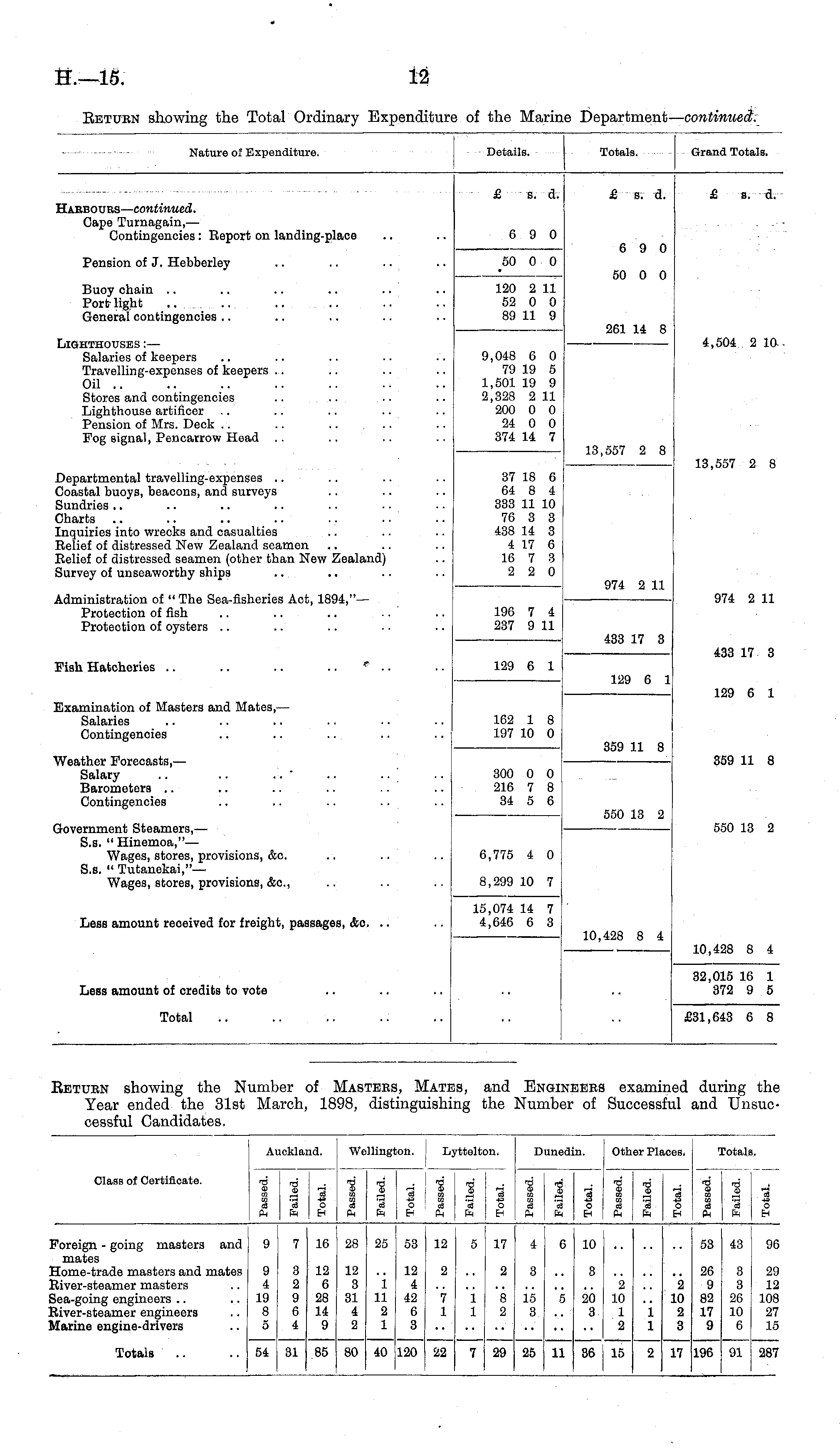 Nature of Expenditure. Details. Totals. Grand Totals. Harboubs — continued. Cape Turnagain,— Contingencies : Report on landing-place £ S. d. £ s. d. £ s. d. 6 9 0 6 9 0 Pension of J. Hebberley 50 0 0 50 0 0 Buoy chain Port light General contingencies 120 2 11 52 0 0 89 11 9 4,504 2 Iα - 261 14 8 Lighthouses :— Salaries of keepers Travelling-expenses of keepers Oil .. Stores and contingencies Lighthouse artificer Pension of Mrs. Deck Fog signal, Pencarrow Head 9,048 6 0 79 19 5 1,501 19 9 2,328 2 11 200 0 0 24 0 0 374 14 7 13,557 2 8 13,557 2 8 Departmental travelling-expenses Coastal buoys, beacons, and surveys Sundries Charts Inquiries into wrecks and casualties Relief of distressed New Zealand seamen Relief of distressed seamen (other than New Zealand) Survey of unseaworthy ships 37 18 6 64 8 4 333 11 10 76 3 3 438 14 3 4 17 6 16 7 3 2 2 0 974 2 11 Administration of " The Sea-fisheries Act, 1894," — Protection of fish Protection of oysters 196 7 4 237 9 11 974 2 11 Fish Hatcheries .. .. .. .. r ■ ■ 433 17 3 433 17 3 129 6 1 Examination of Masters and Mates, — Salaries Contingencies 129 6 1 129 6 1 162 1 8 197 10 0 Weather Forecasts, — Salary .. .. .. ' Barometers Contingencies 359 11 8 359 11 8 300 0 0 216 7 8 34 5 6 550 13 2 550 13 2 Government Steamers, — S.s. " Hinemoa," — Wages, stores, provisions, &c. S.s. " Tutanekai," — Wages, stores, provisions, &c, 6,775 4 0 8,299 10 7 Less amount received for freight, passages, &o. .. 15,074 14 7 4,646 6 3 10,428 8 4 10,428 8 4 Less amount of credits to vote 32,015 16 1 372 9 5 Total £31,643 6 8