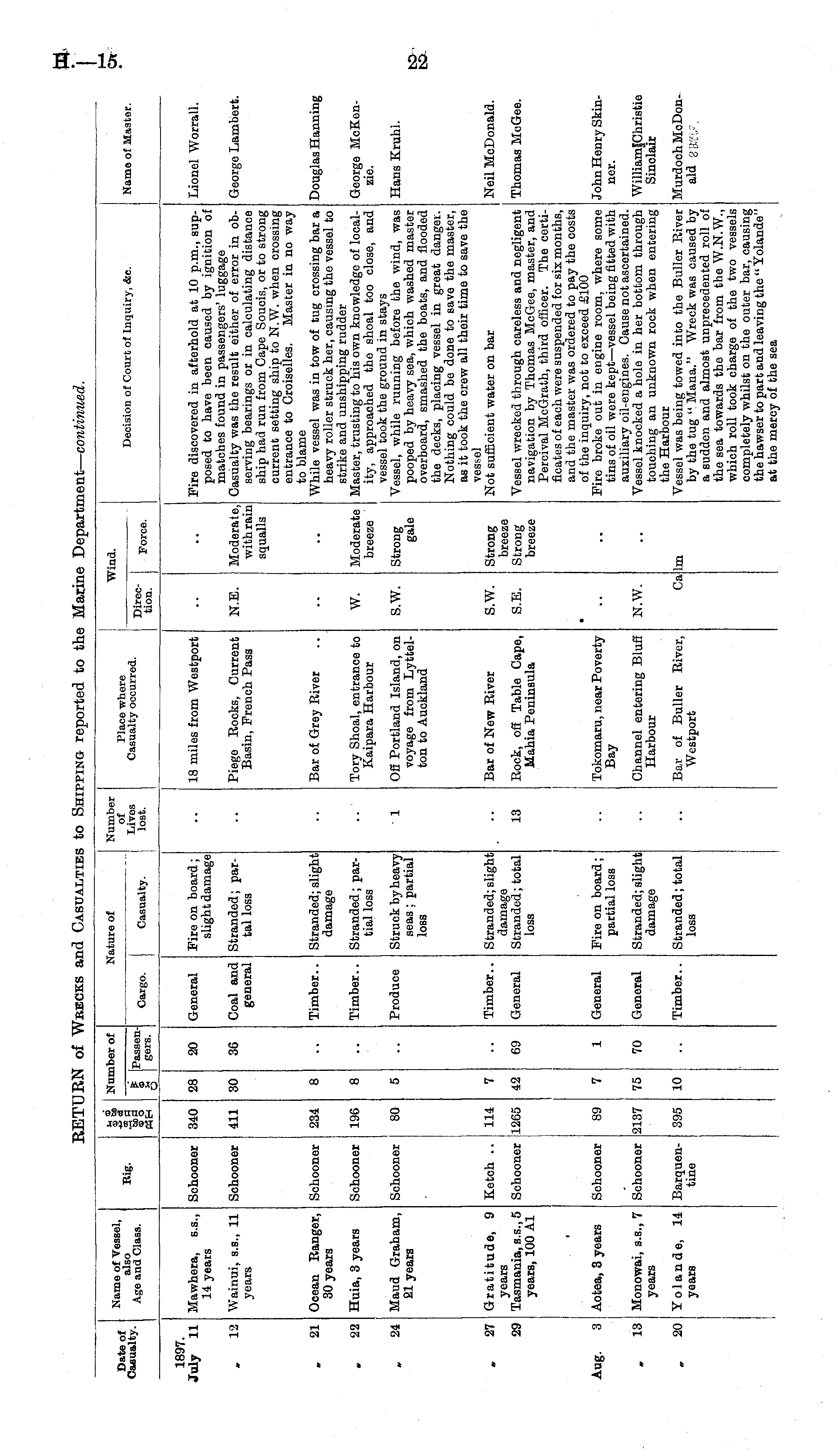Date of Casualty. Name of Vessel, also Age and Class. Eig. Number of Nature of Number of Lives lost. Place where Casualty occurred. Win Direction. Wind. nd. Force. Decision of Court of Inquiry, &c. Name of Master. •Eta MB Passen5 gers - Cargo. Casualty. 1897. July 11 Mawhera, b.s., 14 years Schooner 340 28 20 General Fire on board; slight damage 18 miles from Wesfcport Fire discovered in afterhold at 10 p.m., supposed to have been caused by ignition of matches found in passengers' luggage Casualty was the result either of error in observing bearings or in calculating distance ship had run from Cape Soucis, or to strong current setting ship to N.W. when crossing entrance to Croiselles. Master in no way to blame While vessel was in tow of tug crossing bar a heavy roller struck her, causing the vessel to strike and unshipping rudder Master, trusting to his own knowledge of locality, approached the shoal too close, and vessel took the ground in stays Vessel, while running before the wind, was pooped by heavy sea, which washed master overboard, smashed the boats, and flooded the decks, placing vessel in great danger. Nothing could be done to save the master, as it took the crew all their time to save the vessel Not sufficient water on bar Lionel Worrall. . 12 Wainui, a.8., 11 years Schooner 411 30 36 Coal and general Stranded; partal loss Piege Rocks, Current Basin, French Pass N.E. Moderate, with rain squalls George Lambert. . 21 Ocean Banger, 30 years Timber.. Stranded; slight damage Bar of Grey River Douglas Harming Schooner 234 . 22 Huia, 3 years Schooner 196 Timber.. Stranded; partial loss Tory Shoal, entrance to Kaipara Harbour W. Moderate breeze i George McKenzie. » 24 Maud Graham, 21 years Schooner 80 Produce Struck by heavy seas; partial loss 1 OS Portland Island, on voyage from Lyttelton to Auckland S.W. Strong gale Hans Kruhl. . 27 Gratitude, 9 years Tasmania, s.s., 5 years, 100 Al Stranded; slight damage Stranded; total loss i Bar of New River Neil McDonald. Ketch .. 114 7 Timber.. S.W. Strong breeze Strong breeze 29 Schooner 1265 42 69 General 13 Rock, ofi Table Cape, Mahia Peninsula S.E. Vessel wrecked through careless and negligent navigation by Thomas McGee, master, and Percival McGrath, third officer. The certificates of each were suspended for six months, and the master was ordered to pay the costs of the inquiry, not to exceed £100 Fire broke out in engine room, where some tins of oil were kept —vessel being fitted with auxiliary oil-engines. Cause not ascertained. Vessel knocked a hole in her bottom through touching an unknown rock when entering the Harbour Vessel was being towed into the Buller River by the tug " Mana." Wreck was caused by a sudden and almost unprecedented roll of the sea towards the bar from the W.N.W., which roll took charge of the two vessels completely whilst on the outer bar, causing the hawser to part and leaving the " Yolande" at the mercy of the sea Thomas McGee. Aug. 3 Aotea, 3 years Tokomaru, near Poverty Bay • John Henry SkinSchooner 89 1 General Fire on board; partial loss Schooner ner. . 13 Monowai, s.s., 7 years 2137 75 70 General Stranded; slight damage Channel entering Bluff Harbour N.W. WilliamfChristie Sinclair „ 20 Y o 1 a n d e, 14 years Barquentine 395 10 Timber.. Stranded; total loss Bar of Buller River, Westport Ca lm Murdoch McDonald £