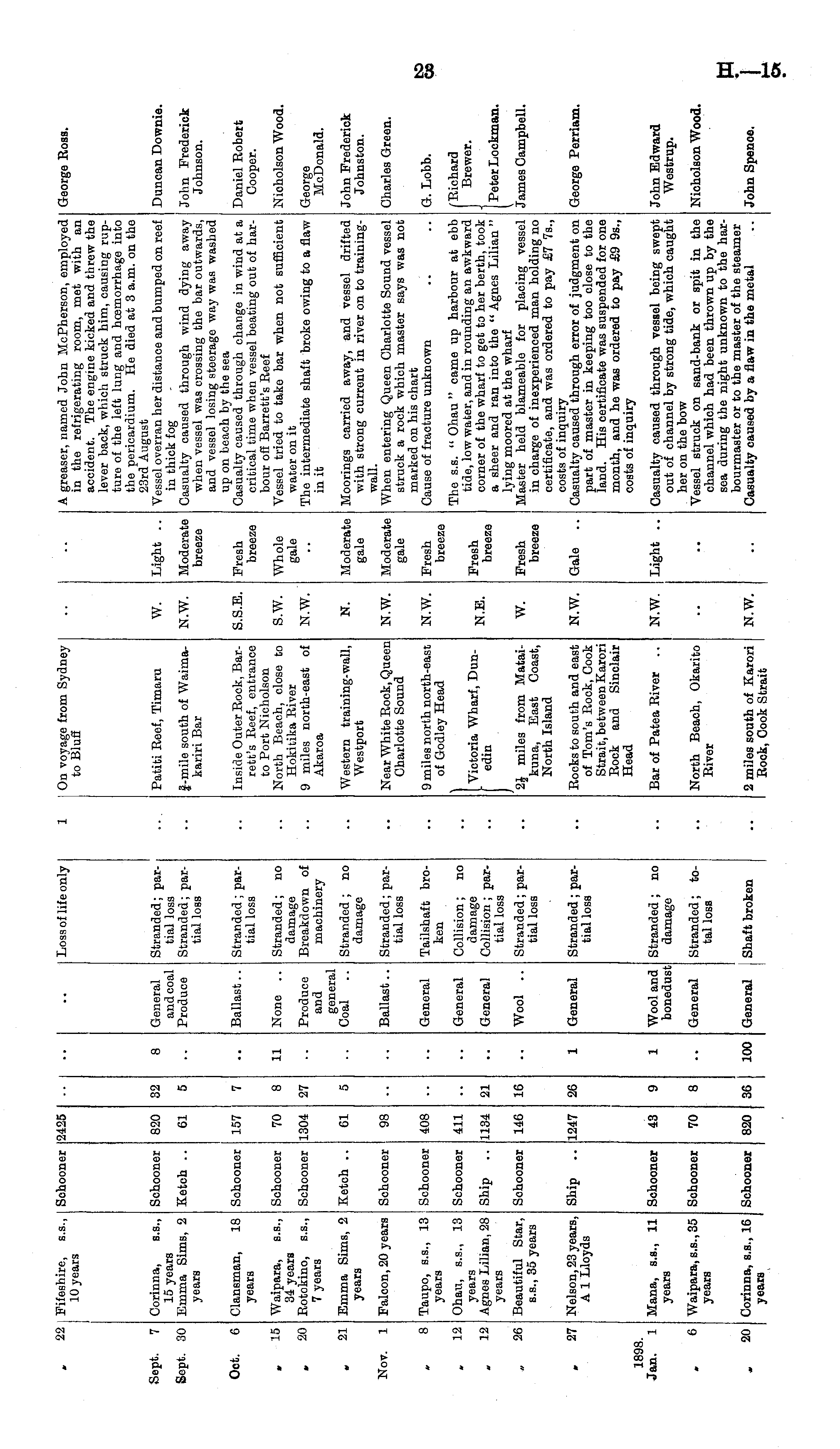 „ 2Z Fifeehire, s.s., 10 years looner Loss of life only On voyage from Sydney to Bluff A greaser, named John McPherson, employed in the refrigerating room, met with an accident. The engine kicked and threw the lever back, which struck him, causing rupture of the left lung and hcamorrhage into the pericardium. He died at 3 a.m. on the 23rd August Vessel overran her distance and bumped on reef in thick fog Casualty caused through wind dying away when vessel was crossing the bar outwards, and vessel losing steerage way was washed up on beach by the sea Casualty caused through change in wind at a critical time when vessel beating out of harbour off Barrett's Reef Vessel tried to take bar when not sufficient water on it The intermediate shaft broke owing to a flaw in it George Ross. Sept. 7 Corinna, s.s., 15 years Emma Sims, 2 years Stranded; partial loss Stranded; partial loss Patiti Reef, Timaru Duncan Downie Sohooner 820 32 8 General and coal Produce W. Light .. Sept. 30 Ketoh .. 61 5 j-mile south of Waimakariri Bar N.W. Moderate breeze John Frederick Johnson. Oct. 6 Clansman, 18 years Sohooner 157 Ballast.. Stranded; partial loss Inside Outer Rook, Barrett's Beef, entrance to Port Nicholson North Beach, close to Hokitika River 9 miles north-east of Akaroa S.S.E. Fresh breeze Daniel Robert Cooper. . 15 Waipara, e.s., 34 years Rotokino, s.s., 7 years Schooner 70 8 11 None .. Stranded; no damage Breakdown of machinery S.W. Whole gale Nicholson Wood . 20 Schooner 1304 27 Produce and general Coal .. N.W. George McDonald. . 21 Emma Sims, 2 years Ketch .. 61 Stranded ; no damage Western training-wall, Westport N. Moderate gale Moorings carried away, and vessel drifted with strong current in river on to trainingwall. When entering Queen Charlotte Sound vessel struck a rock which master says was not marked on his chart Cause of fracture unknown John Frederick Johnston. Nov. 1 Falcon, 20 years Schooner 98 Ballast.. Stranded; partial loss Near White Rook, Queen Charlotte Sound N.W. Moderate gale Charles Green. 8 Taupo, s.s., 13 years Ohau, s.s., 13 years Agnes Lilian, 28 years Schooner 408 General Tailshaft broken 9 miles north north-east of Godley Head N.W. Fresh breeze G. Lobb. 12 Sohooner 411 General Collision; no damage Collision; partial loss I Victoria Wharf, Dunedin 2J miles from Mataikuna, East Coast, North Island N.E. The s.s. " Ohau " came up harbour at ebb tide, low water, and in rounding an awkward corner of the wharf to get to her berth, took a sheer and ran into the " Agnes Lilian " lying moored at the wharf Master held blameable for placing vessel in charge of inexperienced man holding no certificate, and was ordered to pay £7 7s., costs of inquiry Casualty caused through error of judgment on part of master in keeping too close to the land. His certificate was suspended for one month, and he was ordered to pay £9 9s., costs of inquiry I Richard Brewer. Peter Lockmar James Campbell 12 Ship .. 1134 21 General Fresh breeze 26 Beautiful Star, s.s., 35 years Sohooner 146 Wool .. Stranded; partial loss W. Fresh breeze 16 . 27 Nelson, 23 years, A 1 Lloyds Ship .. General Stranded; partial loss Rocks to south and east of Tom's Rock, Cook Strait, between Karori Rock and Sinclair Head N.W. Gale .. George Perriam 1247 26 1898. Jan. 1 Mana, s.s., 11 years Stranded ; no damage John Edward Westrup. Schooner 43 Wool and bonedust Bar of Patea River N.W. Light .. Casualty caused through vessel being swept out of channel by strong tide, which caught her on the bow Vessel struck on sand-bank or spit in the channel which had been thrown up by the sea during the night unknown to the harbourmaster or to the master of the steamer Casualty caused by a flaw in the metal 6 Waipara, s.s., 35 years Schooner 70 General Stranded; total loss North Beach, Okarito River Nicholson Wood 20 Corinna, s.s., 16 years Schooner General ! Shaft broken 2 miles south of Karori Rock, Cook Strait N.W. John Spence. 820 36 100