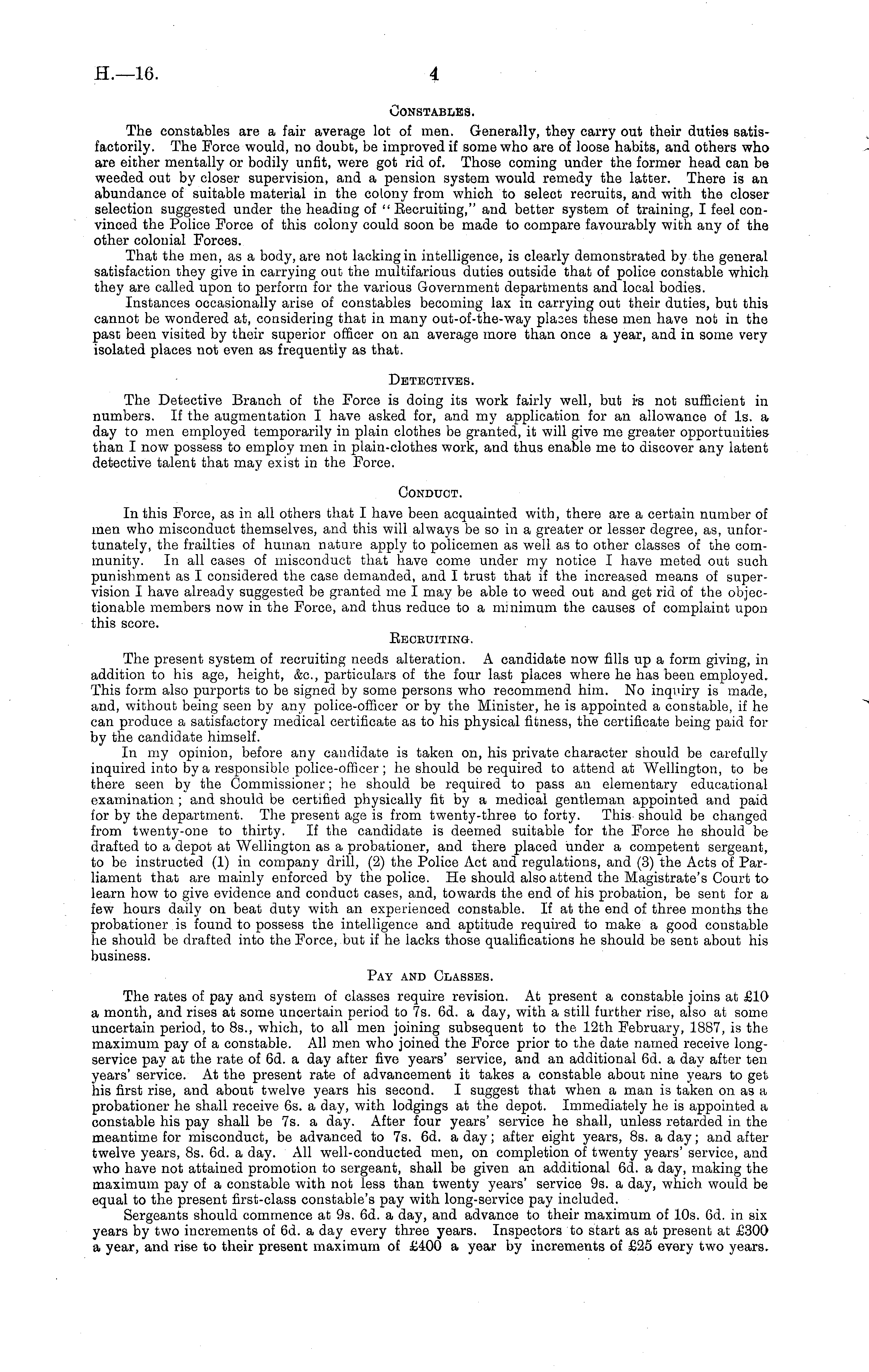 Constables. The constables are a fair average lot of men. Generally, they carry out their duties satisfactorily. The Force would, no doubt, be improved if some who are of loose habits, and others who are either mentally or bodily unfit, were got rid of. Those coming under the former head can be weeded out by closer supervision, and a pension system would remedy the latter. There is an abundance of suitable material in the colony from which to select recruits, and with the closer selection suggested under the heading of "Recruiting," and better system of training, I feel convinced the Police Force of this colony could soon be made to compare favourably with any of the other colonial Forces. That the men, as a body, are not lacking in intelligence, is clearly demonstrated by the general satisfaction they give in carrying out the multifarious duties outside that of police constable which they are called upon to perform for the various Government departments and local bodies. Instances occasionally arise of constables becoming lax in carrying out their duties, but this cannot be wondered at, considering that in many out-of-the-way places these men have not in the past been visited by their superior officer on an average more than once a year, and in some very isolated places not even as frequently as that. Detectives. The Detective Branch of the Force is doing its work fairly well, but re not sufficient in numbers. If the augmentation I have asked for, and my application for an allowance of Is. a day to men employed temporarily in plain clothes be granted, it will give me greater opportunities than I now possess to employ men in plain-clothes work, and thus enable me to discover any latent detective talent that may exist in the Force. Conduct. In this Force, as in all others that I have been acquainted with, there are a certain number of men who misconduct themselves, and this will always be so in a greater or lesser degree, as, unfortunately, the frailties of human nature apply to policemen as well as to other classes of the community. In all cases of misconduct that have come under my notice I have meted out such punishment as I considered the case demanded, and I trust that if the increased means of supervision I have already suggested be granted me I may be able to weed out and get rid of the objectionable members now in the Force, and thus reduce to a minimum the causes of complaint upon this score. Eeceuiting. The present system of recruiting needs alteration. A candidate now fills up a form giving, in addition to his age, height, &c, particulars of the four last places where he has been employed. This form also purports to be signed by some persons who recommend him. No inqiiiry is made, and, without being seen by any police-officer or by the Minister, he is appointed a constable, if he can produce a satisfactory medical certificate as to his physical fitness, the certificate being paid for by the candidate himself. In my opinion, before any candidate is taken on, his private character should be carefully inquired into by a responsible police-officer; he should be required to attend at Wellington, to be there seen by the Commissioner; he should be required to pass an elementary educational examination ; and should be certified physically fit by a medical gentleman appointed and paid for by the department. The present age is from twenty-three to forty. This should be changed from twenty-one to thirty. If the candidate is deemed suitable for the Force he should be drafted to a depot at Wellington as a probationer, and there placed under a competent sergeant, to be instructed (1) in company drill, (2) the Police Act and regulations, and (3) the Acts of Parliament that are mainly enforced by the police. He should also attend the Magistrate's Court to learn how to give evidence and conduct cases, and, towards the end of his probation, be sent for a few hours daily on beat duty with an experienced constable. If at the end of three months the probationer is found to possess the intelligence and aptitude required to make a good constable he should be drafted into the Force, but if he lacks those qualifications he should be sent about his business. Pay and Classes. The rates of pay and system of classes require revision. At present a constable joins at £10 a month, and rises at some uncertain period to 7s. 6d. a day, with a still further rise, also at some uncertain period, to Bs., which, to all men joining subsequent to the 12th February, 1887, is the maximum pay of a constable. All men who joined the Force prior to the date named receive longservice pay at the rate of 6d. a day after five years' service, and an additional 6d. a day after ten years' service. At the present rate of advancement it takes a constable about nine years to get his first rise, and about twelve years his second. I suggest that when a man is taken on as a probationer he shall receive 6s. a day, with lodgings at the depot. Immediately he is appointed a constable his pay shall be 7s. a day. After four years' service he shall, unless retarded in the meantime for misconduct, be advanced to 7s. 6d. a day; after eight years, Bs. a day; and after twelve years, Bs. 6d. a day. All well-conducted men, on completion of twenty years' service, and who have not attained promotion to sergeant, shall be given an additional 6d. a day, making the maximum pay of a constable with not less than twenty years' service 9s. a day, which would be equal to the present first-class constable's pay with long-service pay included. Sergeants should commence at 9s. 6d. a day, and advance to their maximum of 10s. 6d. in six years by two increments of 6d. a day every three years. Inspectors to start as at present at £300 a year, and rise to their present maximum of £400 a year by increments of £25 every two years.