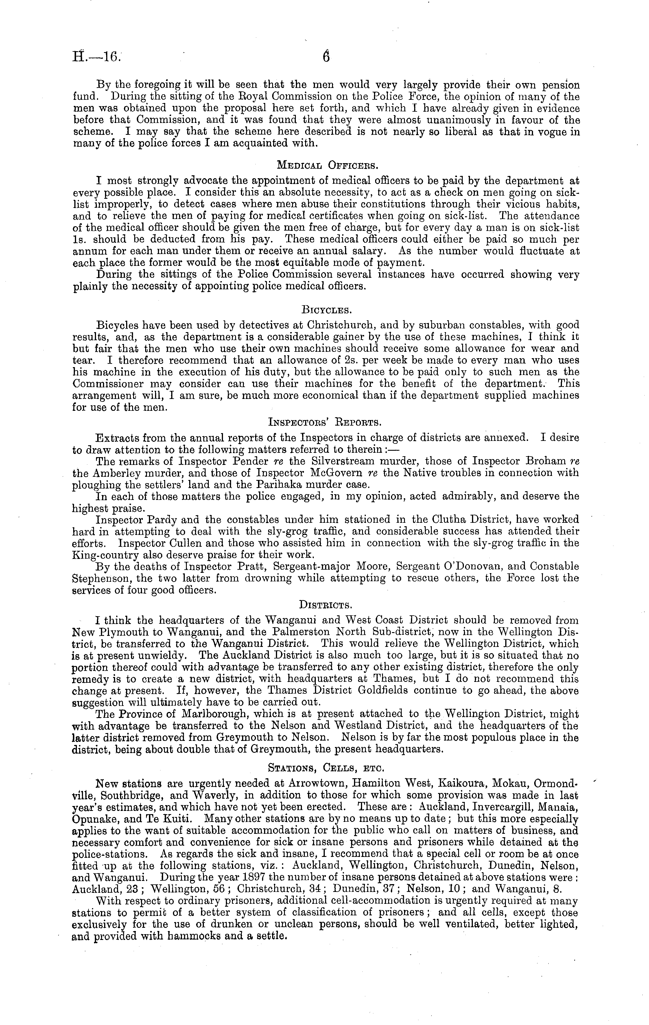 By the foregoing it will be seen that the men would very largely provide their own pension fund. During the sitting of the Eoyal Commission on the Police Force, the opinion of many of the men was obtained upon the proposal here set forth, and which I have already given in evidence before that Commission, and it was found that they were almost unanimously in favour of the scheme. I may say that the scheme here described is not nearly so liberal as that in vogue in many of the police forces I am acquainted with. Medical Opficbks. I most strongly advocate the appointment of medical officers to be paid by the department at every possible place. I consider this an absolute necessity, to act as a check on men going on sicklist improperly, to detect cases where men abuse their constitutions through their vicious habits, and to relieve the men of paying for medical certificates when going on sick-list. The attendance of the medical officer should be given the men free of charge, but for every day a man is on sick-list Is. should be deducted from his pay. These medical officers could either be paid so much per annum for each man under them or receive an annual salary. As the number would fluctuate at each place the former would be the most equitable mode of payment. During the sittings of the Police Commission several instances have occurred showing very plainly the necessity of appointing police medical officers. Bicycles. Bicycles have been used by detectives at Christchurch, and by suburban constables, with good results, and, as the department is a considerable gainer by the use of these machines, I think it but fair that the men who use their own machines should receive some allowance for wear and tear. I therefore recommend that an allowance of 2s. per week be made to every man who uses his machine in the execution of his duty, but the allowance to be paid only to such men as the Commissioner may consider can use their machines for the benefit of the department. This arrangement will, I am sure, be much more economical than if the department supplied machines for use of the men. Inspectoes' Bepoets. Extracts from the annual reports of the Inspectors in charge of districts are annexed. I desire to draw attention to the following matters referred to therein: — The remarks of Inspector Pender re the Silverstream murder, those of Inspector Broham re the Amberley murder, and those of Inspector McGovern re the Native troubles in connection with ploughing the settlers' land and the Parihaka murder case. In each of those matters the police engaged, in my opinion, acted admirably, and deserve the highest praise. Inspector Pardy and the constables under him stationed in the Clutha District, have worked hard in attempting to deal with the sly-grog traffic, and considerable success has attended their efforts. Inspector Cullen and those who assisted him in connection with the sly-grog traffic in the King-country also deserve praise for their work. By the deaths of Inspector Pratt, Sergeant-major Moore, Sergeant O'Donovan, and Constable Stephenson, the two latter from drowning while attempting to rescue others, the Force lost the services of four good officers. Disteicts. I think the headquarters of the Wanganui and West Coast District should be removed from New Plymouth to Wanganui, and the Palmerston North Sub-district, now in the Wellington District, be transferred to the Wanganui District. This would relieve the Wellington District, which is at present unwieldy. The Auckland District is also much too large, but it is so situated that no portion thereof could with advantage be transferred to any other existing district, therefore the only remedy is to create a new district, with headquarters at Thames, but I do not recommend this change at present. If, however, the Thames District Goldfields continue to go ahead, the above suggestion will ultimately have to be carried out. The Province of Marlborough, which is at present attached to the Wellington District, might with advantage be transferred to the Nelson and Westland District, and the headquarters of the latter district removed from Greymouth to Nelson. Nelson is by far the most populous place in the district, being about double that of Greymouth, the present headquarters. Stations, Cells, etc. New stations are urgently needed at Arrowtown, Hamilton West, Kaikoura, Mokau, Ormondville, Southbridge, and Waverly, in addition to those for which some provision was made in last year's estimates, and which have not yet been erected. These are : Auckland, Invercargill, Mauaia, Opunake, and Te Kuiti. Many other stations are by no means up to date ; but this more especially applies to the want of suitable accommodation for the public who call on matters of business, and necessary comfort and convenience for sick or insane persons and prisoners while detained at the police-stations. As regards the sick and insane, I recommend that a special cell or room be at once fitted up ac the following stations, viz. : Auckland, Wellington, Christchurch, Dunedin, Nelson, and Wanganui. During the year 1897 the number of insane persons detained at above stations were ; Auckland, 23 ; Wellington, 56 ; Christchurch, 34; Dunedin, 37 ; Nelson, 10 ; and Wanganui, 8. With respect to ordinary prisoners, additional cell-accommodation is urgently required at many stations to permit of a better system of classification of prisoners; and all cells, except those exclusively for the use of drunken or unclean persons, should be well ventilated, better lighted, and provided with hammocks and a settle.
