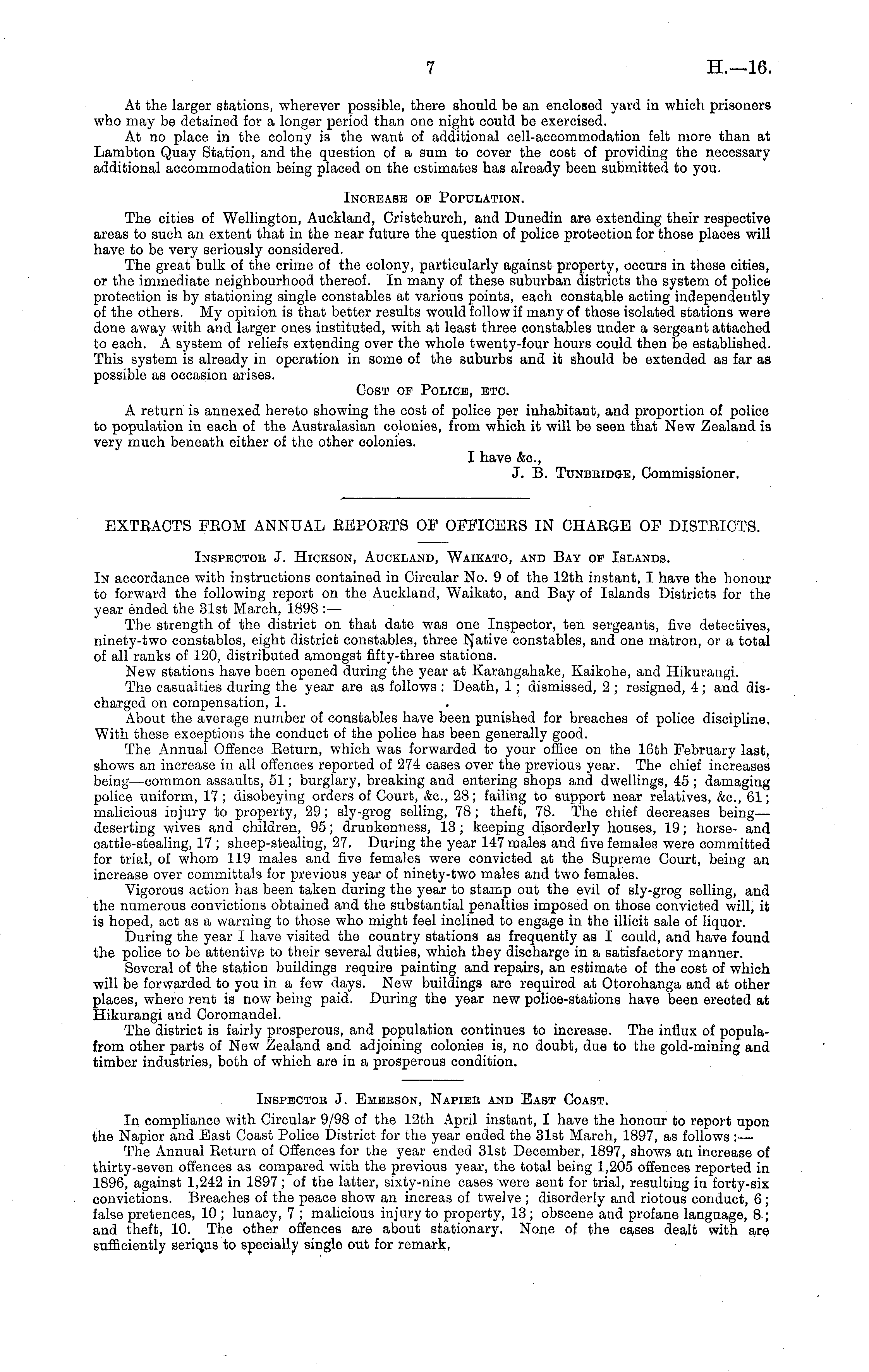 At the larger stations, wherever possible, there should be an enclosed yard in which prisoners who may be detained for a longer period than one night could be exercised. At no place in the colony is the want of additional cell-accommodation felt more than at Lambton Quay Station, and the question of a sum to cover the cost of providing the necessary additional accommodation being placed on the estimates has already been submitted to you. Increase of Population. The cities of Wellington, Auckland, Cristchurch, and Dunedin are extending their respective areas to such an extent that in the near future the question of police protection for those places will have to be very seriously considered. The great bulk of the crime of the colony, particularly against property, occurs in these cities, or the immediate neighbourhood thereof. In many of these suburban districts the system of police protection is by stationing single constables at various points, each constable acting independently of the others. My opinion is that better results would follow if many of these isolated stations were done away with and larger ones instituted, with at least three constables under a sergeant attached to each. A system of reliefs extending over the whole twenty-four hours could then be established. This system is already in operation in some of the suburbs and it should be extended as far as possible as occasion arises. Cost of Police, etc. A return is annexed hereto showing the cost of police per inhabitant, and proportion of police to population in each of the Australasian colonies, from which it will be seen that New Zealand is very much beneath either of the other colonies. I have &c, J. B. Tunbbidge, Commissioner.