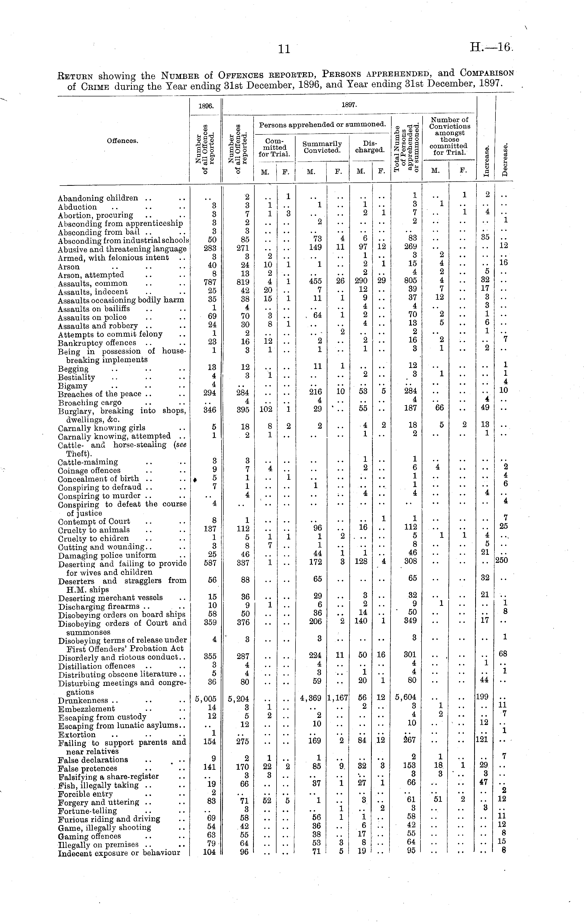 Return showing the Number of Offences Reported, Persons apprehended, and Comparison of Crime during the Year ending 31st December, 1896, and Year ending 31st December, 1897.