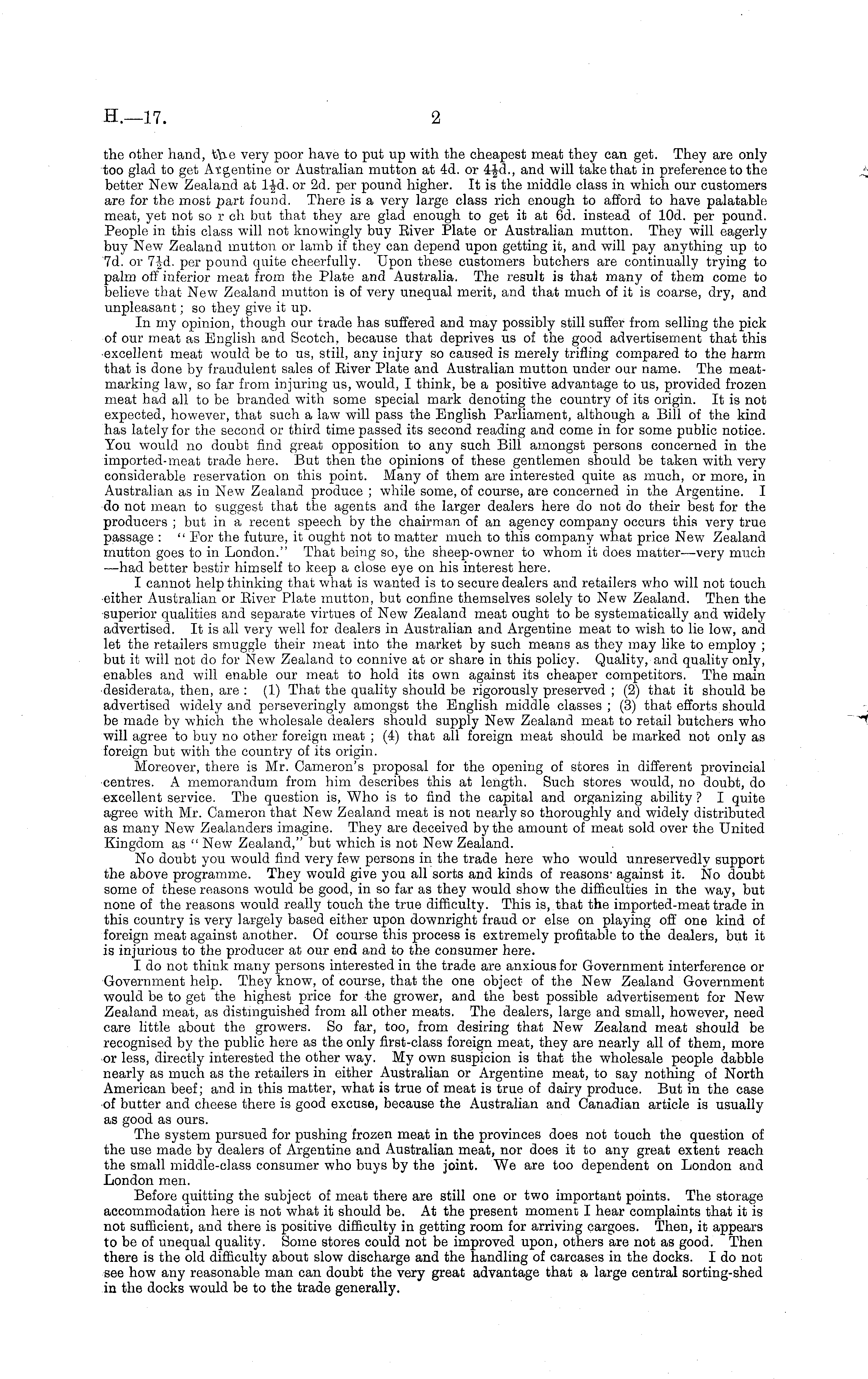 the other hand, t\ie very poor have to put up with the cheapest meat they can get. They are only too glad to get Argentine or Australian mutton at 4d. or 4Jd., and will take that in preference to the better New Zealand at lfd. or 2d. per pound higher. It is the middle class in which our customers are for the most part found. There is a very large class rich enough to afford to have palatable meat, yet not so r eh but that they are glad enough to get it at 6d. instead of 10d. per pound. People in this class will not knowingly buy River Plate or Australian mutton. They will eagerly buy New Zealand mutton or lamb if they can depend upon getting it, and will pay anything up to 7d. or 7Jd. per pound quite cheerfully. Upon these customers butchers are continually trying to palm off inferior meat from the Plate and Australia. The result is that many of them come to believe that New Zealand mutton is of very unequal merit, and that much of it is coarse, dry, and unpleasant; so they give it up. In my opinion, though our trade has suffered and may possibly still suffer from selling the pick of our meat as English and Scotch, because that deprives us of the good advertisement that this excellent meat would be to us, still, any injury so caused is merely trifling compared to the harm that is done by fraudulent sales of Eiver Plate and Australian mutton under our name. The meatmarking law, so far from injuring us, would, I think, be a positive advantage to us, provided frozen meat had all to be branded with some special mark denoting the country of its origin. It is not expected, however, that such a law will pass the English Parliament, although a Bill of the kind has lately for the second or third time passed its second reading and come in for some public notice. You would no doubt find great opposition to any such Bill amongst persons concerned in the imported-meat trade here. But then the opinions of these gentlemen should be taken with very considerable reservation on this point. Many of them are interested quite as much, or more, in Australian as in New Zealand produce ; while some, of course, are concerned in the Argentine. I do not mean to suggest that the agents and the larger dealers here do not do their best for the producers ; but in a recent speech by the chairman of an agency company occurs this very true passage : " For the future, it ought not to matter much to this company what price New Zealand mutton goes to in London." That being so, the sheep-owner to whom it does matter —very much —had better bestir himself to keep a close eye on his interest here. I cannot help thinking that what is wanted is to secure dealers and retailers who will not touch either Australian or Eiver Plate mutton, but confine themselves solely to New Zealand. Then the superior qualities and separate virtues of New Zealand meat ought to be systematically and widely advertised. It is all very well for dealers in Australian and Argentine meat to wish to lie low, and let the retailers smuggle their meat into the market by such means as they may like to employ ; but it will not do for New Zealand to connive at or share in this policy. Quality, and quality only, enables and will enable our meat to hold its own against its cheaper competitors. The main desiderata, then, are : (1) That the quality should be rigorously preserved ; (2) that it should be advertised widely and perseveringly amongst the English middle classes ; (3) that efforts should be made by which the wholesale dealers should supply New Zealand meat to retail butchers who will agree to buy no other foreign meat ; (4) that all foreign meat should be marked not only as foreign but with the country of its origin. Moreover, there is Mr. Cameron's proposal for the opening of stores in different provincial centres. A memorandum from him describes this at length. Such stores would, no doubt, do excellent service. The question is, Who is to find the capital and organizing ability ? I quite agree with Mr. Cameron that New Zealand meat is not nearly so thoroughly and widely distributed as many New Zealanders imagine. They are deceived by the amount of meat sold over the United Kingdom as " New Zealand," but which is not New Zealand. No doubt you would find very few persons in the trade here who would unreservedly support the above programme. They would give you all sorts and kinds of reasons , against it. No doubt some of these reasons would be good, in so far as they would show the difficulties in the way, but none of the reasons would really touch the true difficulty. This is, that the imported-meat trade in this country is very largely based either upon downright fraud or else on playing off one kind of foreign meat against another. Of course this process is extremely profitable to the dealers, but it is injurious to the producer at our end and to the consumer here. I do not think many persons interested in the trade are anxious for Government interference or Government help. They know, of course, that the one object of the New Zealand Government would be to get the highest price for the grower, and the best possible advertisement for New Zealand meat, as distinguished from all other meats. The dealers, large and small, however, need care little about the growers. So far, too, from desiring that New Zealand meat should be recognised by the public here as the only first-class foreign meat, they are nearly all of them, more or less, directly interested the other way. My own suspicion is that the wholesale people dabble nearly as much as the retailers in either Australian or Argentine meat, to say nothing of North American beef; and in this matter, what is true of meat is true of dairy produce. But in the case ■of butter and cheese there is good excuse, because the Australian and Canadian article is usually as good as ours. The system pursued for pushing frozen meat in the provinces does not touch the question of the use made by dealers of Argentine and A