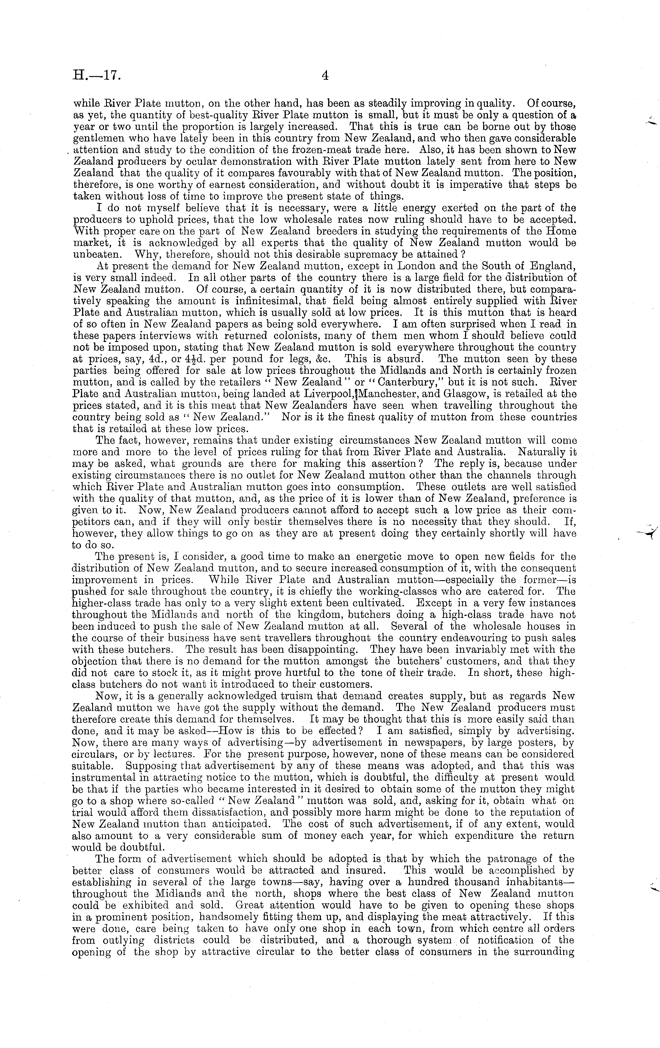while River Plate mutton, on the other hand, has been as steadily improving in quality. Of course, as yet, the quantity of best-quality Eiver Plate mutton is small, but it must be only a question of a year or two until the proportion is largely increased. That this is true can be borne out by those gentlemen who have lately been in this country from New Zealand, and who then gave considerable attention and study to the condition of the frozen-meat trade here. Also, it has been shown to New Zealand producers by ocular demonstration with Eiver Plate mutton lately sent from here to New Zealand that the quality of it compares favourably with that of New Zealand mutton. The position, therefore, is one worthy of earnest consideration, and without doubt it is imperative that steps be taken without loss of time to improve the present state of things. I do not myself believe that it is necessary, were a little energy exerted on the part of the producers to uphold prices, that the low wholesale rates now ruling should have to be accepted. With proper care on the part of New Zealand breeders in studying the requirements of the Home market, it is acknowledged by all experts that the quality of New Zealand mutton would be unbeaten. Why, therefore, should not this desirable supremacy be attained ? At present the demand for New Zealand mutton, except in London and the South of England, is very small indeed. In all other parts of the country there is a large field for the distribution of New Zealand mutton. Of course, a certain quantity of it is now distributed there, but comparatively speaking the amount is infinitesimal, that field being almost entirely supplied with Biver Plate and Australian mutton, which is usually sold at low prices. It is this mutton that is heard of so often in New Zealand papers as being sold everywhere. lam often surprised when I read in these papers interviews with returned colonists, many of them men whom I should believe could not be imposed upon, stating that New Zealand mutton is sold everywhere throughout the country at prices, say, id., or 4fd. per pound for legs, &c. This is absurd. The mutton seen by these parties being offered for sale at low prices throughout the Midlands and North is certainly frozen mutton, and is called by the retailers " New Zealand "or " Canterbury," but it is not such. Biver Plate and Australian mutton, being landed at Liverpool,jjManchester, and Glasgow, is retailed at the prices stated, and it is this meat that New Zealanders have seen when travelling throughout the country being sold as " New Zealand." Nor is it the finest quality of mutton from these countries that is retailed at these low prices. The fact, however, remains that under existing circumstances New Zealand mutton will come more and more to the level of prices ruling for that from Biver Plate and Australia. Naturally it may be asked, what grounds are there for making this assertion ? The reply is, because under existing circumstances there is no outlet for New Zealand mutton other than the channels through which Biver Plate and Australian mutton goes into consumption. These outlets are well satisfied with the quality of that mutton, and, as the price of it is lower than of New Zealand, preference is given to it. Now, New Zealand producers cannot afford to accept such a low price as their competitors can, and if they will only bestir themselves there is no necessity that they should. If, however, they allow things to go on as they are at present doing they certainly shortly will have to do so. The present is, I consider, a good time to make an energetic move to open new fields for the distribution of New Zealand mutton, and to secure increased consumption of it, with the consequent improvement in prices. While Biver Plate and Australian mutton—especially the former—is pushed for sale throughout the country, it is chiefly the working-classes who are catered for. The higher-class trade has only to a very slight extent been cultivated. Except in a very few instances throughout the Midlands and north of the kingdom, butchers doing a high-class trade have not been induced to push the sale of New Zealand mutton at all. Several of the wholesale houses in the course of their business have sent travellers throughout the country endeavouring to push sales with these butchers. The result has been disappointing. They have been invariably met with the objection that there is no demand for the mutton amongst the butchers' customers, and that they did not care to stock it, as it might prove hurtful to the tone of their trade. In short, these highclass butchers do not want it introduced to their customers. Now, it is a generally acknowledged truism that demand creates supply, but as regards New Zealand mutton we have got the supply without the demand. The New Zealand producers must therefore create this demand for themselves. It may be thought that this is more easily said than done, and it may be asked —How is this to be effected ? lam satisfied, simply by advertising. Now, there are many ways of advertising—by advertisement in newspapers, by large posters, by circulars, or by lectures. For the present purpose, however, none of these means can be considered suitable. Supposing that advertisement by any of these means was adopted, and that this was instrumental in attracting notice to the mutton, which is doubtful, the difficulty at present would be that if the parties who became interested in it desired to obtain some of the mutton they might go to a shop where so-called " New Zealand" mutton was sold, and, asking for it, obtain what on trial would afford them dissatisfaction, and possibly more harm might be done to the reputation of New Zealand mutton than anticipated. The cost of such advertisement, if of any extent, would also amount to a very considerable sum of money each year, for which expenditure the return would be doubtful. The form of advertisement which should be adopted is