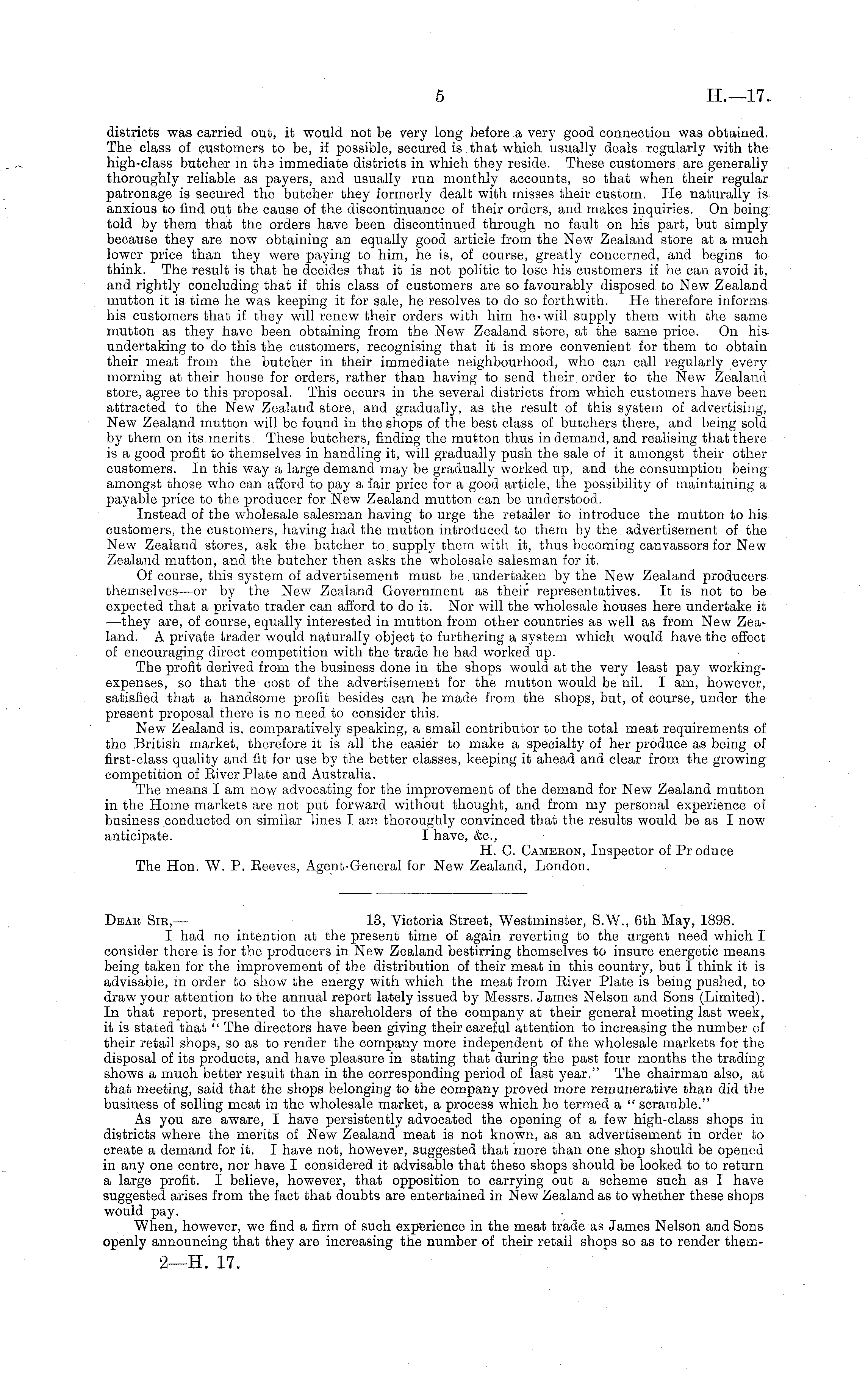Deae Sic,— 13, Victoria Street, Westminster, S.W., 6th May, 1898. I had no intention at the present time of again reverting to the urgent need which I consider there is for the producers in New Zealand bestirring themselves to insure energetic means being taken for the improvement of the distribution of their meat in this country, but I think it is advisable, in order to show the energy with which the meat from Eiver Plate is being pushed, to draw your attention to the annual report lately issued by Messrs. James Nelson and Sons (Limited). In that report, presented to the shareholders of the company at their general meeting last week, it is stated that " The directors have been giving their careful attention to increasing the number of their retail shops, so as to render the company more independent of the wholesale markets for the disposal of its products, and have pleasure in stating that during the past four months the trading shows a much better result than in the corresponding period of last year." The chairman also, at that meeting, said that the shops belonging to the company proved more remunerative than did the business of selling meat in the wholesale market, a process which he termed a " scramble." As you are aware, I have persistently advocated the opening of a few high-class shops in districts where the merits of New Zealand meat is not known, as an advertisement in order to create a demand for it. I have not, however, suggested that more than one shop should be opened in any one centre, nor have I considered it advisable that these shops should be looked to to return a large profit. I believe, however, that opposition to carrying out a scheme such as I have suggested arises from the fact that doubts are entertained in New Zealand as to whether these shops would pay. When, however, we find a firm of such experience in the meat trade as James Nelson and Sons openly announcing that they are increasing the number of their retail shops so as to render them2—H. 17.