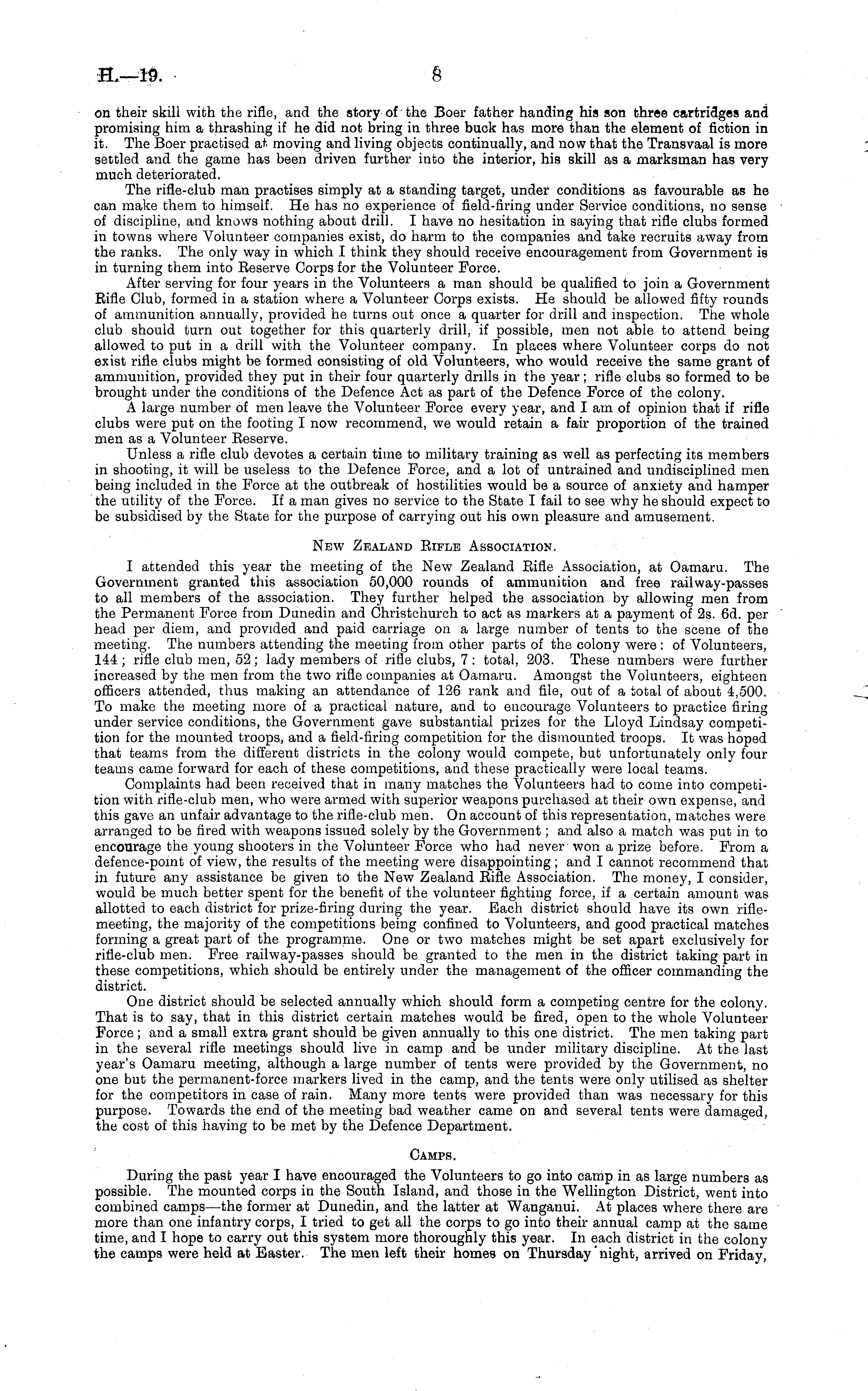 on their skill with the rifle, and the story of the Boer father handing his son three cartridges and promising him a thrashing if he did not bring in three buck has more than the element of fiction in it. The Boer practised at moving and living objects continually, and now that the Transvaal is more settled and the game has been driven further into the interior, his skill as a marksman has very much deteriorated. The rifle-club man practises simply at a standing target, under conditions as favourable as he can make them to himself. He has no experience of field-firing under Service conditions, no sense of discipline, and knows nothing about drill. I have no hesitation in saying that rifle clubs formed in towns where Volunteer companies exist, do harm to the companies and take recruits away from the ranks. The only way in which I think they should receive encouragement from Government is in turning them into Reserve Corps for the Volunteer Force. After serving for four years in the Volunteers a man should be qualified to join a Government Rifle Club, formed in a station where a Volunteer Corps exists. He should be allowed fifty rounds of ammunition annually, provided he turns out once a quarter for drill and inspection. The whole club should turn out together for this quarterly drill, if possible, men not able to attend being allowed to put in a drill with the Volunteer company. In places where Volunteer corps do not exist rifle clubs might be formed consisting of old Volunteers, who would receive the same grant of ammunition, provided they put in their four quarterly drills in the year; rifle clubs so formed to be brought under the conditions of the Defence Act as part of the Defence Force of the colony. A large number of men leave the Volunteer Force every year, and I am of opinion that if rifle clubs were put on the footing I now recommend, we would retain a fair proportion of the trained men as a Volunteer Reserve. Unless a rifle club devotes a certain time to military training as well as perfecting its members in shooting, it will be useless to the Defence Force, and a lot of untrained and undisciplined men being included in the Force at the outbreak of hostilities would be a source of anxiety and hamper the utility of the Force. If a man gives no service to the State I fail to see why he should expect to be subsidised by the State for the purpose of carrying out his own pleasure and amusement. New Zealand Rifle Association. I attended this year the meeting of the New Zealand Rifle Association, at Oamaru. The Government granted this association 50,000 rounds of ammunition and free railway-passes to all members of the association. They further helped the association by allowing men from the Permanent Force from Dunedin and Christchurch to act as markers at a payment of 2s. 6d. per head per diem, and provided and paid carriage on a large number of tents to the scene of the meeting. The numbers attending the meeting from other parts of the colony were :of Volunteers, 144 ; rifle club men, 52; lady members of rifle clubs, 7 : total, 203. These numbers were further increased by the men from the two rifle companies at Oamaru. Amongst the Volunteers, eighteen officers attended, thus making an attendance of 126 rank and file, out of a total of about 4,500. To make the meeting more of a practical nature, and to encourage Volunteers to practice firing under service conditions, the Government gave substantial prizes for the Lloyd Lindsay competition for the mounted troops, and a field-firing competition for the dismounted troops. It was hoped that teams from the different districts in the colony would compete, but unfortunately only four teams came forward for each of these competitions, and these practically were local teams. Complaints had been received that in many matches the Volunteers had to come into competition with rifle-club men, who were armed with superior weapons purchased at their own expense, and this gave an unfair advantage to the rifle-club men. On account of this representation, matches were arranged to be fired with weapons issued solely by the Government; and also a match was put in to encourage the young shooters in the Volunteer Force who had never won a prize before. From a defence-point of view, the results of the meeting were disappointing ; and I cannot recommend that in future any assistance be given to the New Zealand Rifle Association. The money, I consider, would be much better spent for the benefit of the volunteer fighting force, if a certain amount was allotted to each district for prize-firing during the year. Each district should have its own riflemeeting, the majority of the competitions being confined to Volunteers, and good practical matches forming a great part of the programme. One or two matches might be set apart exclusively for rifle-club men. Free railway-passes should be granted to the men in the district taking part in these competitions, which should be entirely under the management of the officer commanding the district. One district should be selected annually which should form a competing centre for the colony. That is to say, that in this district certain matches would be fired, open to the whole Volunteer Force ; and a small extra grant should be given annually to this one district. The men taking part in the several rifle meetings should live in camp and be under military discipline. At the last year's Oamaru meeting, although a large number of tents were provided by the Government, no one but the permanent-force markers lived in the camp, and the tents were only utilised as shelter for the competitors in case of rain. Many more tents were provided than was necessary for this purpose. Towards the end of the meeting bad weather came on and several tents were damaged, the cost of this having to be met by the Defence Department. Camps. During the past year I have encouraged the Volunteers to go into camp in as large numbers as possible. The mou