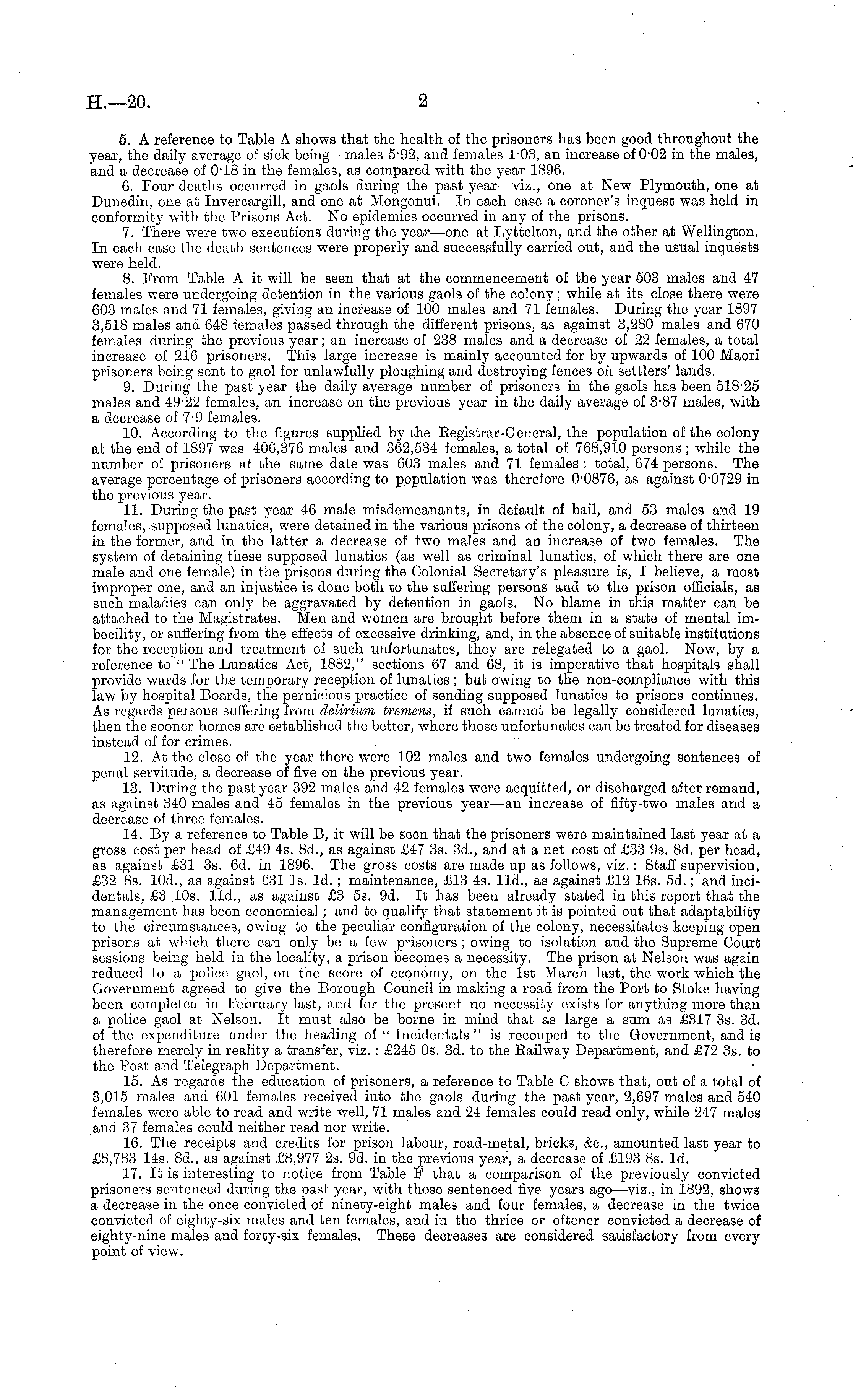 5. A reference to Table A shows that the health of the prisoners has been good throughout the year, the daily average of sick being—males 5*92, and females I*o3, an increase of o*o2 in the males, and a decrease of o*lB in the females, as compared with the year 1896. 6. Four deaths occurred in gaols during the past year—viz., one at New Plymouth, one at Dunedin, one at Invercargill, and one at Mongonui. In each case a coroner's inquest was held in conformity with the Prisons Act. No epidemics occurred in any of the prisons. 7. There were two executions during the year—one at Lyttelton, and the other at Wellington. In each case the death sentences were properly and successfully carried out, and the usual inquests were held. . 8. From Table A it will be seen that at the commencement of the year 503 males and 47 females were undergoing detention in the various gaols of the colony; while at its close there were 603 males and 71 females, giving an increase of 100 males and 71 females. During the year 1897 3,518 males and 648 females passed through the different prisons, as against 3,280 males and 670 females during the previous year; an increase of 238 males and a decrease of 22 females, a total increase of 216 prisoners. This large increase is mainly accounted for by upwards of 100 Maori prisoners being sent to gaol for unlawfully ploughing and destroying fences oh settlers' lands. 9. During the past year the daily average number of prisoners in the gaols has been 518-25 males and 49-22 females, an increase on the previous year in the daily average of 3-87 males, with a decrease of 7*9 females. 10. According to the figures supplied by the Eegistrar-General, the population of the colony at the end of 1897 was 406,376 males and 362,534 females, a total of 768,910 persons ; while the number of prisoners at the same date was 603 males and 71 females : total, 674 persons. The average percentage of prisoners according to population was therefore 0*0876, as against 0*0729 in the previous year. 11. During the past year 46 male misdemeanants, in default of bail, and 53 males and 19 females, supposed lunatics, were detained in the various prisons of the colony, a decrease of thirteen in the former, and in the latter a decrease of two males and an increase of two females. The system of detaining these supposed lunatics (as well as criminal lunatics, of which there are one male and one female) in the prisons during the Colonial Secretary's pleasure is, I believe, a most improper one, and an injustice is done both to the suffering persons and to the prison officials, as such maladies can only be aggravated by detention in gaols. No blame in this matter can be attached to the Magistrates. Men and women are brought before them in a state of mental imbecility, or suffering from the effects of excessive drinking, and, in the absence of suitable institutions for the reception and treatment of such unfortunates, they are relegated to a gaol. Now, by a reference to " The Lunatics Act, 1882," sections 67 and 68, it is imperative that hospitals shall provide wards for the temporary reception of lunatics; but owing to the non-compliance with this law by hospital Boards, the pernicious practice of sending supposed lunatics to prisons continues. As regards persons suffering from delirium tremens, if such cannot be legally considered lunatics, then the sooner homes are established the better, where those unfortunates can be treated for diseases instead of for crimes. 12. At the close of the year there were 102 males and two females undergoing sentences of penal servitude, a decrease of five on the previous year. 13. During the past year 392 males and 42 females were acquitted, or discharged after remand, as against 340 males and 45 females in the previous year —an increase of fifty-two males and a decrease of three females. 14. By a reference to Table B, it will be seen that the prisoners were maintained last year at a gross cost per head of £49 4s. Bd., as against £47 3s. 3d., and at a net cost of £33 9s. Bd. per head, as against £31 3s. 6d. in 1896. The gross costs are made up as follows, viz.: Staff supervision, £32 Bs. 10d., as against £31 Is. Id. ; maintenance, £13 4s. lid., as against £12 16s. 5d.; and incidentals, £3 10s. lid., as against £3 ss. 9d. It has been already stated in this report that the management has been economical; and to qualify that statement it is pointed out that adaptability to the circumstances, owing to the peculiar configuration of the colony, necessitates keeping open prisons at which there can only be a few prisoners ; owing to isolation and the Supreme Court sessions being held in the locality, a prison becomes a necessity. The prison at Nelson was again reduced to a police gaol, on the score of economy, on the Ist March last, the work which the Government agreed to give the Borough Council in making a road from the Port to Stoke having been completed in February last, and for the present no necessity exists for anything more than a police gaol at Nelson. It must also be borne in mind that as large a sum as £317 3s. 3d. of the expenditure under the heading of " Incidentals " is recouped to the Government, and is therefore merely in reality a transfer, viz.: £245 os. 3d. to the Eailway Department, and £72 3s. to the Post and Telegraph Department. 15. As regards the education of prisoners, a reference to Table C shows that, out of a total of 3,015 males and 601 females received into the gaols during the past year, 2,697 males and 540 females were able to read and write well, 71 males and 24 females could read only, while 247 males and 37 females could neither read nor write. 16. The receipts and credits for prison labour, road-metal, bricks, &c, amounted last year to £8,783 14s. Bd., as against £8,977 2s. 9d. in the previous year, a decrease of £193 Bs. Id. 17. It is interesting to notice from Table F that a comparison of the previously convicted prisoners senten