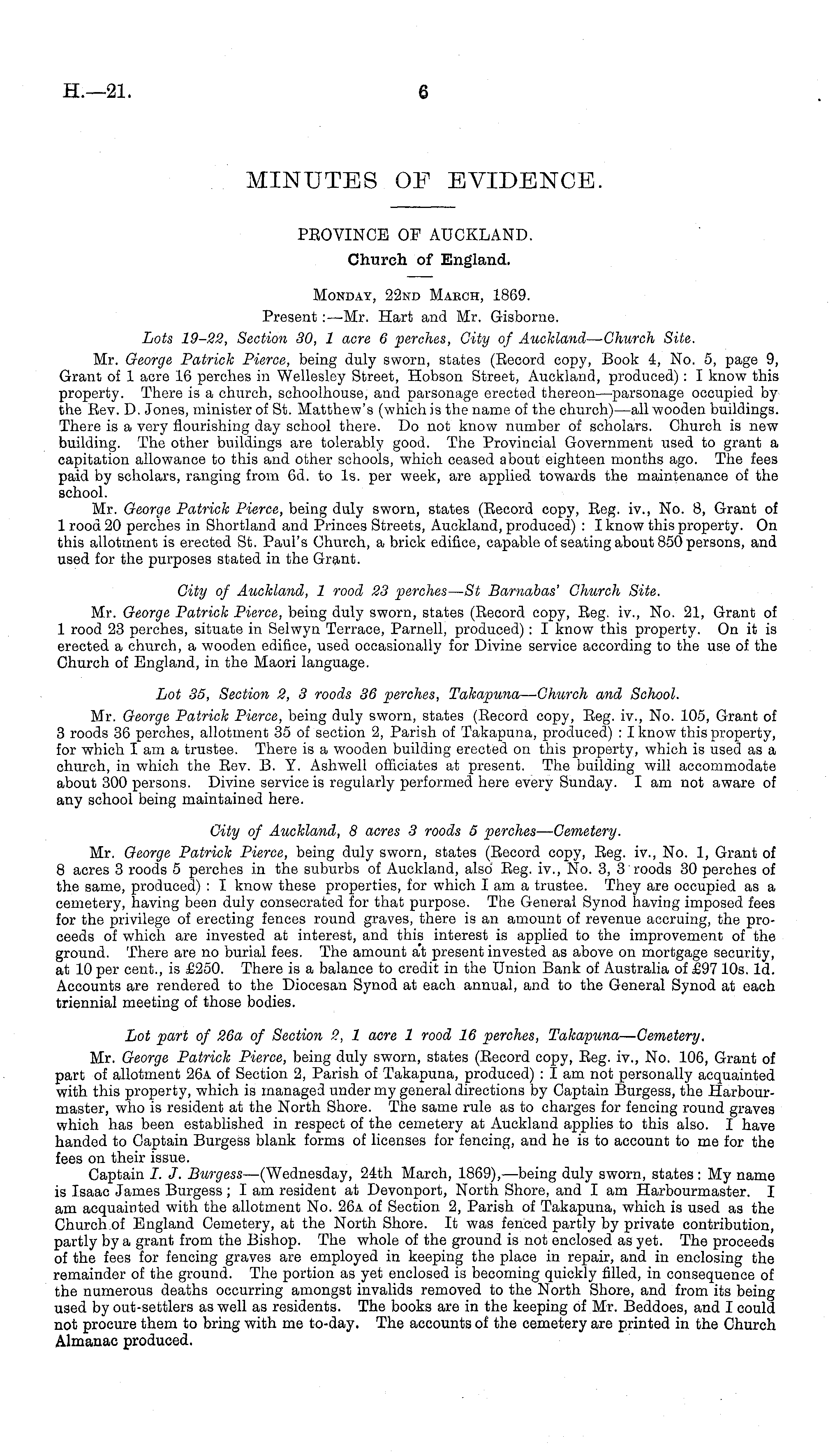 PROVINCE OF AUCKLAND. Church of England. Monday, 22nd March, 1869. Present:—Mr. Hart and Mr. Gisborne. Lots 19-22, Section 30, 1 acre 6 perches, City of Auckland — -Church Site. Mr. George Patrick Pierce, being duly sworn, states (Eecord copy, Book 4, No. 5, page 9, Grant of 1 acre 16 perches in Wellesley Street, Hobson Street, Auckland, produced) : I know this property. There is a church, schoolhouse, and parsonage erected thereon—parsonage occupied by the Eev. D. Jones, minister of St. Matthew's (which is the name of the church) —all wooden buildings. There is a very flourishing day school there. Do not know number of scholars. Church is new building. The other buildings are tolerably good. The Provincial Government used to grant a capitation allowance to this and other schools, which ceased about eighteen months ago. The fees paid by scholars, ranging from 6d. to Is. per week, are applied towards the maintenance of the school. Mr. George Patrick Pierce, being duly sworn, states (Eecord copy, Eeg. iv., No. 8, Grant of 1 rood 20 perches in Shortland and Princes Streets, Auckland, produced) : I know this property. On this allotment is erected St. Paul's Church, a brick edifice, capable of seating about 850 persons, and used for the purposes stated in the Grant. City of Auckland, 1 rood 23 perches — St Barnabas' Church Site. Mr. George Patrick Pierce, being duly sworn, states (Eecord copy, Eeg. iv., No. 21, Grant of 1 rood 23 perches, situate in Selwyn Terrace, Parnell, produced): I know this property. On it is erected a church, a wooden edifice, used occasionally for Divine service according to the use of the Church of England, in the Maori language. Lot 35, Section 2, 3 roods 36 perches, Takapuna — Church and School. Mr. George Patrick Pierce, being duly sworn, states (Eecord copy, Eeg. iv., No. 105, Grant of 3 roods 36 perches, allotment 35 of section 2, Parish of Takapuna, produced) : I know this property, for which lam a trustee. There is a wooden building erected on this property, which is used as a church, in which the Eev. B. Y. Ashwell officiates at present. The building will accommodate about 300 persons. Divine service is regularly performed here every Sunday. I am not aware of any school being maintained here. City of Auckland, 8 acres 3 roods 5 perches—Cemetery. Mr. George Patrick Pierce, being duly sworn, states (Eecord copy, Eeg. iv., No. 1, Grant of 8 acres 3 roods 5 perches in the suburbs of Auckland, also Eeg. iv., No. 3, 3 roods 30 perches of the same, produced) : I know these properties, for which lam a trustee. They are occupied as a cemetery, having been duly consecrated for that purpose. The General Synod having imposed fees for the privilege of erecting fences round graves, there is an amount of revenue accruing, the proceeds of which are invested at interest, and this interest is applied to the improvement of the ground. There are no burial fees. The amount at present invested as above on mortgage security, at 10 per cent., is £250. There is a balance to credit in the Union Bank of Australia of £97 10s. Id. Accounts are rendered to the Diocesan Synod at each annual, and to the General Synod at each triennial meeting of those bodies. Lot part of 26a of Section 2, 1 acre 1 rood 16 perches, Takapuna — Cemetery. Mr. George Patrick Pierce, being duly sworn, states (Eecord copy, Eeg. iv., No. 106, Grant of part of allotment 26a of Section 2, Parish of Takapuna, produced) : I am not personally acquainted with this property, which is managed under my general directions by Captain Burgess, the Harbourmaster, who is resident at the North Shore. The same rule as to charges for fencing round graves which has been established in respect of the cemetery at Auckland applies to this also. I have handed to Captain Burgess blank forms of licenses for fencing, and he is to account to me for the fees on their issue. Captain I. J. Burgess —(Wednesday, 24th March, 1869), —being duly sworn, states : My name is Isaac James Burgess; lam resident at Devonport, North Shore, and I am Harbourmaster. I am acquainted with the allotment No. 26a of Section 2, Parish of Takapuna, which is used as the Church of England Cemetery, at the North Shore. It was fenced partly by private contribution, partly by a grant from the Bishop. The whole of the ground is not enclosed as yet. The proceeds of the fees for fencing graves are employed in keeping the place in repair, and in enclosing the remainder of the ground. The portion as yet enclosed is becoming quickly filled, in consequence of the numerous deaths occurring amongst invalids removed to the North Shore, and from its being used by out-settlers as well as residents. The books are in the keeping of Mr. Beddoes, and I could not procure them to bring with me to-day. The accounts of the cemetery are printed in the Church Almanac produced.