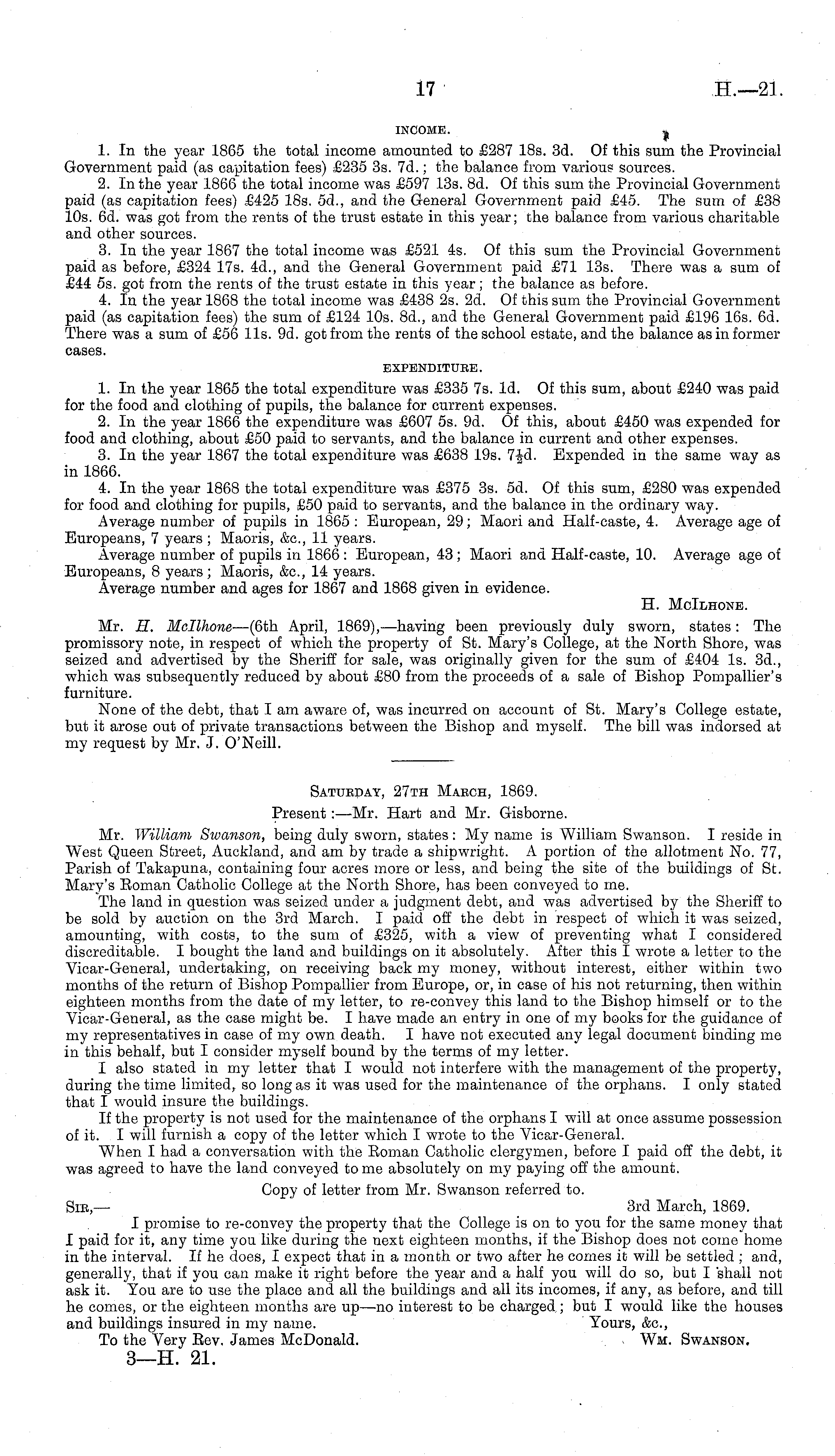 Saturday, 27th March, 1869. Present:—Mr. Hart and Mr. Gisborne. Mr. William Sivanson, being duly sworn, states: My name is William Swanson. I reside in West Queen Street, Auckland, and am by trade a shipwright. A portion of the allotment No. 77, Parish of Takapuna, containing four acres more or less, and being the site of the buildings of St. Mary's Eoman Catholic College at the North Shore, has been conveyed to me. The land in question was seized under a judgment debt, and was advertised by the Sheriff to be sold by auction on the 3rd March. I paid off the debt in respect of which it was seized, amounting, with costs, to the sum of £325, with a view of preventing what I considered discreditable. I bought the land and buildings on it absolutely. After this I wrote a letter to the Vicar-General, undertaking, on receiving back my money, without interest, either within two months of the return of Bishop Pompallier from Europe, or, in case of his not returning, then within eighteen months from the date of my letter, to re-convey this land to the Bishop himself or to the Vicar-General, as the case might be. I have made an entry in one of my books for the guidance of my representatives in case of my own death. I have not executed any legal document binding me in this behalf, but I consider myself bound by the terms of my letter. I also stated in my letter that I would not interfere with the management of the property, during the time limited, so long as it w r as used for the maintenance of the orphans. I only stated that I would insure the buildings. If the property is not used for the maintenance of the orphans I will at once assume possession of it. I will furnish a copy of the letter which I wrote to the Vicar-General. When I had a conversation with the Eoman Catholic clergymen, before I paid off the debt, it was agreed to have the land conveyed tome absolutely on my paying off the amount. Copy of letter from Mr. Swanson referred to. Sir— 3rd March, 1869. I promise to re-convey the property that the College is on to you for the same money that I paid for it, any time you like during the next eighteen months, if the Bishop does not come home in the interval. If he does, I expect that in a month or two after he comes it will be settled ; and, generally, that if you can make it right before the year and a half you will do so, but I shall not ask it. You are to use the place and all the buildings and all its incomes, if any, as before, and till he comes, or the eighteen months are up—no interest to be charged ; but I would like the houses and buildings insured in my name. Yours, &c, To the Very Eev. James McDonald. Wm. Swanson. 3—H. 21.