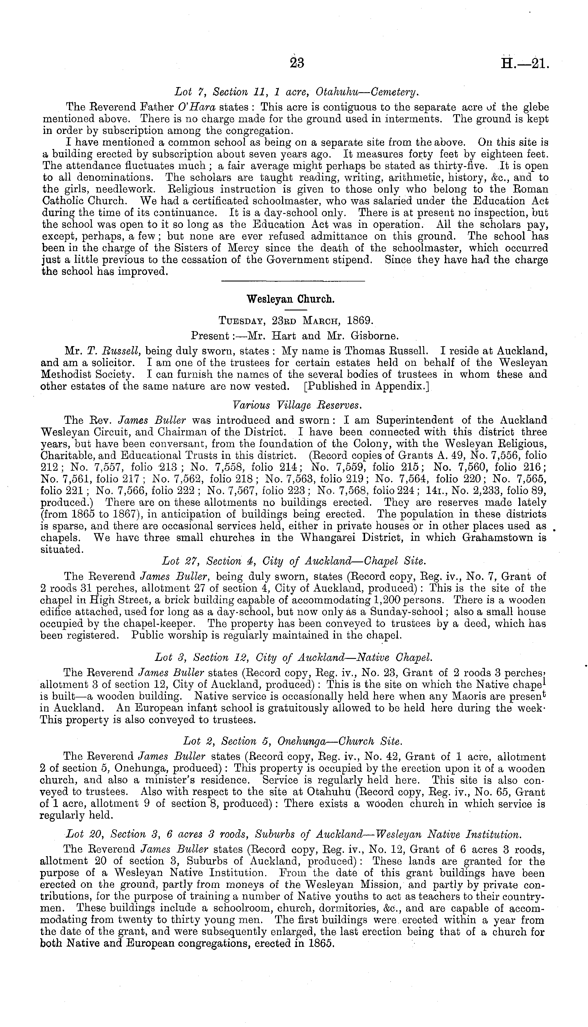Wesleyan Church. Tuesday, 23rd March, 1869. Present:—Mr. Hart and Mr. Gisborne. Mr. T. Bussell, being duly sworn, states :My name is Thomas Bussell. I reside at Auckland, and am a solicitor. lam one of the trustees for certain estates held on behalf of the Wesleyan Methodist Society. I can furnish the names of the several bodies of trustees in whom these and other estates of the same nature are now vested. [Published in Appendix.] Various Village Beserves. The Eev. James Buller was introduced and sworn: lam Superintendent of the Auckland Wesleyan Circuit, and Chairman of the District. I have been connected with this district three years, but have been conversant, from the foundation of the Colony, with the Wesleyan Eeligious, Charitable, and Educational Trusts in this district. (Eecord copies of Grants A. 49, No. 7,556, folio 212; No. 7,557, folio 213; No. 7,558, folio 214; No. 7,559, folio 215; No. 7,560, folio 216; No. 7,561, folio 217 ; No. 7,562, folio 218; No. 7,563, folio 219; No. 7,564, folio 220; No. 7,565, folio 221; No. 7,566, folio 222 ; No. 7,567, folio 223 ; No. 7,568, folio 224; 14i., No. 2,233, folio 89, produced.) There are on these allotments no buildings erected. They are reserves made lately (from 1865 to 1867), in anticipation of buildings being erected. The population in these districts is sparse, and there are occasional services held, either in private houses or in other places used as chapels. We have three small churches in the Whangarei District, in which Grahamstown is situated. Lot 27, Section 4, City of Auckland — Chapel Site. The Eeverend James Buller, being duly sworn, states (Eecord copy, Eeg. iv., No. 7, Grant of 2 roods 31 perches, allotment 27 of section 4, City of Auckland, produced): This is the site of the chapel in High Street, a brick building capable of accommodating 1,200 persons. There is a wooden edifice attached, used for long as a day-school, but now only as a Sunday-school; also a small house occupied by the chapel-keeper. The property has been conveyed to trustees by a deed, which has been registered. Public worship is regularly maintained in the chapel. Lot 3, Section 12, City of Auckland — Native Chapel. The Eeverend James Buller states (Eecord copy, Eeg. iv., No. 23, Grant of 2 roods 3 perchesallotment 3 of section 12, City of Auckland, produced) : This is the site on which the Native is built—a wooden building. Native service is occasionally held here when any Maoris are present in Auckland. An European infant school is gratuitously allowed to be held here during the week' This property is also conveyed to trustees. Lot 2, Section 5, Onehunga — Church Site. The Eeverend James Buller states (Eecord copy, Eeg. iv., No. 42, Grant of 1 acre, allotment 2of section 5, Onehunga, produced): This property is occupied by the erection upon it of a wooden church, and also a minister's residence. Service is regularly held here. This site is also conveyed to trustees. Also with respect to the site at Otahuhu (Becord copy, Eeg. iv., No. 65, Grant of 1 acre, allotment 9 of section 8, produced): There exists a wooden church in which service is regularly held. Lot 20, Section 3, 6 acres 3 roods, Suburbs of Auckland — Wesleyan Native Institution. The Eeverend James Buller states (Eecord copy, Eeg. iv., No. 12, Grant of 6 acres 3 roods, allotment 20 of section 3, Suburbs of Auckland, produced): These lands are granted for the purpose of a Wesleyan Native Institution. From the date of this grant buildings have been erected on the ground, partly from moneys of the Wesleyan Mission, and partly by private contributions, for the purpose of training a number of Native youths to act as teachers to their countrymen. These buildings include a schoolroom, church, dormitories, &c, and are capable of accommodating from twenty to thirty young men. The first buildings were, erected within a year from the date of the grant, and were subsequently enlarged, the last erection being that of a church for both Native and European congregations, erected in 1865.