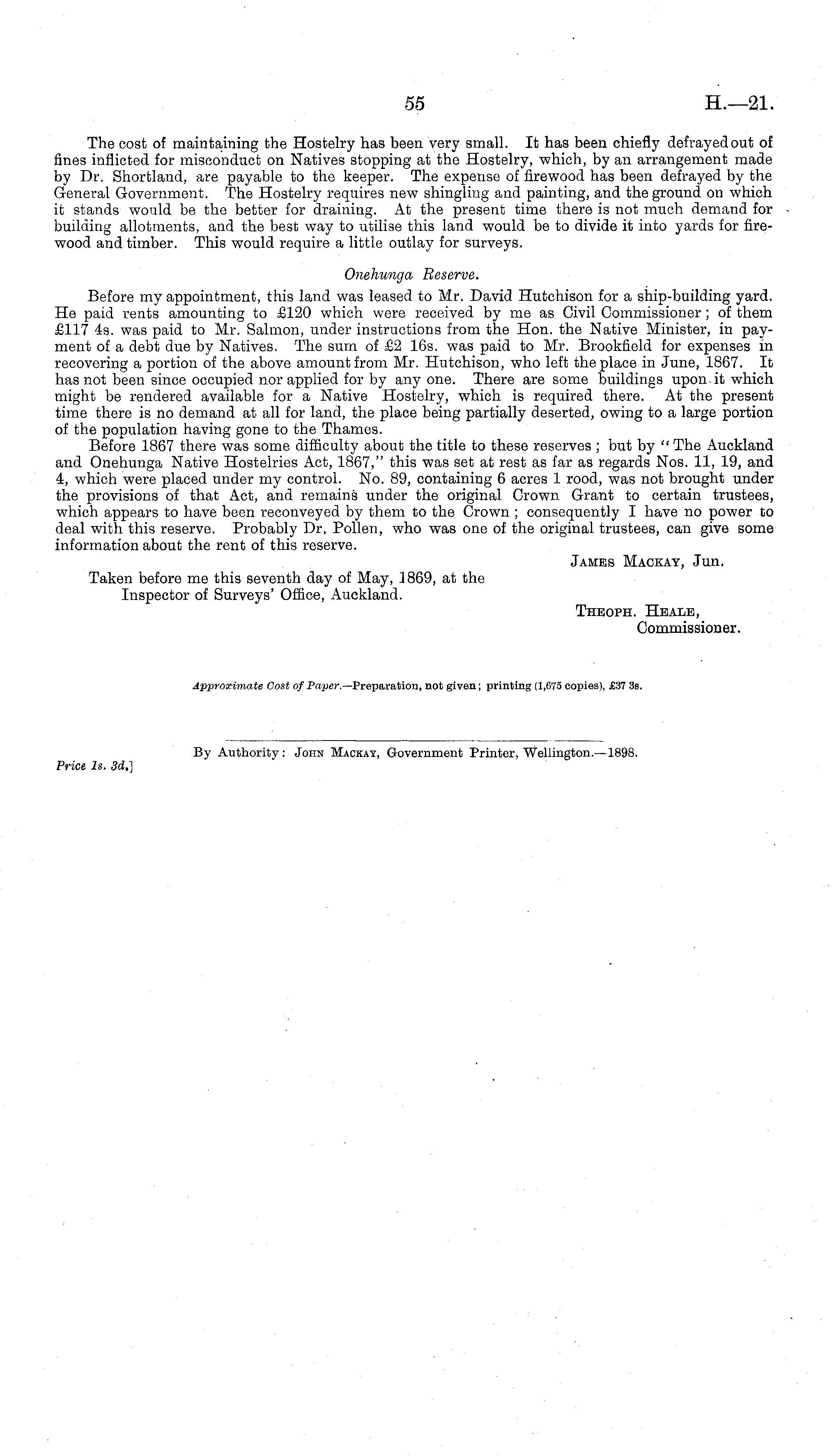 The cost of maintaining the Hostelry has been very small. It has been chiefly defrayed out of fines inflicted for misconduct on Natives stopping at the Hostelry, which, by an arrangement made by Dr. Shortland, are payable to the keeper. The expense of firewood has been defrayed by the General Government. The Hostelry requires new shingling and painting, and the ground on which it stands would be the better for draining. At the present time there is not much demand for building allotments, and the best way to utilise this land would be to divide it into yards for firewood and timber. This would require a little outlay for surveys. Onehunga Beserve. Before my appointment, this land was leased to Mr. David Hutchison for a ship-building yard. He paid rents amounting to £120 which were received by me as Civil Commissioner ; of them £117 4s. was paid to Mr. Salmon, under instructions from the Hon. the Native Minister, in payment of a debt due by Natives. The sum of £2 16s. was paid to Mr. Brookfield for expenses in recovering a portion of the above amount from Mr. Hutchison, who left the place in June, 1867. It has not been since occupied nor applied for by any one. There are some buildings upon, it which might be rendered available for a Native Hostelry, which is required there. At the present time there is no demand at all for land, the place being partially deserted, owing to a large portion of the population having gone to the Thames. Before 1867 there was some difficulty about the title to these reserves ; but by " The Auckland and Onehunga Native Hostelries Act, 1867," this was set at rest as far as regards Nos. 11, 19, and 4, which were placed under my control. No. 89, containing 6 acres 1 rood, was not brought under the provisions of that Act, and remains under the original Crown Grant to certain trustees, which appears to have been reconveyed by them to the Crown ; consequently I have no power to deal with this reserve. Probably Dr, Pollen, who was one of the original trustees, can give some information about the rent of this reserve. James Mackay, Jun. Taken before me this seventh day of May, 1869, at the Inspector of Surveys' Office, Auckland. Theoph. Heale, Commissioner. Approximate Cost of Paper.— Preparation, not given; printing (1,675 copies), £37 3s.