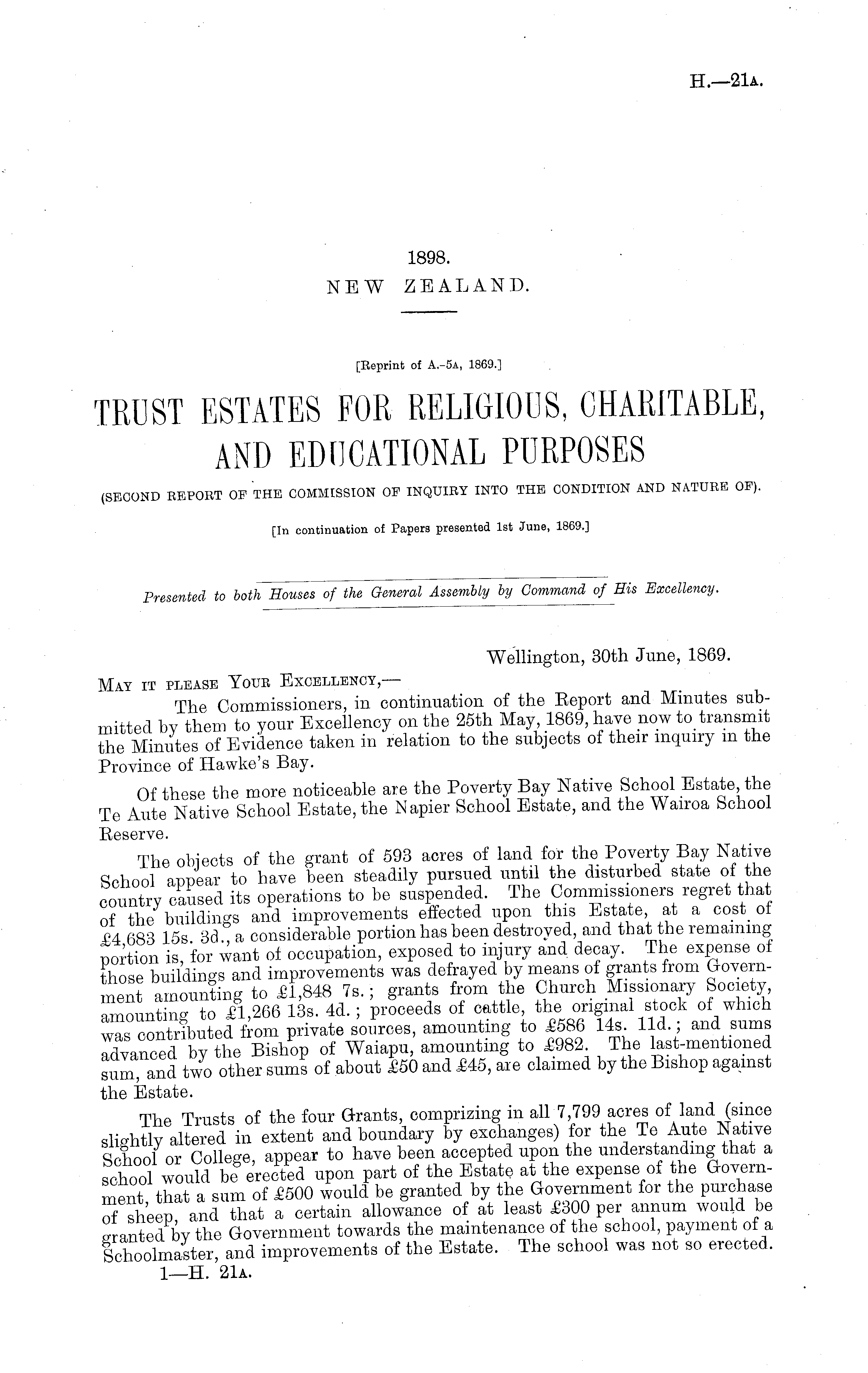 Wellington, 30th June, 1869. May it please Your Excellency,— The Commissioners, in continuation of the Eeport and Minutes submitted by them to your Excellency on the 25th May, 1869, have now to_ transmit the Minutes of Evidence taken in 'relation to the subjects of their inquiry m the Province of Hawke's Bay. Of these the more noticeable are the Poverty Bay Native School Estate the Te Ante Native School Estate, the Napier School Estate, and the Wairoa School Reserve. The obiects of the grant of 593 acres of land for the Poverty Bay Native School appear to have been steadily pursued until the disturbed state of the country caused its operations to be suspended. The Commissioners regret that of the buildings and improvements effected upon this Estate, at a cost _ of £4 683 15s 3d a considerable portion has been destroyed, and that the remaining portion is, for want of occupation, exposed to injury and decay. The expense of those buildings and improvements was defrayed by means of grants from Government amounting to £1,848 75.; grants from the Church Missionary Society amounting to £1,266 13s. 4d. ; proceeds of cattle, the original stock of which was contributed from private sources, amounting to £586 14s. lid.; and sums rdvanced by the Bishop of Waiapu, amounting to £982 The last-mentioned sum, and two other sums of about £50 and £45, are claimed by the Bishop against the Estate. The Trusts of the four Grants, comprizing in all 7,799 acres of land (since slightly altered in extent and boundary by exchanges) for the Te Aute Native School or College, appear to have been accepted upon the understanding that a school would be erected upon part of the Estate at the expense of the Government that a sum of £500 would be granted by the Government for the purchase of sheep and that a certain allowance of at least £300 per annum would be o-rantedbv the Government towards the maintenance of the school, payment of a Schoolmaster, and improvements of the Estate. The school was not so erected. I—H. 21a.