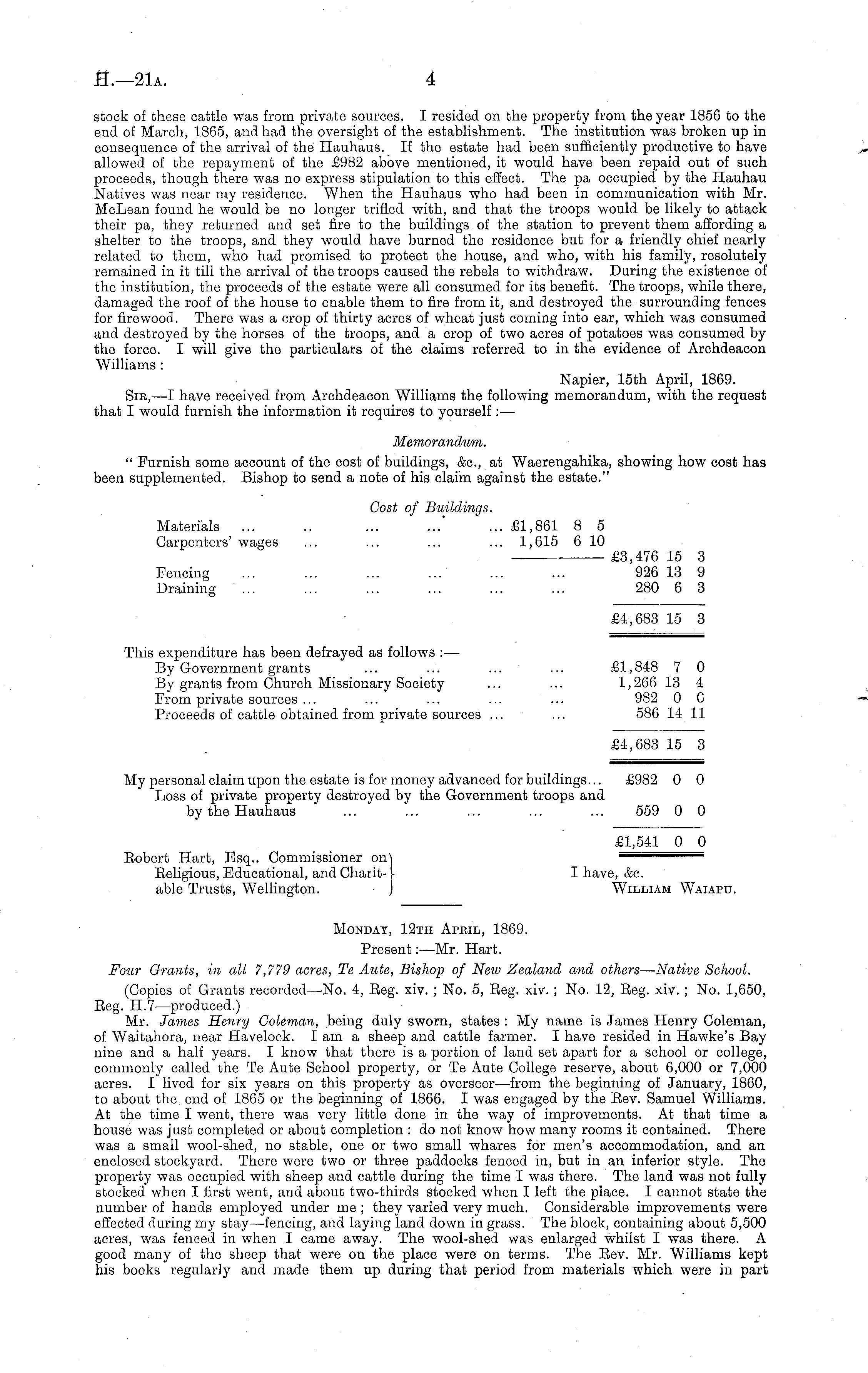 Monday, 12th April, 1869. Present:—Mr. Hart. Four Grants, in all 7,779 acres, Te Aute, Bishop of Neiv Zealand and others — -Native School. (Copies of Grants recorded—No. 4, Eeg. xiv. ; No. 5, Eeg. xiv.; No. 12, Reg. xiv. ; No. 1,650, Reg. H.7—produced.) Mr. James Henry Coleman, being duly sworn, states : My name is James Henry Coleman, of Waitahora, near Havelock. lam a sheep and cattle farmer. I have resided in Hawke's Bay nine and a half years. I know that there is a portion of land set apart for a school or college, commonly called the Te Aute School property, or Te Aute College reserve, about 6,000 or 7,000 acres. I lived for six years on this property as overseer—from the beginning of January, 1860, to about the end of 1865 or the beginning of 1866. I was engaged by the Rev. Samuel Williams. At the time I went, there was very little done in the way of improvements. At that time a house was just completed or about completion : do not know how many rooms it contained. There was a small wool-shed, no stable, one or two small whares for men's accommodation, and an enclosed stockyard. There were two or three paddocks fenced in, but in an inferior style. The property was occupied with sheep and cattle during the time I was there. The land was not fully stocked when I first went, and about two-thirds Stocked when I left the place. I cannot state the number of hands employed under me ; they varied very much. Considerable improvements were effected during my stay—fencing, and laying land down in grass. The block, containing about 5,500 acres, was fenced in when I came away. The wool-shed was enlarged whilst I was there. A good many of the sheep that were on the place were on terms. The Rev. Mr. Williams kept his books regularly and made them up during that period from materials which were in part