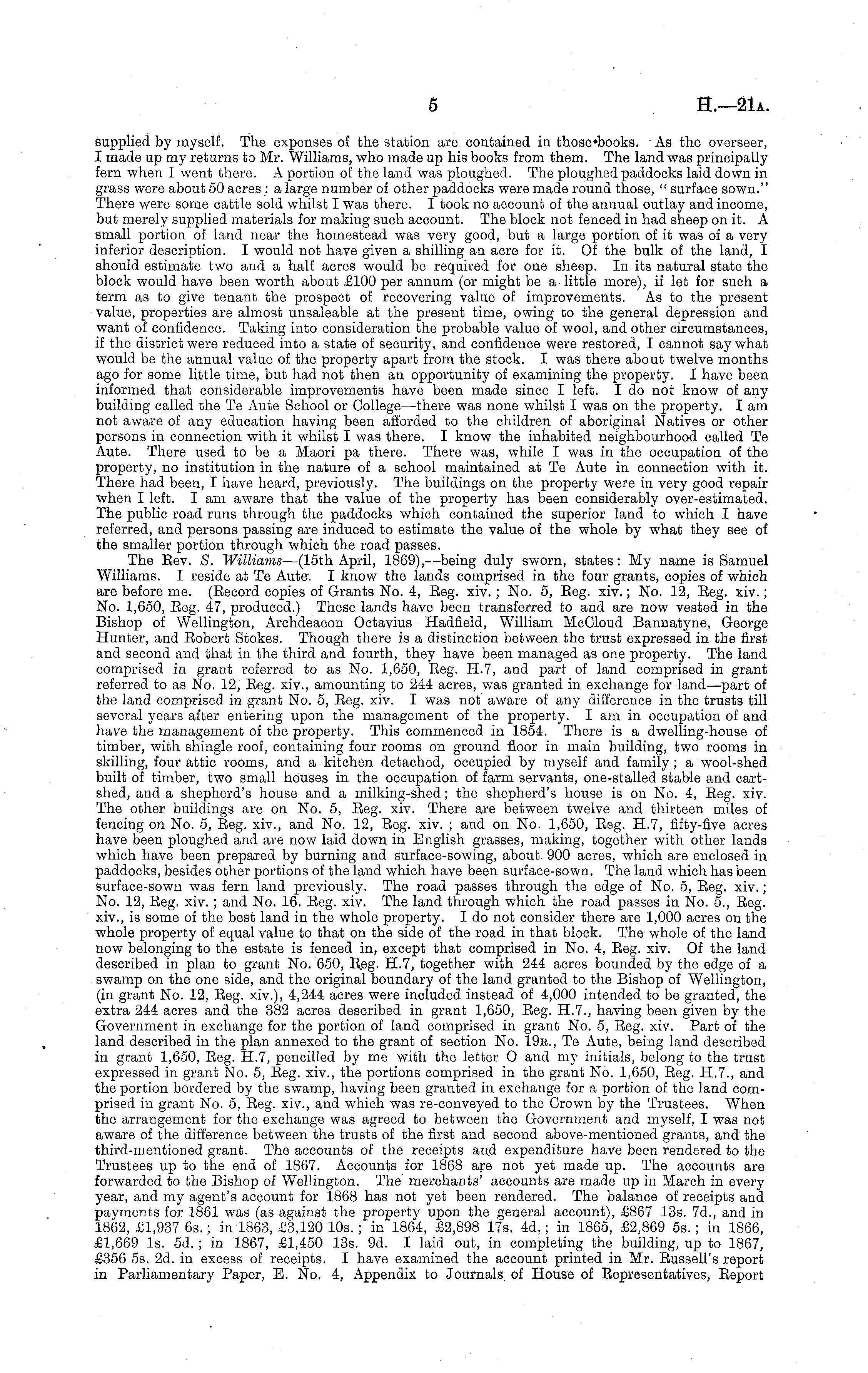 supplied by myself. The expenses of the station are contained in those*books. •As the overseer, I made up my returns to Mr. Williams, who made up his books from them. The land was principally fern when I went there. A portion of the land was ploughed. The ploughed paddocks laid down in grass were about 50 acres : a large number of other paddocks were made round those, " surface sown." There were some cattle sold whilst I was there. I took no account of the annual outlay and income, but merely supplied materials for making such account. The block not fenced in had sheep on it. A small portion of land near the homestead was very good, but a large portion of it was of a very inferior description. I would not have given a shilling an acre for it. Of the bulk of the land, I should estimate two and a half acres would be required for one sheep. In its natural state the block would have been worth about £100 per annum (or might be a little more), if let for such a term as to give tenant the prospect of recovering value of improvements. As to the present value, properties are almost unsaleable at the present time, owing to the general depression and want of confidence. Taking into consideration the probable value of wool, and other circumstances, if the district were reduced into a state of security, and confidence were restored, I cannot say what would be the annual value of the property apart from the stock. I was there about twelve months ago for some little time, but had not then an opportunity of examining the property. I have been informed that considerable improvements have been made since I left. Ido not know of any building called the Te Aute School or College—there was none whilst I was on the property. lam not aware of any education having been afforded to the children of aboriginal Natives or other persons in connection with it whilst I was there. I know the inhabited neighbourhood called Te Aute. There used to be a Maori pa there. There was, while I was in the occupation of the property, no institution in the nature of a school maintained at Te Aute in connection with it. There had been, I have heard, previously. The buildings on the property were in very good repair when I left. I am aware that the value of the property has been considerably over-estimated. The public road runs through the paddocks which contained the superior land to which I have referred, and persons passing are induced to estimate the value of the whole by what they see of the smaller portion through which the road passes. The Eev. S. Williams —(lsth April, 1869), —being duly sworn, states: My name is Samuel Williams. I reside at Te Aute. I know the lands comprised in the four grants, copies of which are before me. (Record copies of Grants No. 4, Eeg. xiv. ; No. 5, Eeg. xiv.; No. 12, Eeg. xiv.; No. 1,650, Eeg. 47, produced.) These lands have been transferred to and are now vested in the Bishop of Wellington, Archdeacon Octavius Hadfield, William McCloud Bannatyne, George Hunter, and Eobert Stokes. Though there is a distinction between the trust expressed in the first and second and that in the third and fourth, they have been managed as one property. The land comprised in grant referred to as No. 1,650, Eeg. H. 7, and part of land comprised in grant referred to as No. 12, Eeg. xiv., amounting to 244 acres, was granted in exchange for land—part of the land comprised in grant No. 5, Eeg. xiv. I was not aware of any difference in the trusts till several years after entering upon the management of the property. I am in occupation of and have the management of the property. This commenced in 1854. There is a dwelling-house of timber, with shingle roof, containing four rooms on ground floor in main building, two rooms in skilling, four attic rooms, and a kitchen detached, occupied by myself and family ; a wool-shed built of timber, two small houses in the occupation of farm servants, one-stalled stable and cartshed, and a shepherd's house and a milking-shed; the shepherd's house is on No. 4, Eeg. xiv. The other buildings are on No. 5, Eeg. xiv. There are between twelve and thirteen miles of fencing on No. 5, Eeg. xiv., and No. 12, Eeg. xiv. ; and on No. 1,650, Eeg. H. 7, fifty-five acres have been ploughed and are now laid down in English grasses, making, together with other lands which have been prepared by burning and surface-sowing, about. 900 acres, which are enclosed in paddocks, besides other portions of the land which have been surface-sown. The land which has been surface-sown was fern land previously. The road passes through the edge of No. 5, Reg. xiv.; No. 12, Eeg. xiv. ; and No. 16. Eeg. xiv. The land through which the road passes in No. 5., Eeg. xiv., is some of the best land in the whole property. Ido not consider there are 1,000 acres on the whole property of equal value to that on the side of the road in that block. The whole of the land now belonging to the estate is fenced in, except that comprised in No. 4, Eeg. xiv. Of the land described in plan to grant No. 650, Eeg. H. 7, together with 244 acres bounded by the edge of a swamp on the one side, and the original boundary of the land granted to the Bishop of Wellington, (in grant No. 12, Eeg. xiv.), 4,244 acres were included instead of 4,000 intended to be granted, the extra 244 acres and the 382 acres described in grant 1,650, Eeg. H. 7., having been given by the Government in exchange for the portion of land comprised in grant No. 5, Eeg. xiv. Part of the land described in the plan annexed to the grant of section No. 19b., Te Aute, being land described in grant 1,650, Reg. H. 7, pencilled by me with the letter O and my initials, belong to the trust expressed in grant No. 5, Eeg. xiv., the portions comprised in the grant No. 1,650, Eeg. H. 7., and the portion bordered by the swamp, having been granted in exchange for a portion of the land comprised in grant No. 5, Reg. xiv., and which was re-conveyed to the Grown by the Trustees. When the 