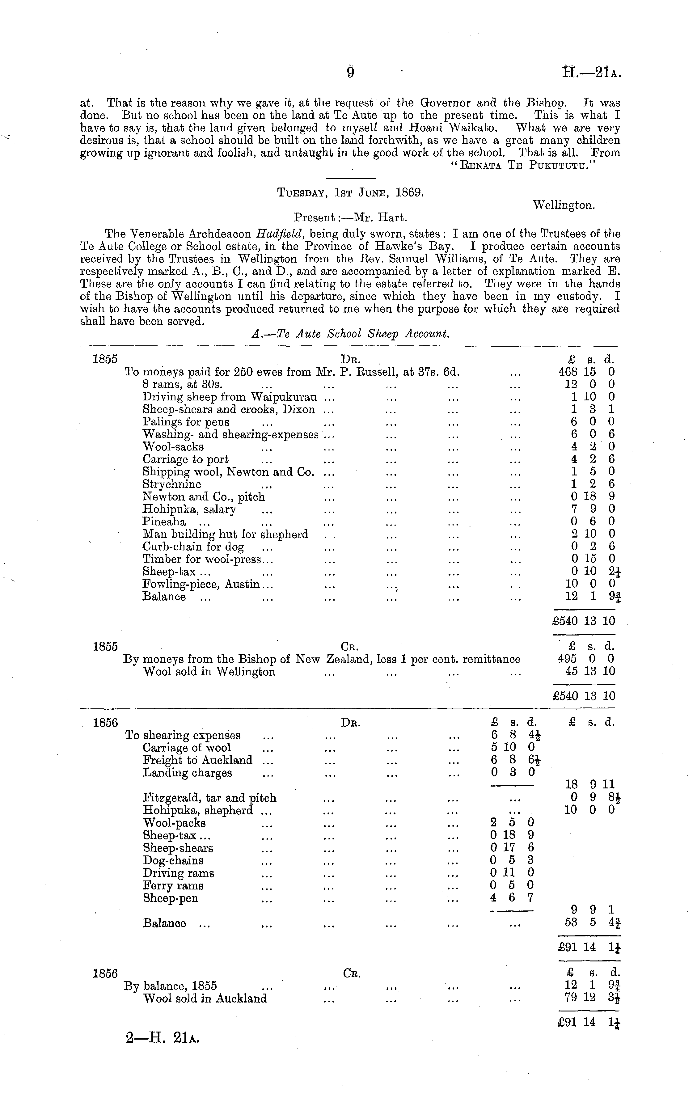 Tuesday, Ist June, 1869. Wellington. Present:—Mr. Hart. The Venerable Archdeacon Hadfield, being duly sworn, states : I am one of the Trustees of the Te Aute College or School estate, in the Province of Hawke's Bay. I produce certain accounts received by the Trustees in Wellington from the Rev. Samuel Williams, of Te Aute. They are respectively marked A., 8., C, and D., and are accompanied by a letter of explanation marked E. These are the only accounts I can find relating to the estate referred to. They were in the hands of the Bishop of Wellington until his departure, since which they have been in my custody. I wish to have the accounts produced returned to me when the purpose for which they are required shall have been served. A. — Te Aute School Sheep Account.