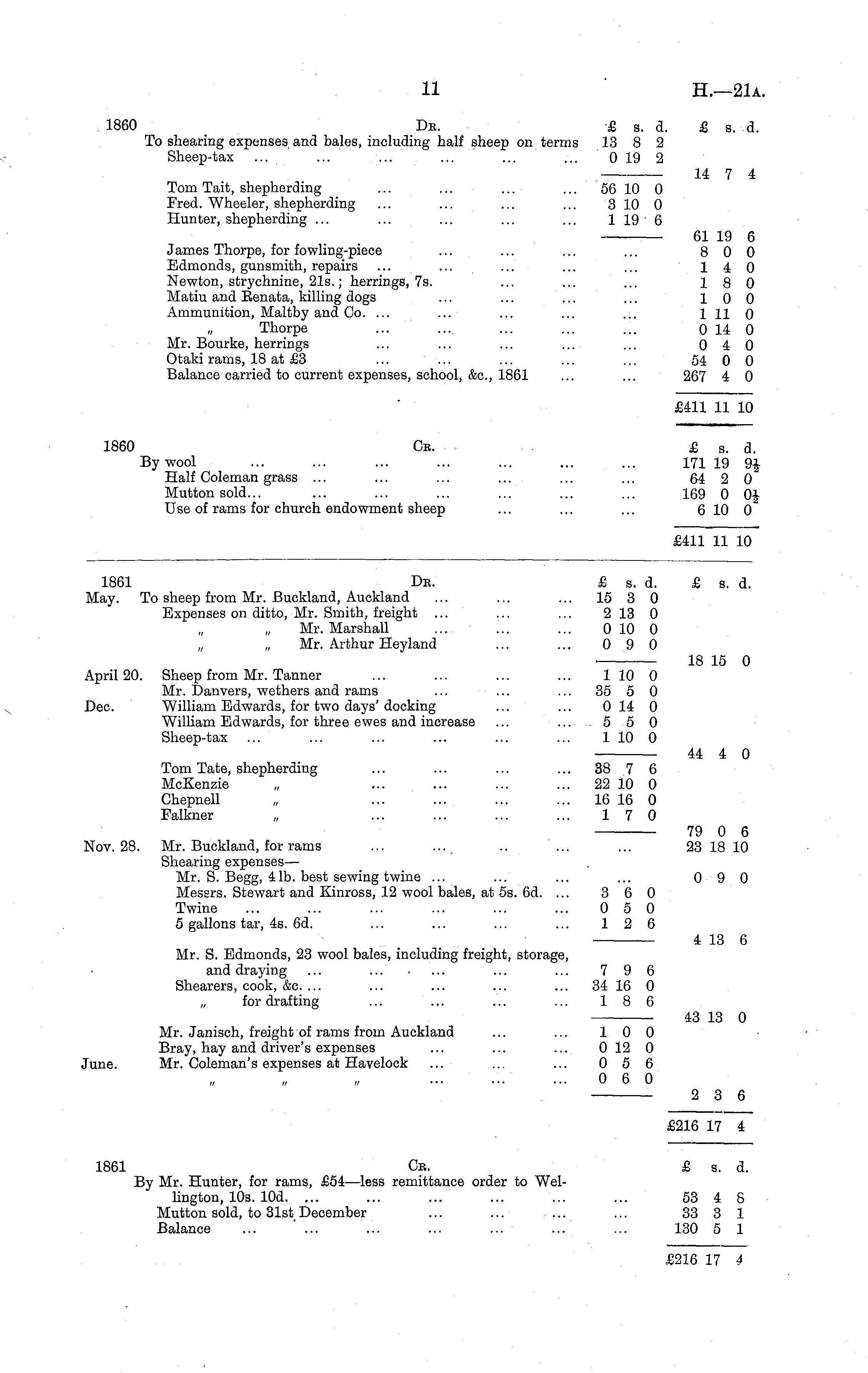 1860 Dr. £ s. d. £ s. d. To shearing expenses and bales, including half sheep on terms 13 8 2 Sheep-tax ... ... ... ... ... ... 019 2 14 7 4 Tom Tait, shepherding ... ... ... ... 56 10 0 Fred. Wheeler, shepherding ... ... ... ... 310 0 Hunter, shepherding ... ... ... ... ... 1 19 6 61 19 6 James Thorpe, for fowling-piece ... ... ... ... 800 Edmonds, gunsmith, repairs ... ... ... ... ... 140 Newton, strychnine, 215.; herrings, 7s. ... ... ... 180 Matiu and Eenata, killing dogs ... ... ... ... 100 Ammunition, Maltby and Co. ... ... ... ... ... 1 11 0 „ Thorpe ... .... ... ... ... 0 14 0 Mr. Bourke, herrings ... ... ... ... ... 040 Otaki rams, 18 at £3 ... ... ... ... ... 54 0 0 Balance carried to current expenses, school, &c, 1861 ... ... 267 4 0 £411 11 10 1860 Cr. £ s. d. By wool ... ... ... ... ... ... ... 17119 9f Half Coleman grass ... ... ... ... ... ... 64 2 0 Mutton 501 d... ... ... ... ... ... ... 169 0 0J Use of rams for church endowment sheep ... ... ... 6 10 0 £411 11 10