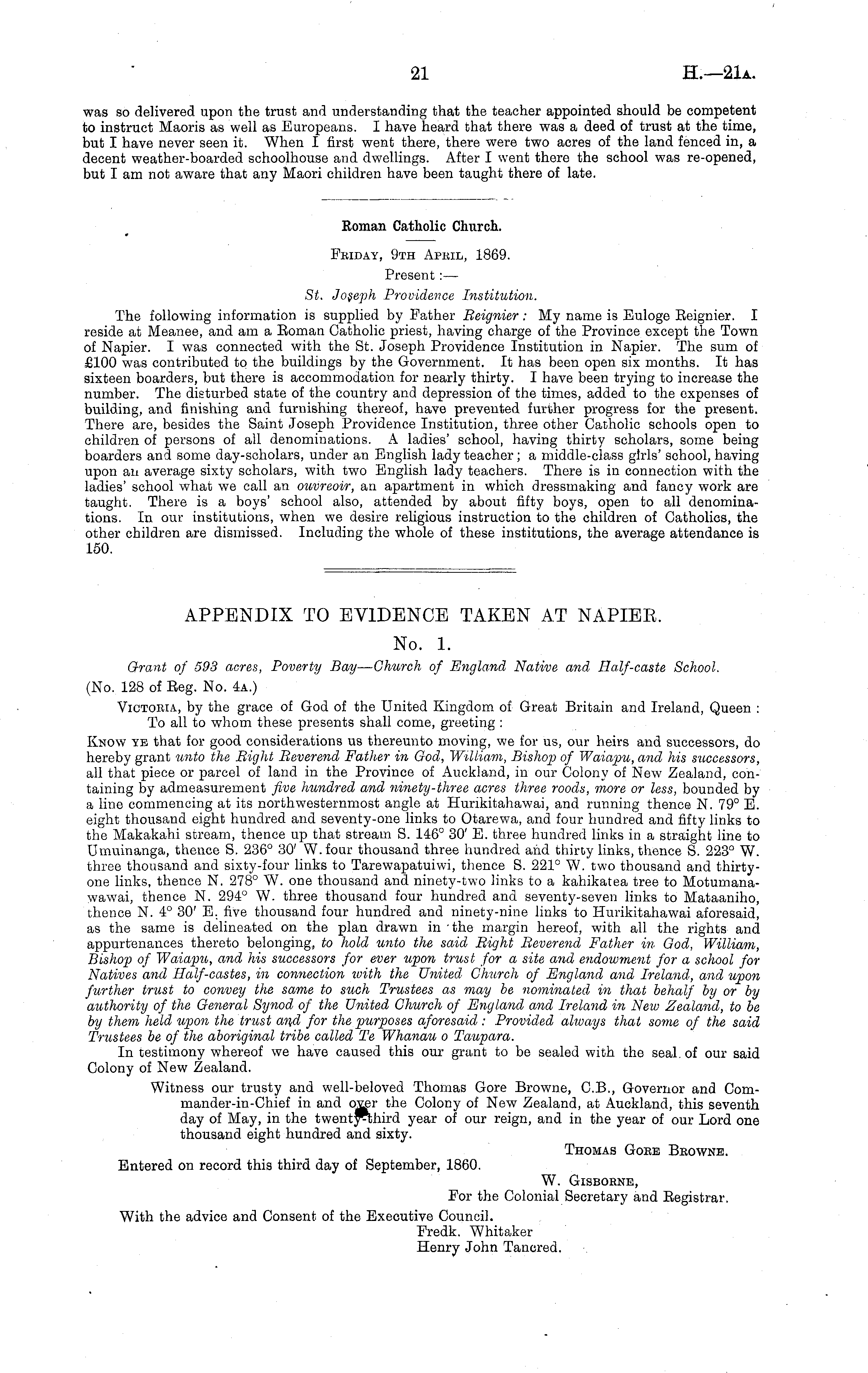 Roman Catholic Church. Friday, 9th April, 1869. Present :— St. Joseph Providence Institution. The following information is supplied by Father Beignier: My name is Euloge Reignier. I reside at Meanee, and am a Roman Catholic priest, having charge of the Province except the Town of Napier. I was connected with the St. Joseph Providence Institution in Napier. The sum of £100 was contributed to the buildings by the Government. It has been open six months. It has sixteen boarders, but there is accommodation for nearly thirty. I have been trying to increase the number. The disturbed state of the country and depression of the times, added to the expenses of building, and finishing and furnishing thereof, have prevented further progress for the present. There are, besides the Saint Joseph Providence Institution, three other Catholic schools open to children of persons of all denominations. A ladies' school, having thirty scholars, some being boarders and some day-scholars, under an English lady teacher; a middle-class girls' school, having upon an average sixty scholars, with two English lady teachers. There is in connection with the ladies' school what we call an ouvreoir, an apartment in which dressmaking and fancy work are taught. There is a boys' school also, attended by about fifty boys, open to all denominations. In our institutions, when we desire religious instruction to the children of Catholics, the other children are dismissed. Including the whole of these institutions, the average attendance is 150.