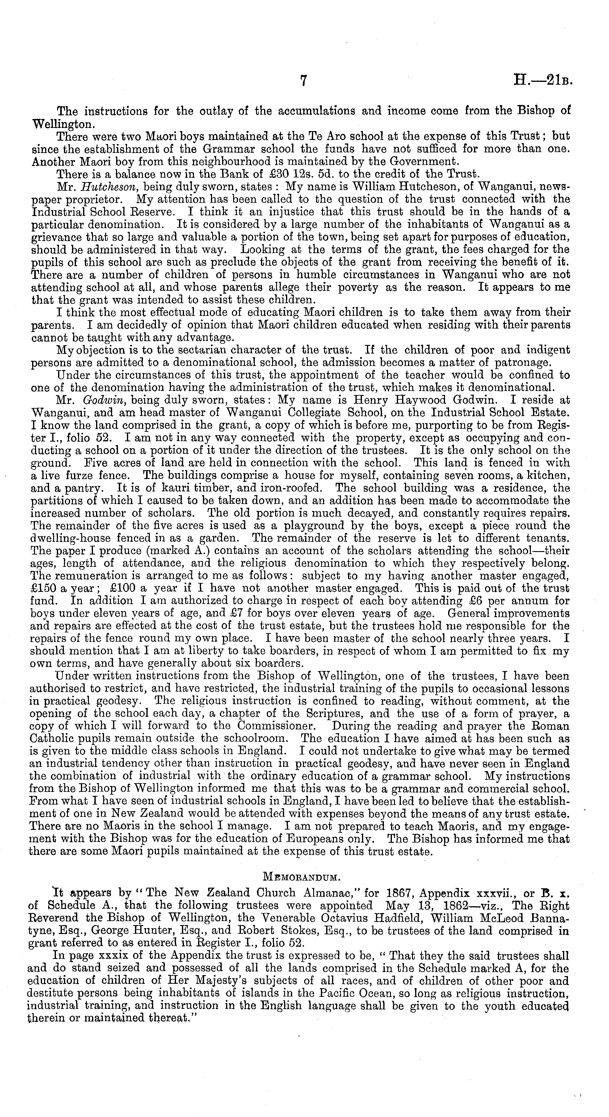 The instructions for the outlay of the accumulations and income come from the Bishop of Wellington. There were two Maori boys maintained at the Te Aro school at the expense of this Trust; but since the establishment of the Grammar school the funds have not sufficed for more than one. Another Maori boy from this neighbourhood is maintained by the Government. There is a balance now in the Bank of £30 12s. sd. to the credit of the Trust. Mr. Hutcheson, being duly sworn, states : My name is William Hutcheson, of Wanganui, newspaper proprietor. My attention has been called to the question of the trust connected with the Industrial School Eeserve. I think it an injustice that this trust should be in the hands of a particular denomination. It is considered by a large number of the inhabitants of Wanganui as a grievance that so large and valuable a portion of the town, being set apart for purposes of education, should be administered in that way. Looking at the terms of the grant, the fees charged for the pupils of this school are such as preclude the objects of the grant from receiving the benefit of it. There are a number of children of persons in humble circumstances in Wanganui who are not attending school at all, and whose parents allege their poverty as the reason. It appears to me that the grant was intended to assist these children. I think the most effectual mode of educating Maori children is to take them away from their parents. lam decidedly of opinion that Maori children educated when residing with their parents cannot be taught with any advantage. My objection is to the sectarian character of the trust. If the children of poor and indigent persons are admitted to a denominational school, the admission becomes a matter of patrona.ge. Under the circumstances of this trust, the appointment of the teacher would be confined to one of the denomination having the administration of the trust, which makes it denominational. Mr. Godwin, being duly sworn, states: My name is Henry Haywood Godwin. I reside at Wanganui, and am head master of Wanganui Collegiate School, on the Industrial School Estate. I know the land comprised in the grant, a copy of which is before me, purporting to be from Begister 1., folio 52. lam not in any way connected with the property, except as occupying and conducting a school on a portion of it under the direction of the trustees. It is the only school on the ground. Five acres of land are held in connection with the school. This land is fenced in with a live furze fence. The buildings comprise a house for myself, containing seven rooms, a kitchen, and a pantry. It is of kauri timber, and iron-roofed. The school building was a residence, the partitions of which I caused to be taken down, and an addition has been made to accommodate the increased number of scholars. The old portion is much decayed, and constantly requires repairs. The remainder of the five acres is used as a playground by the boys, except a piece round the dwelling-house fenced in as a garden. The remainder of the reserve is let to different tenants. The paper I produce (marked A.) contains an account of the scholars attending the school—their ages, length of attendance, and the religious denomination to which they respectively belong. The remuneration is arranged to me as follows: subject to my having another master engaged, £150 a year; £100 a year if I have not another master engaged. This is paid out of the trust fund. In addition lam authorized to charge in respect of each boy attending £6 per annum for boys under eleven years of age, and £7 for boys over eleven years of age. General improvements and repairs are effected at the cost of the trust estate, but the trustees hold me responsible for the repairs of the fence round my own place. I have been master of the school nearly three years. I should mention that I am at liberty to take boarders, in respect of whom I am permitted to fix my own terms, and have generally about six boarders. Under written instructions from the Bishop of Wellington, one of the trustees, I have been authorised to restrict, and have restricted, the industrial training of the pupils to occasional lessons in practical geodesy. The religious instruction is confined to reading, without comment, at the opening of the school each day, a chapter of the Scriptures, and the use of a form of prayer, a copy of which I will forward to the Commissioner. During the reading and prayer the Eoman Catholic pupils remain outside the schoolroom. The education I have aimed at has been such as is given to the middle class schools in England. I could not undertake to give what may be termed an industrial tendency other than instruction in practical geodesy, and have never seen in England the combination of industrial with the ordinary education of a grammar school. My instructions from the Bishop of Wellington informed me that this was to be a grammar and commercial school. From what I have seen of industrial schools in England, I have been led to believe that the establishment of one in New Zealand would be attended with expenses beyond the means of any trust estate. There are no Maoris in the school I manage. lam not prepared to teach Maoris, and my engagement with the Bishop was for the education of Europeans only. The Bishop has informed me that there are some Maori pupils maintained at the expense of this trust estate. Memoeandum. It appears by " The New Zealand Church Almanac," for 1867, Appendix xxxvii., or B. x. of Schedule A., that the following trustees were appointed May 13, 1862 —viz., The Eight Eeverend the Bishop of Wellington, the Venerable Octavius Hadfield, William McLeod Bannatyne, Esq., George Hunter, Esq., and Eobert Stokes, Esq., to be trustees of the land comprised in grant referred to as entered in Eegister 1., folio 52. In page xxxix of the Appendix the trust is expressed to be, " That they the said trustees shall and do stand seized and possessed of all the la