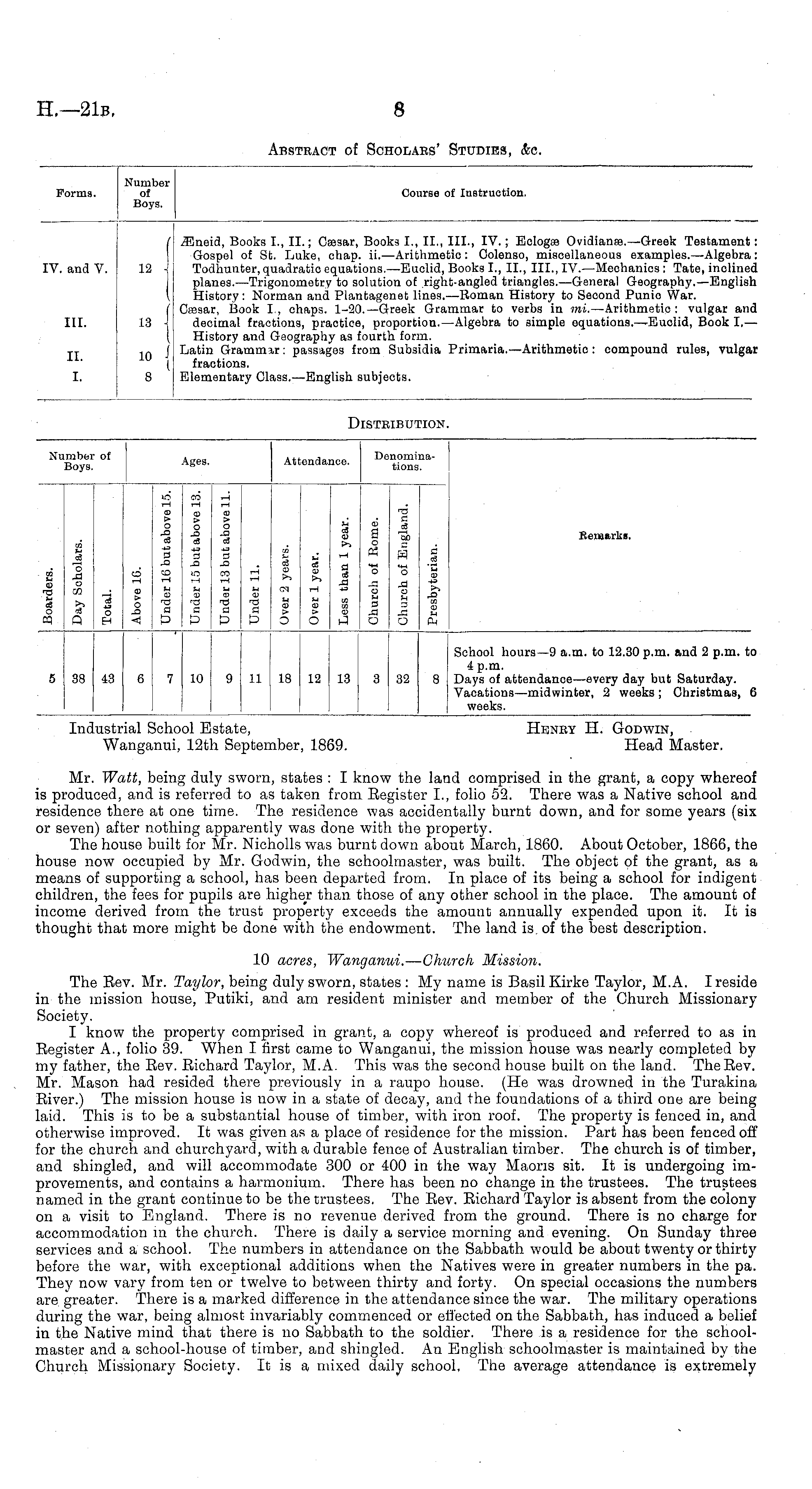 Industrial School Estate, Henry H. Godwin, Wanganui, 12th September, 1869. Head Master. Mr. Watt, being duly sworn, states : I know the land comprised in the grant, a copy whereof is produced, and is referred to as taken from Eegister 1., folio 52. There was a Native school and residence there at one time. The residence was accidentally burnt down, and for some years (six or seven) after nothing apparently was done with the property. The house built for Mr. Nicholls was burnt down about March, 1860. About October, 1866, the house now occupied by Mr. Godwin, the schoolmaster, was built. The object of the grant, as a means of supporting a school, has been departed from. In place of its being a school for indigent children, the fees for pupils are higher than those of any other school in the place. The amount of income derived from the trust property exceeds the amount annually expended upon it. It is thought that more might be done with the endowment. The land is, of the best description. 10 acres, Wanganui. — Church Mission. The Eev. Mr. Taylor, being duly sworn, states :My name is Basil Kirke Taylor, M.A. I reside in the mission house, Putiki, and am resident minister and member of the Church Missionary Society. I know the property comprised in grant, a copy whereof is produced and referred to as in Register A., folio 39. When I first came to Wanganui, the mission house was nearly completed by my father, the Eev. Richard Taylor, M.A. This was the second house built on the land. The Eev. Mr. Mason had resided there previously in a raupo house. (He was drowned in the Turakina River.) The mission house is now in a state of decay, and the foundations of a third one are being laid. This is to be a substantial house of timber, with iron roof. The property is fenced in, and otherwise improved. It was given as a place of residence for the mission. Part has been fenced off for the church and churchyard, with a durable fence of Australian timber. The church is of timber, and shingled, and will accommodate 300 or 400 in the way Maoris sit. It is undergoing improvements, and contains a harmonium. There has been no change in the trustees. The trustees named in the grant continue to be the trustees. The Eev. Richard Taylor is absent from the colony on a visit to England. There is no revenue derived from the ground. There is no charge for accommodation in the church. There is daily a service morning and evening. On Sunday three services and a school. The numbers in attendance on the Sabbath would be about twenty or thirty before the war, with exceptional additions when the Natives were in greater numbers in the pa. They now vary from ten or twelve to between thirty and forty. On special occasions the numbers are greater. There is a marked difference in the attendance since the war. The military operations during the war, being almost invariably commenced or effected on the Sabbath, has induced a belief in the Native mind that there is no Sabbath to the soldier. There is a residence for the schoolmaster and a school-house of timber, and shingled. An English schoolmaster is maintained by the Church Missionary Society. It is a mixed daily school. The average attendance is extremely