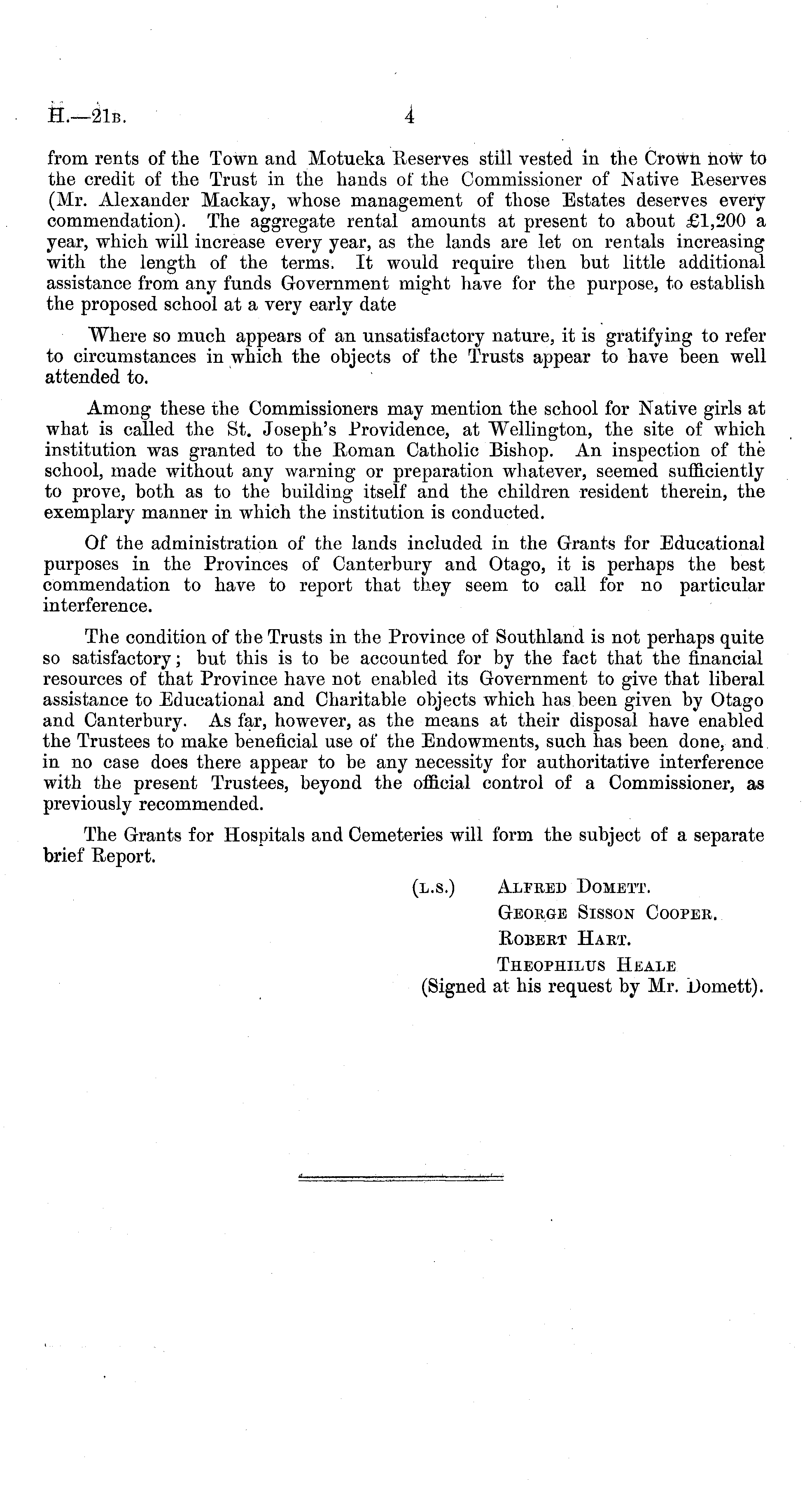 from rents of the Town and Motueka Reserves still vested in the Crown now to the credit of the Trust in the hands of the Commissioner of Native Reserves (Mr. Alexander Mackay, whose management of those Estates deserves every commendation). The aggregate rental amounts at present to about £1,200 a year, which will increase every year, as the lands are let on rentals increasing with the length of the terms, It would require then but little additional assistance from any funds Government might have for the purpose, to establish the proposed school at a very early date Where so much appears of an unsatisfactory nature, it is gratifying to refer to circumstances in which the objects of the Trusts appear to have been well attended to. Among these the Commissioners may mention the school for Native girls at what is called the St. Joseph's Providence, at Wellington, the site of which institution was granted to the Roman Catholic Bishop. An inspection of the school, made without any warning or preparation whatever, seemed sufficiently to prove, both as to the building itself and the children resident therein, the exemplary manner in which the institution is conducted. Of the administration of the lands included in the Grants for Educational purposes in the Provinces of Canterbury and Otago, it is perhaps the best commendation to have to report that they seem to call for no particular interference. The condition of the Trusts in the Province of Southland is not perhaps quite so satisfactory; but this is to be accounted for by the fact that the financial resources of that Province have not enabled its Government to give that liberal assistance to Educational and Charitable objects which has been given by Otago and Canterbury. As far, however, as the means at their disposal have enabled the Trustees to make beneficial use of the Endowments, such has been done, and in no case does there appear to be any necessity for authoritative interference with the present Trustees, beyond the official control of a Commissioner, as previously recommended. The Grants for Hospitals and Cemeteries will form the subject of a separate brief Report. (1.5.) Alfred Domett. George Sisson Cooper. Robert Hart. Theophiltjs Heale (Signed at his request by Mr. Domett).