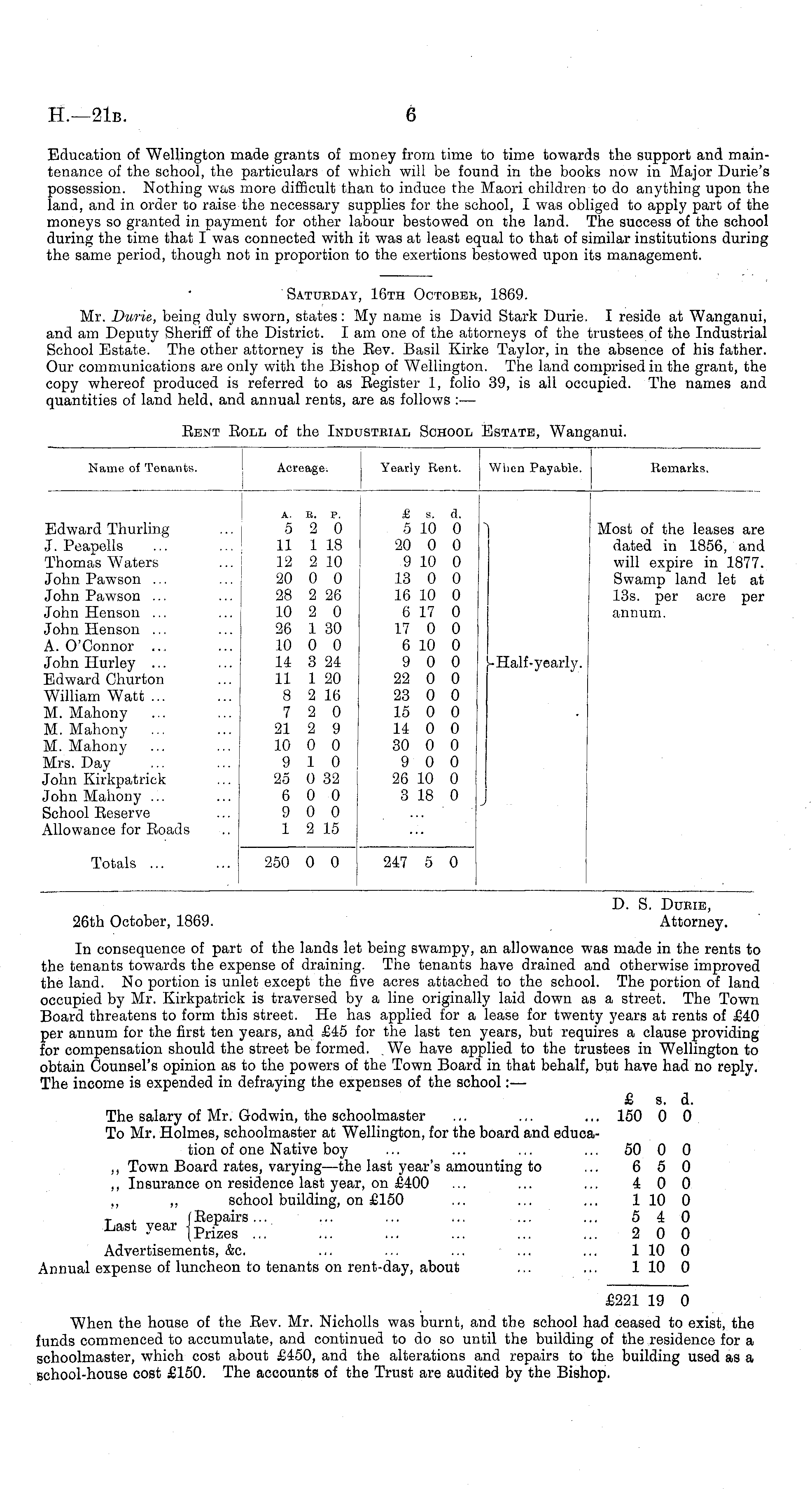 ' Saturday, 16th Octobek, 1869. Mr. Durie, being duly sworn, states: My name is David Stark Durie. I reside at Wanganui, and am Deputy Sheriff of the District. lam one of the attorneys of the trustees of the Industrial School Estate. The other attorney is the Eev. Basil Kirke Taylor, in the absence of his father. Our communications are only with the Bishop of Wellington. The land comprised in the grant, the copy whereof produced is referred to as Eegister 1, folio 39, is all occupied. The names and quantities of land held, and annual rents, are as follows : —