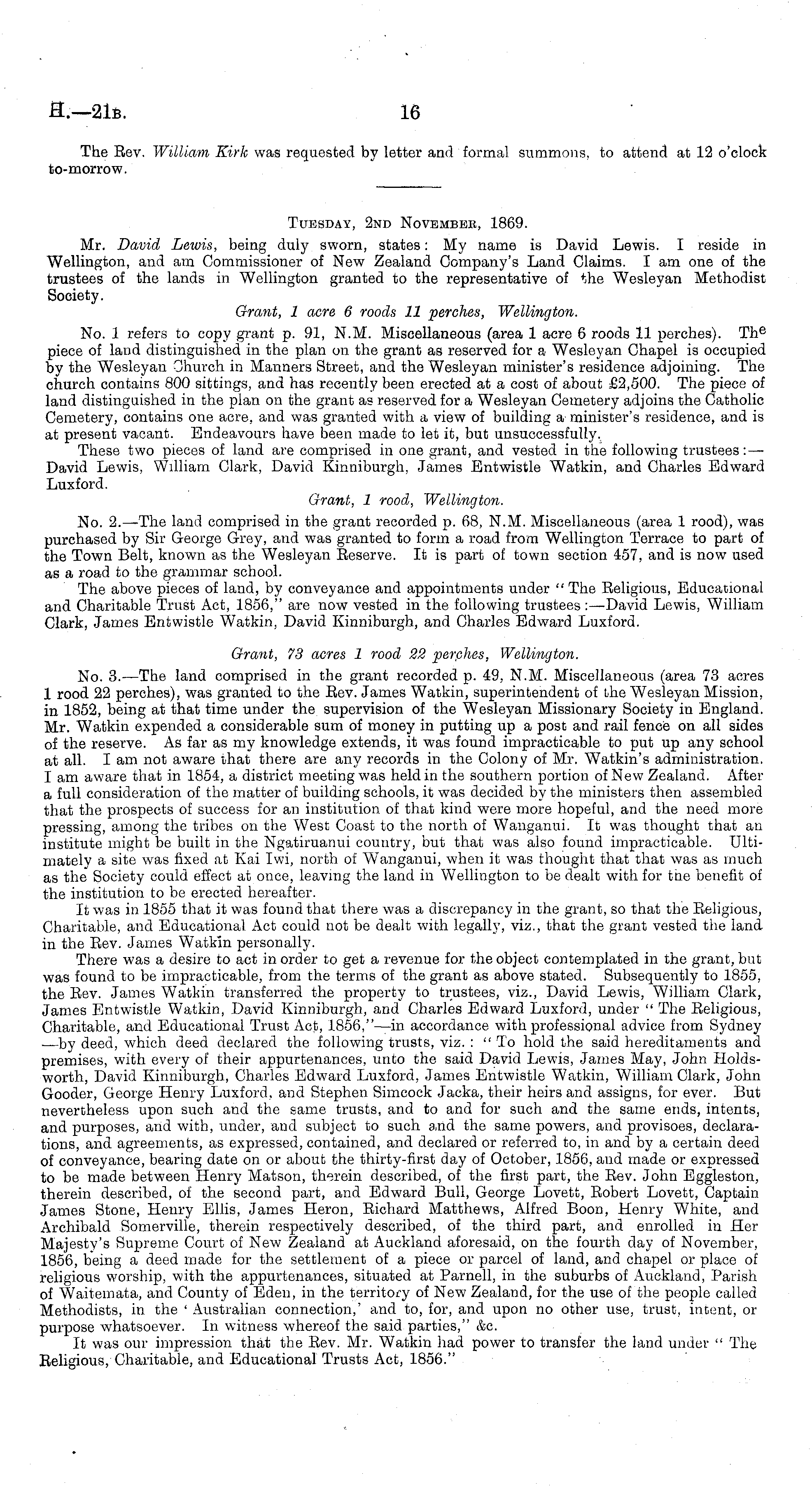 Tuesday, 2nd November, 1869. Mr. David Lewis, being duly sworn, states: My name is David Lewis. I reside in Wellington, and am Commissioner of New Zealand Company's Land Claims. I am one of the trustees of the lands in Wellington granted to the representative of the Wesleyan Methodist Society. Grant, 1 acre 6 roods 11 perches, Wellington. No. 1 refers to copy grant p. 91, N.M. Miscellaneous (area 1 acre 6 roods 11 perches). Th c piece of land distinguished in the plan on the grant as reserved for a Wesleyan Chapel is occupied by the Wesleyan Church in Manners Street, and the Wesleyan minister's residence adjoining. The church contains 800 sittings, and has recently been erected at a cost of about £2,500. The piece of land distinguished in the plan on the grant as reserved for a Wesleyan Cemetery adjoins the Catholic Cemetery, contains one acre, and was granted with a view of building a minister's residence, and is at present vacant. Endeavours have been made to let it, but unsuccessfully. These two pieces of land are comprised in one grant, and vested in the following trustees: — David Lewis, William Clark, David Kinniburgh, James Entwistle Watkin, and Charles Edward Luxford. Grant, 1 rood, Wellington. No. 2.—The land comprised in the grant recorded p. 68, N.M. Miscellaneous (area 1 rood), was purchased by Sir George Grey, and was granted to form a road from Wellington Terrace to part of the Town Belt, known as the Wesleyan Eeserve. It is part of town section 457, and is now used as a road to the grammar school. The above pieces of land, by conveyance and appointments under " The Beligious, Educational and Charitable Trust Act, 1856," are now vested in the following trustees: —David Lewis, William Clark, James Entwistle Watkin, David Kinniburgh, and Charles Edward Luxford. Grant, 73 acres 1 rood 22 perches, Wellington. No. 3. —The land comprised in the grant recorded p. 49, N.M. Miscellaneous (area 73 acres 1 rood 22 perches), was granted to the Eev. James Watkin, superintendent of the Wesleyan Mission, in 1852, being at that time under the supervision of the Wesleyan Missionary Society in England. Mr. Watkin expended a considerable sum of money in putting up a post and rail fence on all sides of the reserve. As far as my knowledge extends, it was found impracticable to put up any school at all. lam not aware that there are any records in the Colony of Mr. Watkin's administration. lam aware that in 1854, a district meeting was held in the southern portion of New Zealand. After a full consideration of the matter of building schools, it was decided by the ministers then assembled that the prospects of success for an institution of that kind were more hopeful, and the need more pressing, among the tribes on the West Coast to the north of Wanganui. It was thought that an institute might be built in the Ngatiruanui country, but that was also found impracticable. Ultimately a site was fixed at Kai Iwi, north of Wanganui, when it was thought that that was as much as the Society could effect at once, leaving the land in Wellington to be dealt with for the benefit of the institution to be erected hereafter. It was in 1855 that it was found that there was a discrepancy in the grant, so that the Eeligious, Charitable, and Educational Act could not be dealt with legally, viz., that the grant vested the land in the Eev. James Watkin personally. There was a desire to act in order to get a revenue for the object contemplated in the grant, but was found to be impracticable, from the terms of the grant as above stated. Subsequently to 1855, the Eev. James Watkin transferred the property to trustees, viz., David Lewis, William Clark, James Entwistle Watkin, David Kinniburgh, and Charles Edward Luxford, under " The Eeligious, Charitable, and Educational Trust Act, 1856," —in accordance with professional advice from Sydney —by deed, which deed declared the following trusts, viz. :" To hold the said hereditaments and. premises, with every of their appurtenances, unto the said David Lewis, James May, John Holdsworth, David Kinniburgh, Charles Edward Luxford, James Entwistle Watkin, William Clark, John Gooder, George Henry Luxford, and Stephen Simcock Jacka, their heirs and assigns, for ever. But nevertheless upon such and the same trusts, and to and for such and the same ends, intents, and purposes, and with, under, and subject to such and the same powers, and provisoes, declarations, and agreements, as expressed, contained, and declared or referred to, in and by a certain deed of conveyance, bearing date on or about the thirty-first day of October, 1856, and made or expressed to be made between Henry Matson, therein described, of the first part, the Eev. John Eggleston, therein described, of the second part, and Edward Bull, George Lovett, Eobert Lovett, Captain James Stone, Henry Ellis, James Heron, Eichard Matthews, Alfred Boon, Henry White, and Archibald Somerville, therein respectively described, of the third part, and enrolled in Her Majesty's Supreme Court of New Zealand at Auckland aforesaid, on the fourth day of November, 1856, being a deed made for the settlement of a piece or parcel of land, and chapel or place of religious worship, with the appurtenances, situated at Parnell, in the suburbs of Auckland, Parish of Waitemata, and County of Eden, in the territory of New Zealand, for the use of the people called Methodists, in the ' Australian connection,' and to, for, and upon no other use, trust, intent, or purpose whatsoever. In witness whereof the said parties," &c. It was our impression that the Eev. Mr. Watkin had power to transfer the land under " The Religious, Charitable, and Educational Trusts Act, 1856."