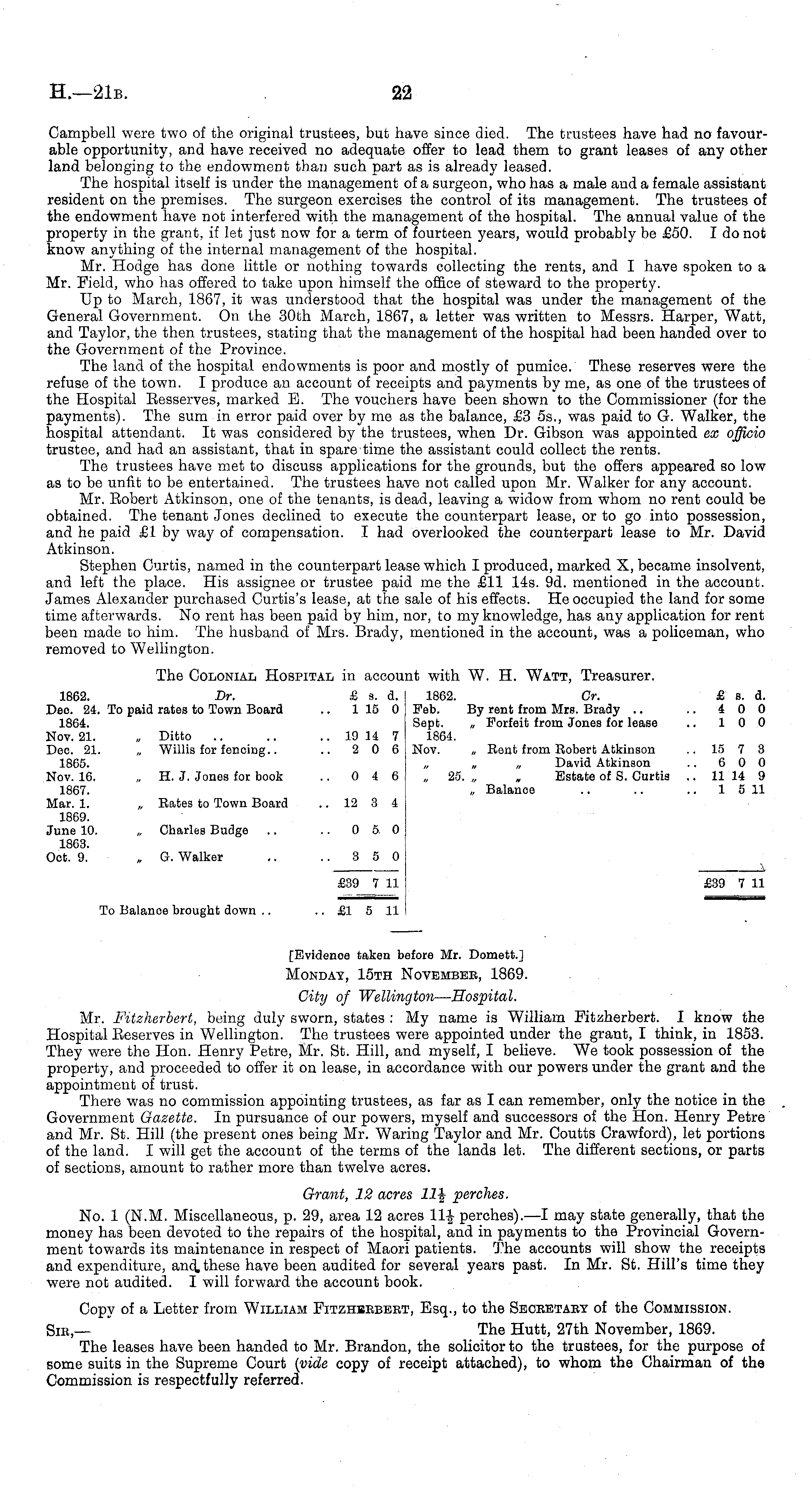 [Evidence taken before Mr. Domett.] Monday, 15th Novbmbee, 1869. City of Wellington — Hospital. Mr. Fitzherbert, being duly sworn, states :My name is William Fitzherbert. I know the Hospital Eeserves in Wellington. The trustees were appointed under the grant, I think, in 1853. They were the Hon. Henry Petre, Mr. St. Hill, and myself, I believe. We took possession of the property, and proceeded to offer it on lease, in accordance with our powers under the grant and the appointment of trust. There was no commission appointing trustees, as far as I can remember, only the notice in the Government Gazette. In pursuance of our powers, myself and successors of the Hon. Henry Petre and Mr. St. Hill (the present ones being Mr. Waring Taylor and Mr. Coutts Crawford), let portions of the land. I will get the account of the terms of the lands let. The different sections, or parts of sections, amount to rather more than twelve acres. Grant, 12 acres 12J perches. No. 1 (N.M. Miscellaneous, p. 29, area 12 acres 11J perches).—l may state generally, that the money has been devoted to the repairs of the hospital, and in payments to the Provincial Government towards its maintenance in respect of Maori patients. The accounts will show the receipts and expenditure, and,these have been audited for several years past. In Mr. St. Hill's time they were not audited. I will forward the account book. Copy of a Letter from William Fitzheebebt, Esq., to the Secebtaey of the Commission. Sic,— The Hutt, 27th November, 1869. The leases have been handed to Mr. Brandon, the solicitor to the trustees, for the purpose of some suits in the Supreme Court (vide copy of receipt attached), to whom the Chairman of the Commission is respectfully referred.